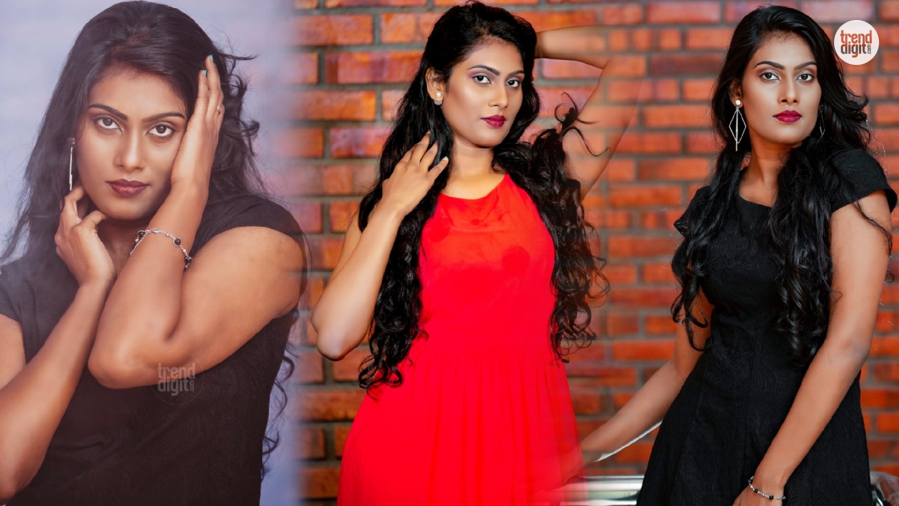 Canadian Tamil model Amizhthini Nakkeeran appears in a red mini dress and black casual outfits styled with minimal accessories in a modern fashion photoshoot.