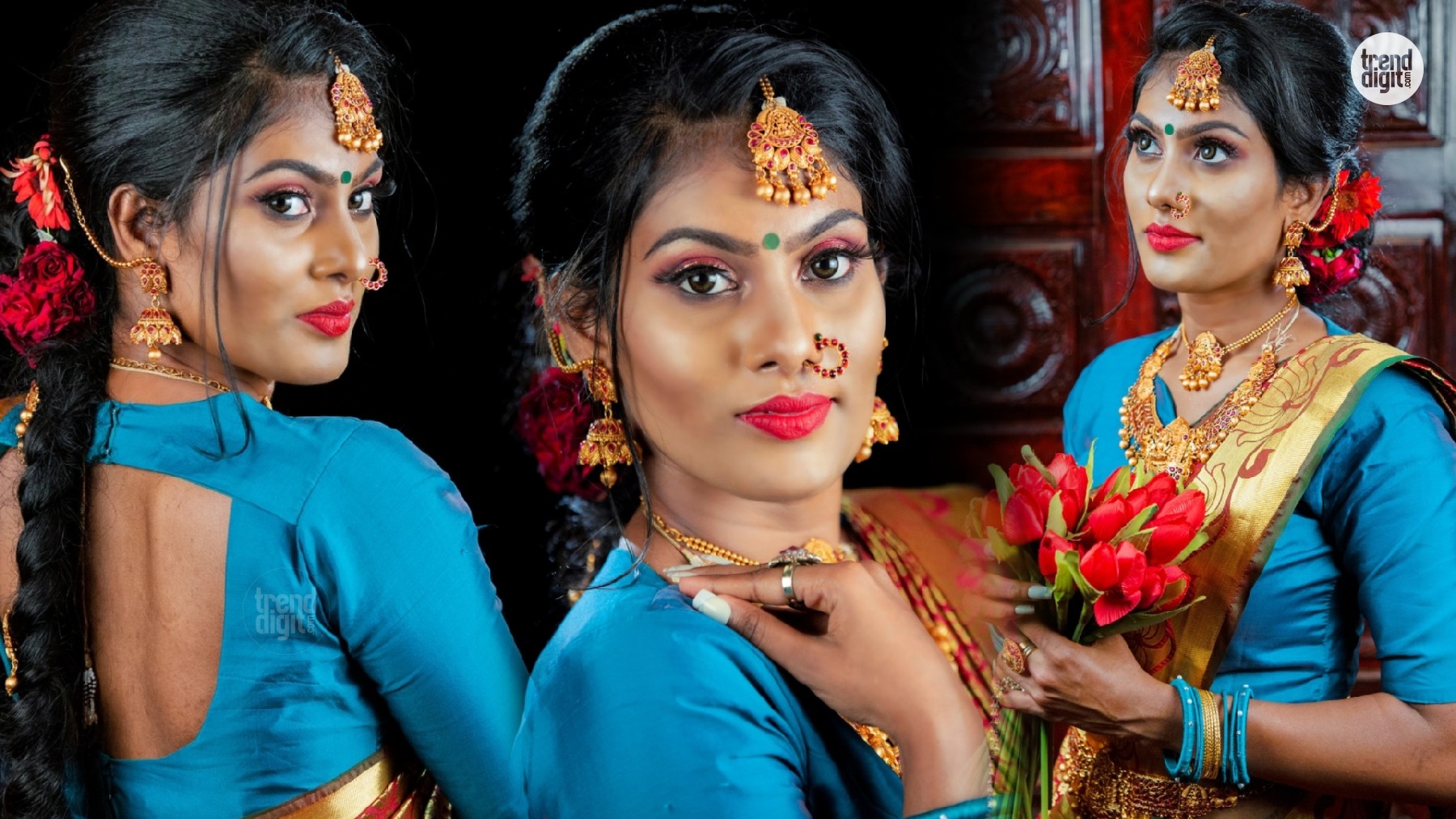 Canadian Tamil model Amizhthini Nakkeeran appears in a red silk saree styled with classic gold jewellery in a traditional bridal-inspired photoshoot.