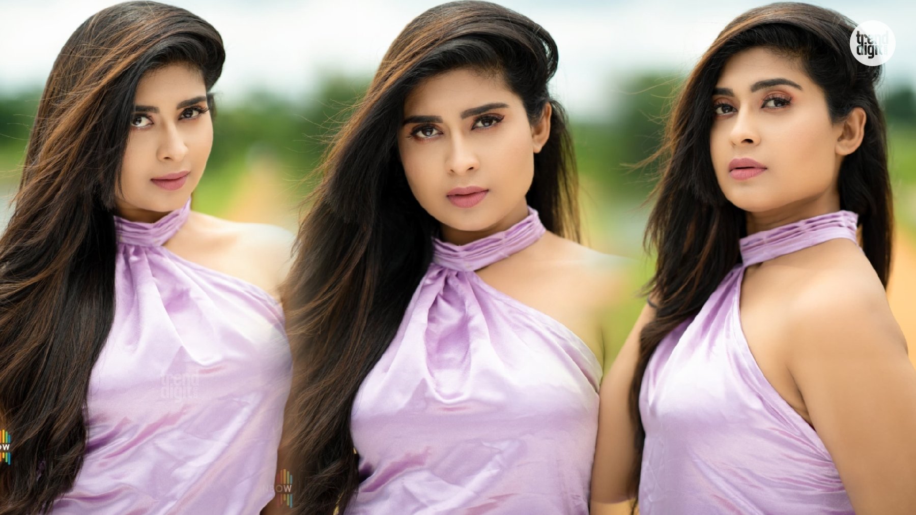 Akshitha Bopaiah features in a lavender satin halter dress, captured outdoors with natural light that enhances the soft sheen and fluid silhouette.
