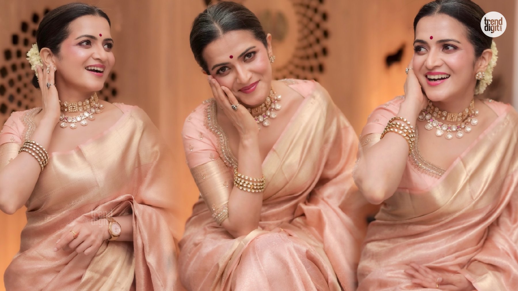 Dhivyadharshini shines in a peach silk saree, styled with classic jewellery and soft glam makeup, creating a refined traditional look with timeless visual appeal.