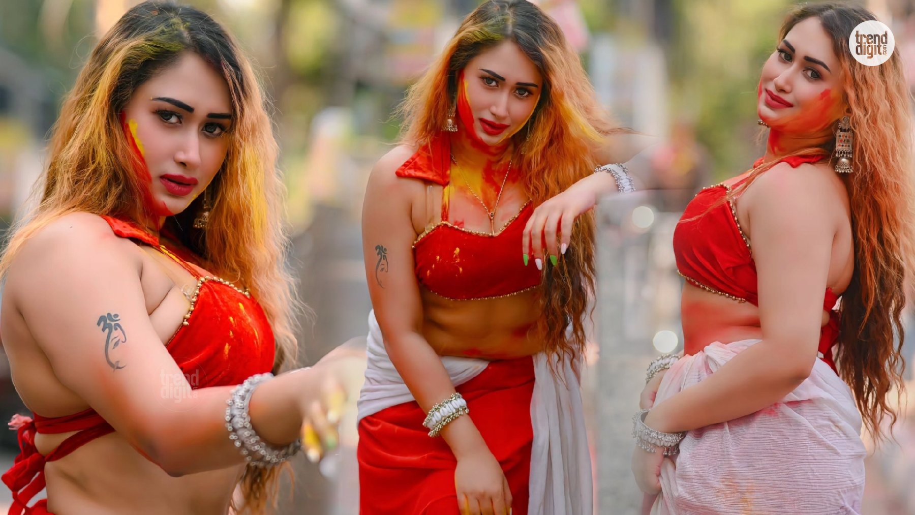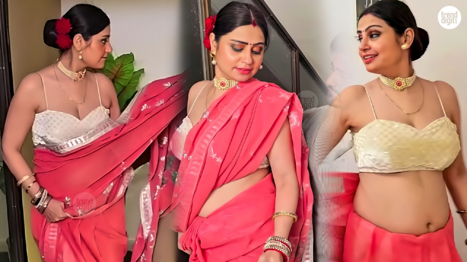 Priyanka Barnitta styles a red blouse with a white saree, paired with festive colors and bold makeup, creating a striking street-style photoshoot look.