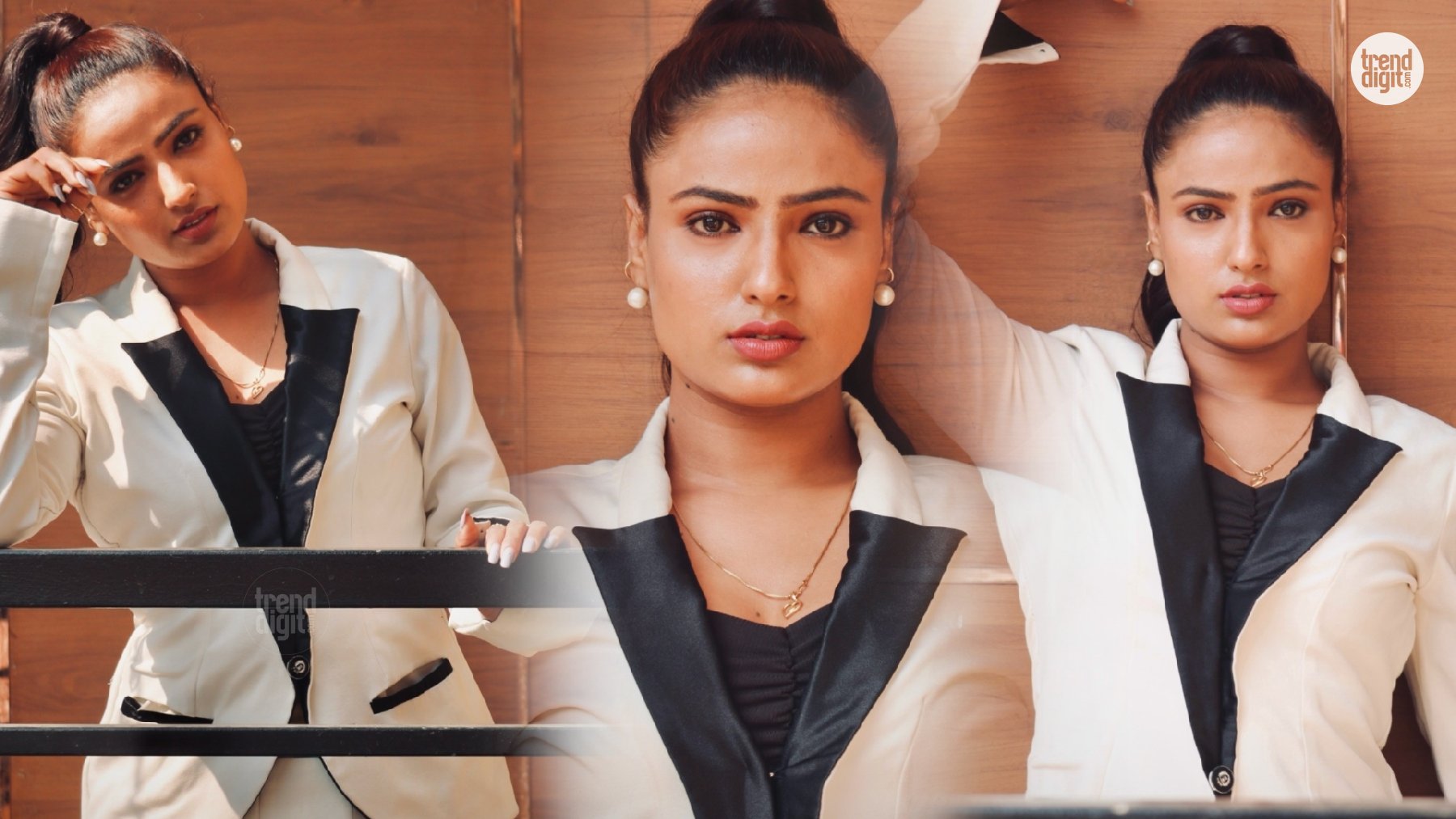 Shyna Khatri showcases a white blazer set with sharp tailoring and minimal styling, creating a clean and modern monochrome look in this outdoor photoshoot.