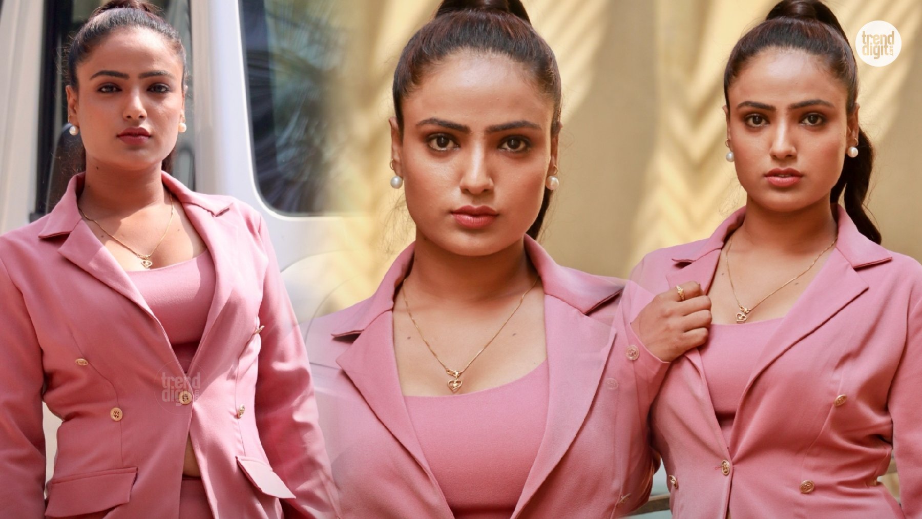Shyna Khatri appears in a pink blazer set, styled with minimal accessories and clean makeup, presenting a sharp and modern fashion-forward photoshoot look.