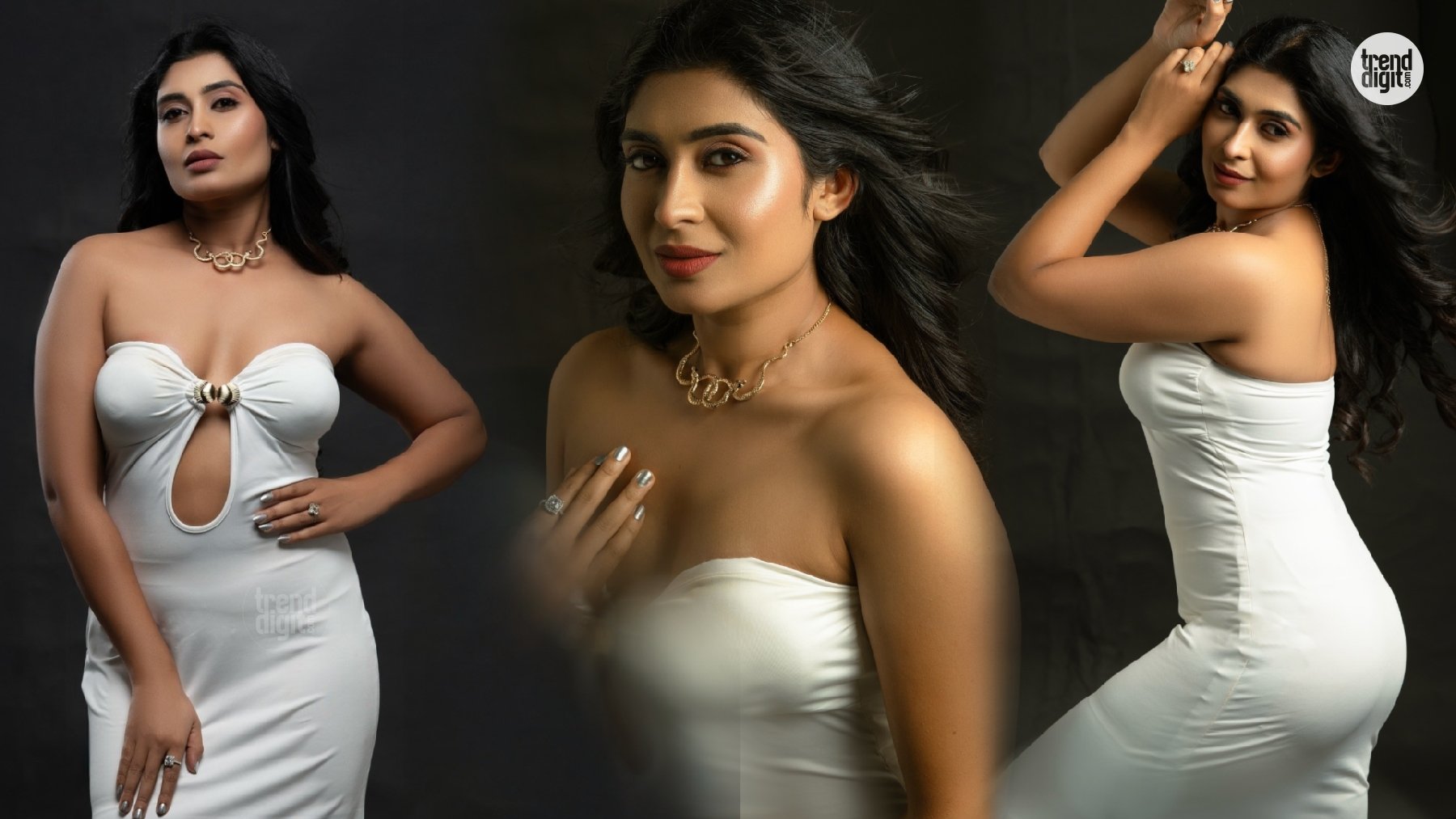 Akshitha Bopaiah appears in a white strapless bodycon dress, captured in a studio setting with soft lighting that highlights a refined and minimal fashion aesthetic.