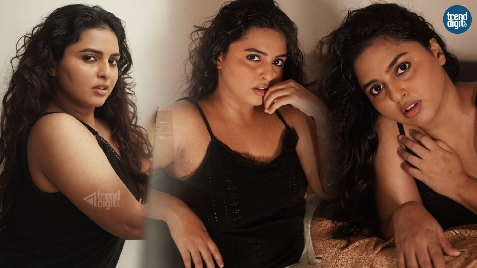 Thamizhvani appears in a black camisole outfit paired with white shorts, captured in a calm indoor photoshoot that highlights relaxed styling and natural light.