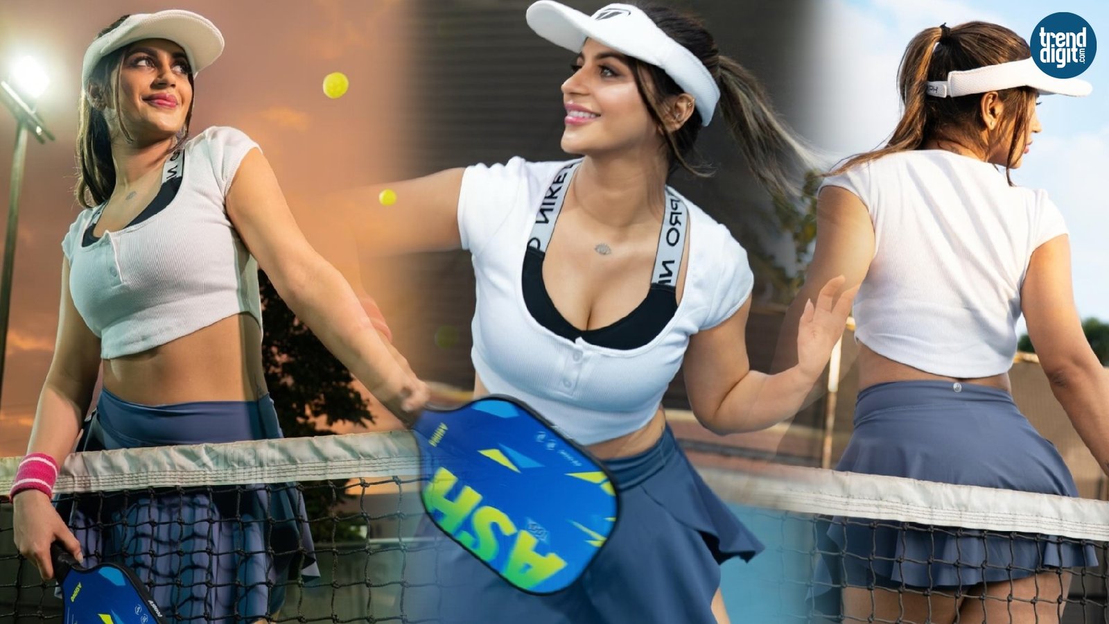 Yashika Aannand is styled in a sporty athleisure outfit while posing on a pickleball court during an outdoor shoot.