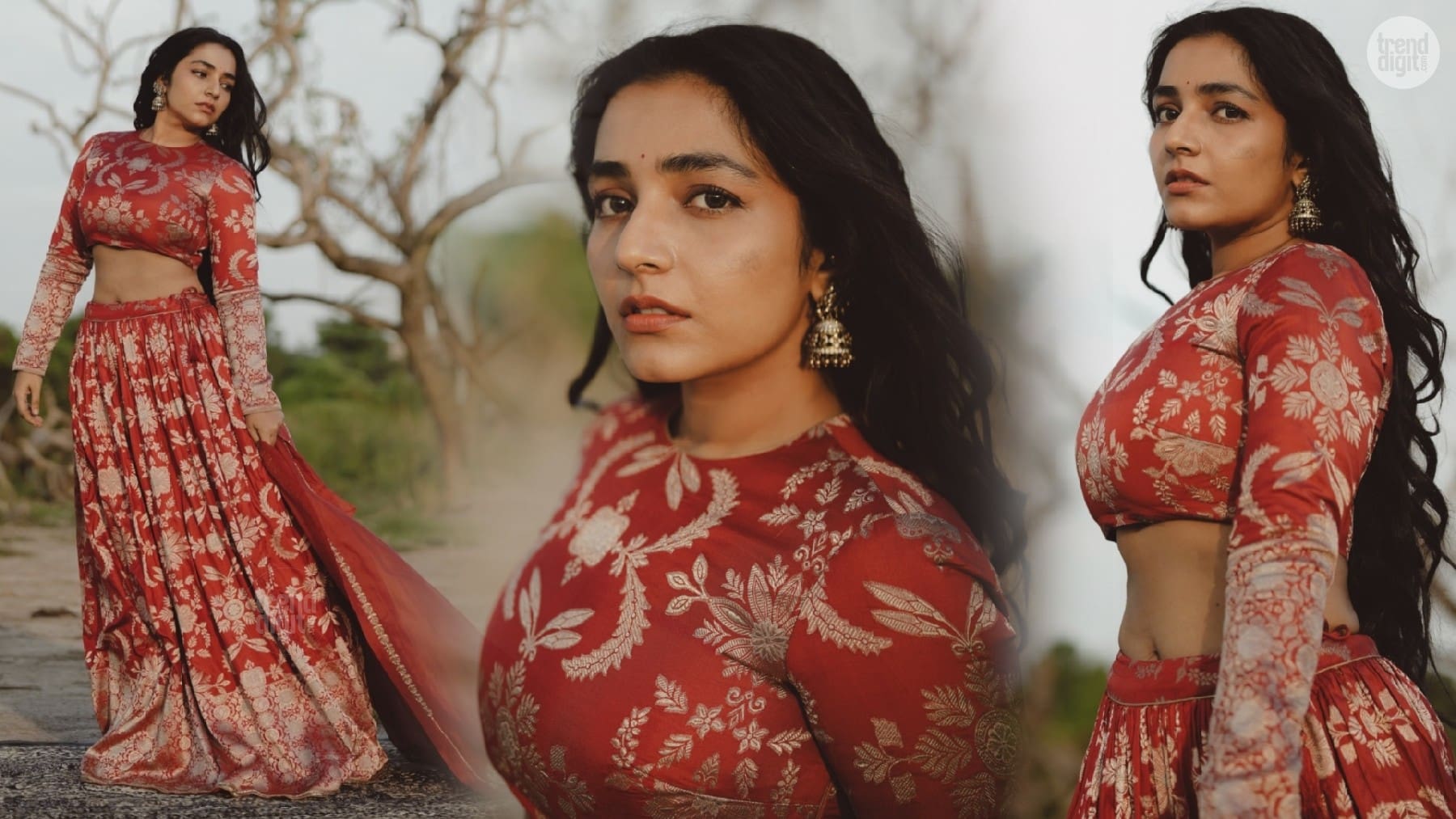 Rajisha Vijayan stuns in a red embroidered lehenga featuring intricate gold motifs, styled for an outdoor sunset shoot with elegant traditional detailing.