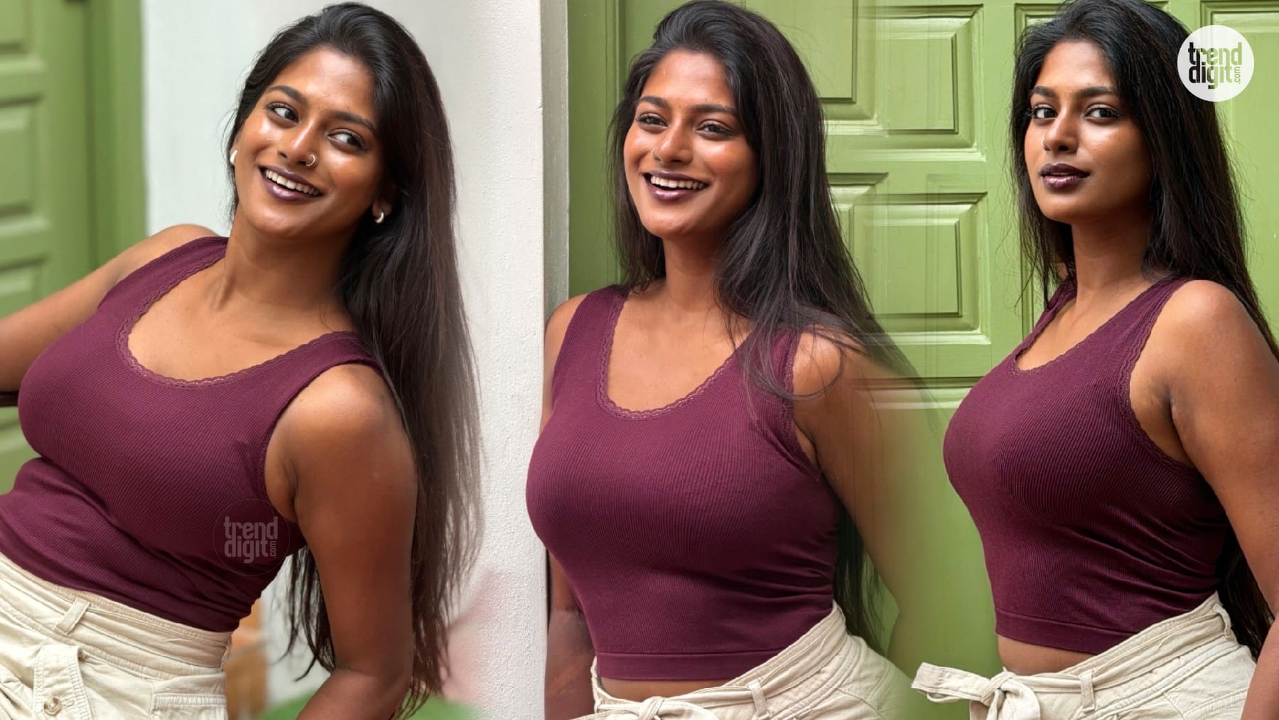 Vinusha Devi in Burgundy Crop Top & Beige Shorts – Effortless Casual Chic