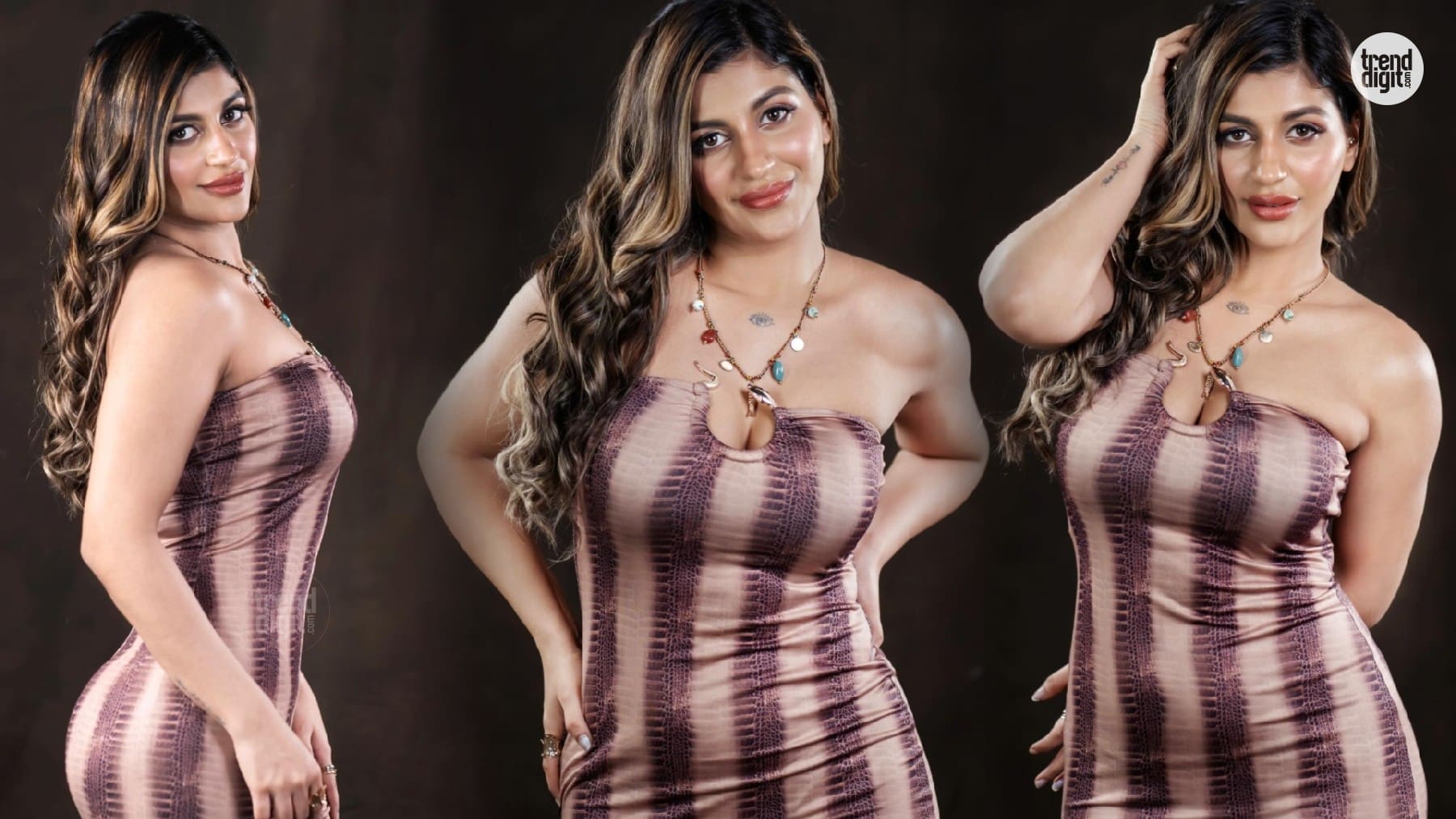 Yashika Aannand appears in a brown strapless bodycon dress with a sculpted fit and subtle pattern detailing, styled in a refined indoor studio setup.