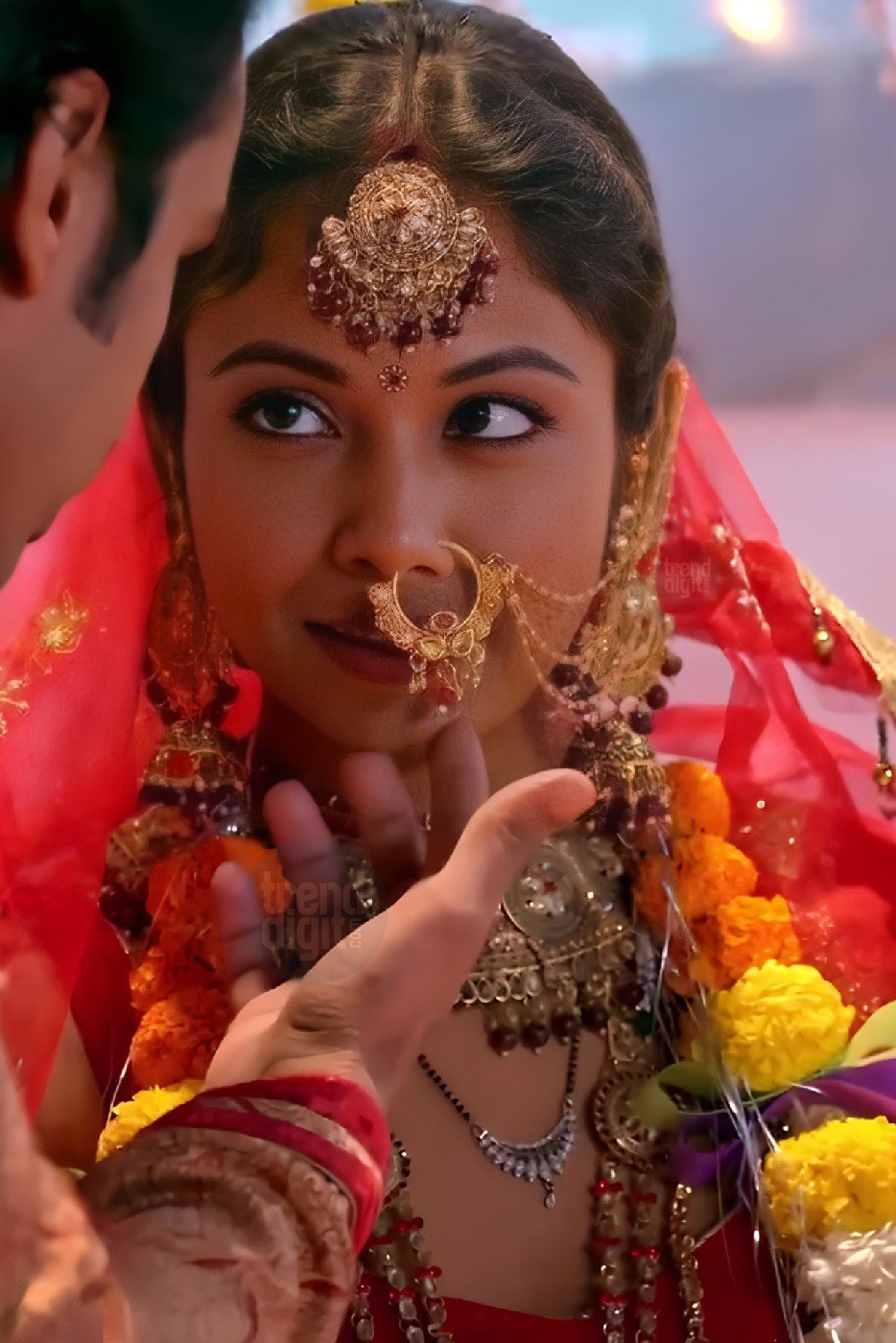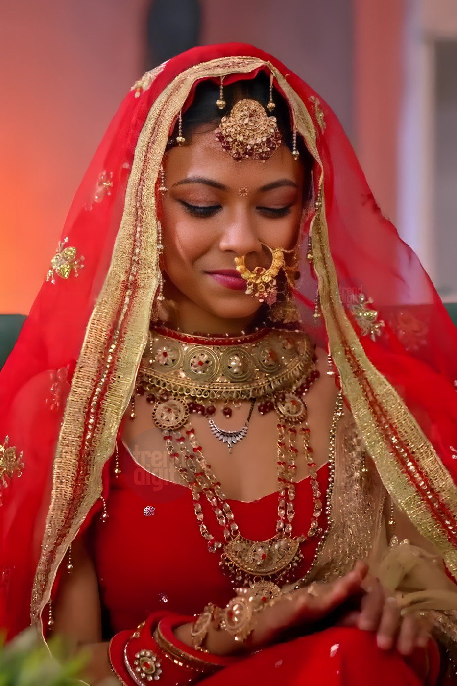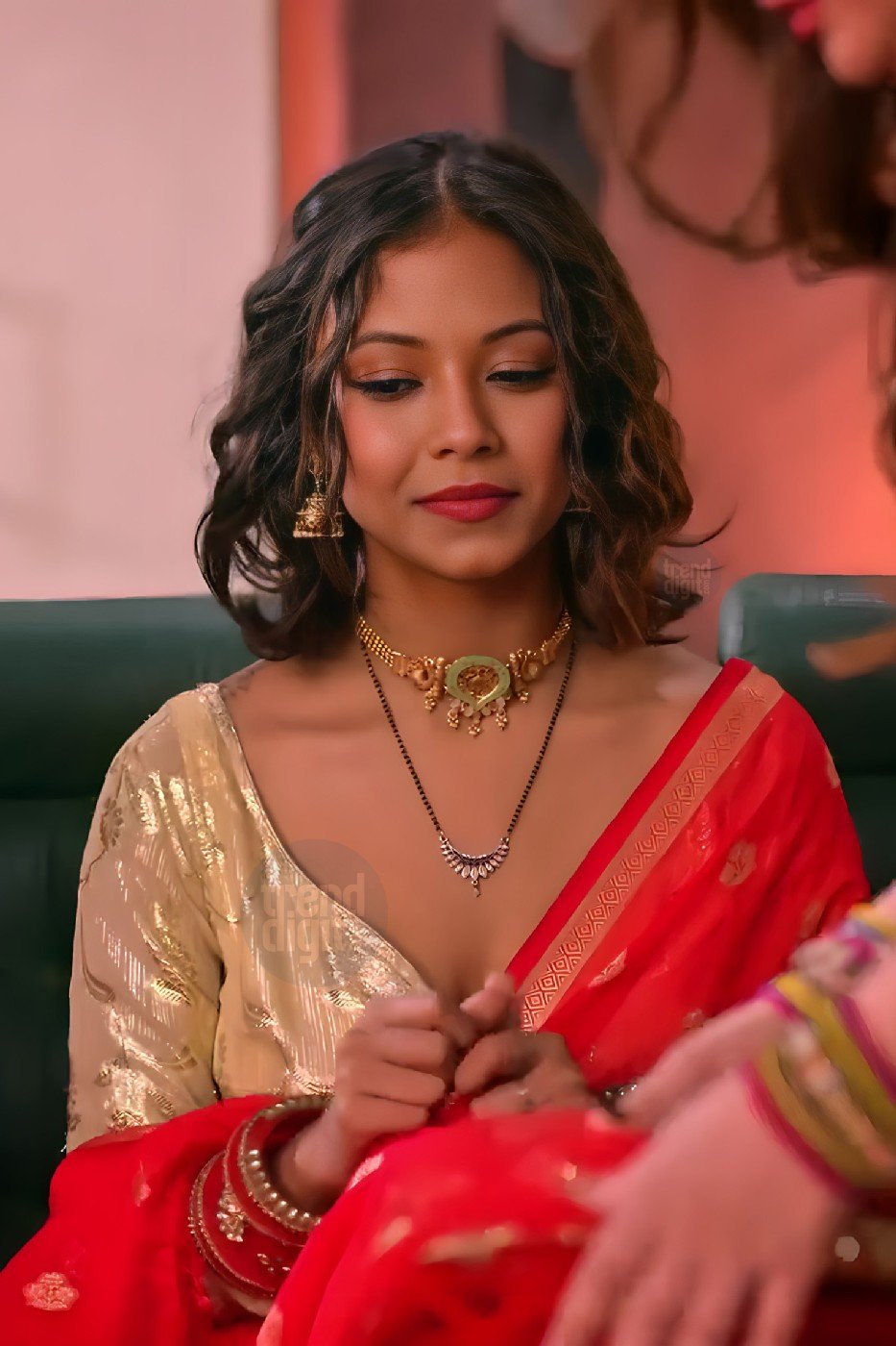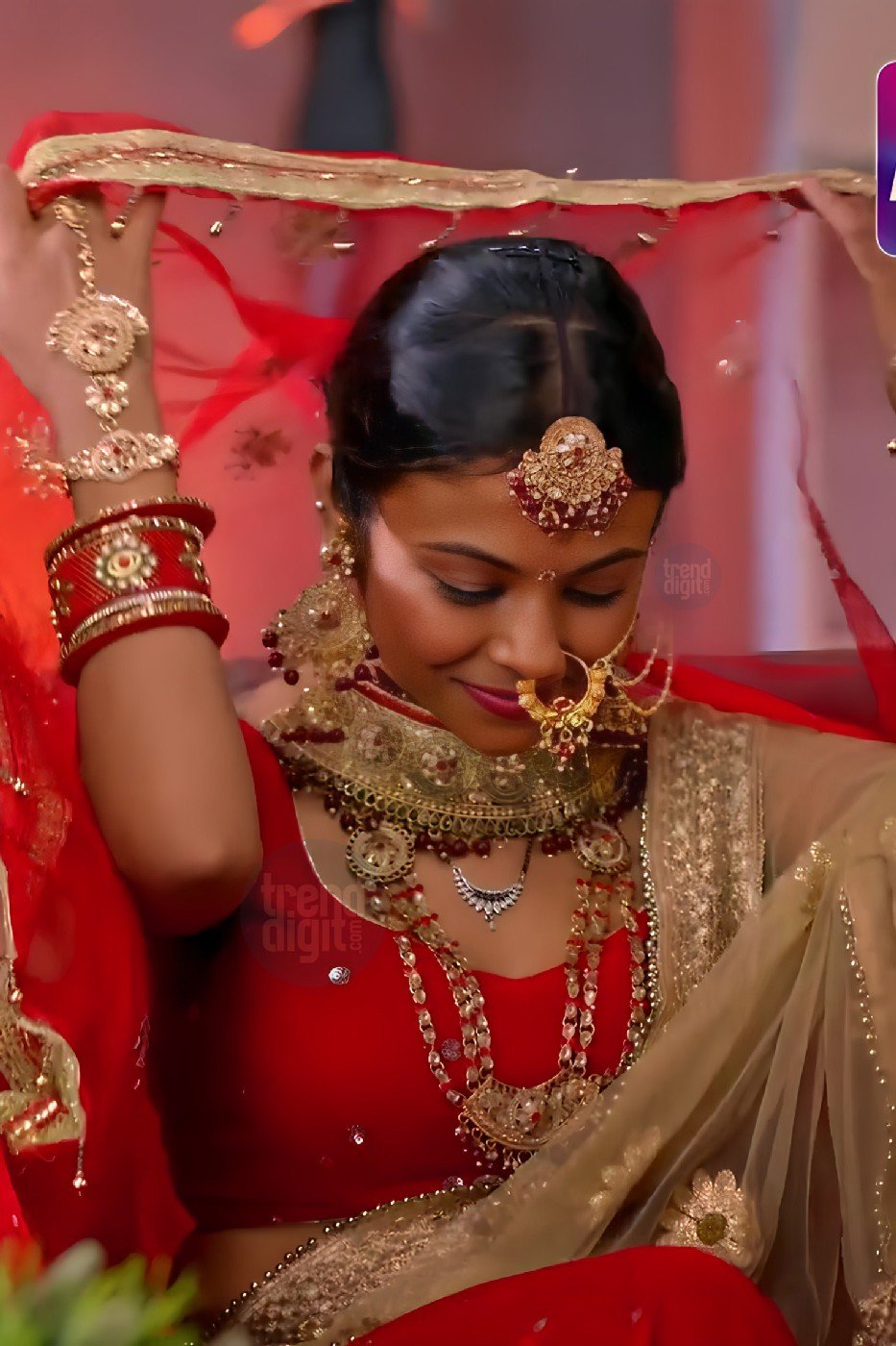In the bridal sequences, Aashima Sharma is seen wearing a classic red bridal ensemble that reflects rich Indian wedding traditions. The deep red outfit is paired with a sheer red dupatta featuring heavy golden embroidery along the borders. Her bridal jewelry is elaborate and eye-catching, including a broad gold choker, layered necklaces with red stone detailing, a traditional maang tikka, and a large nath (nose ring) connected with delicate chains. These details add grandeur and authenticity to her bridal look.
