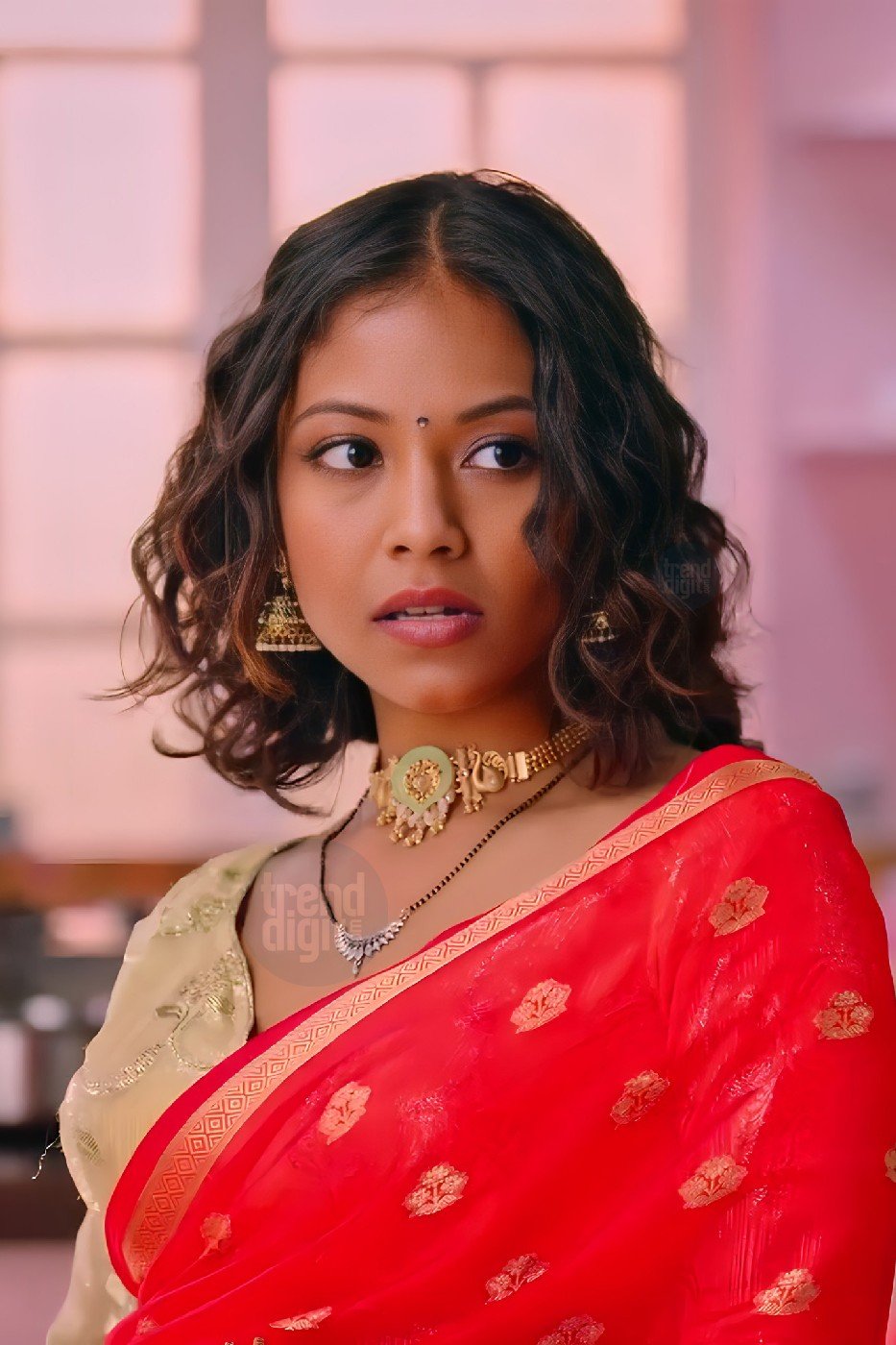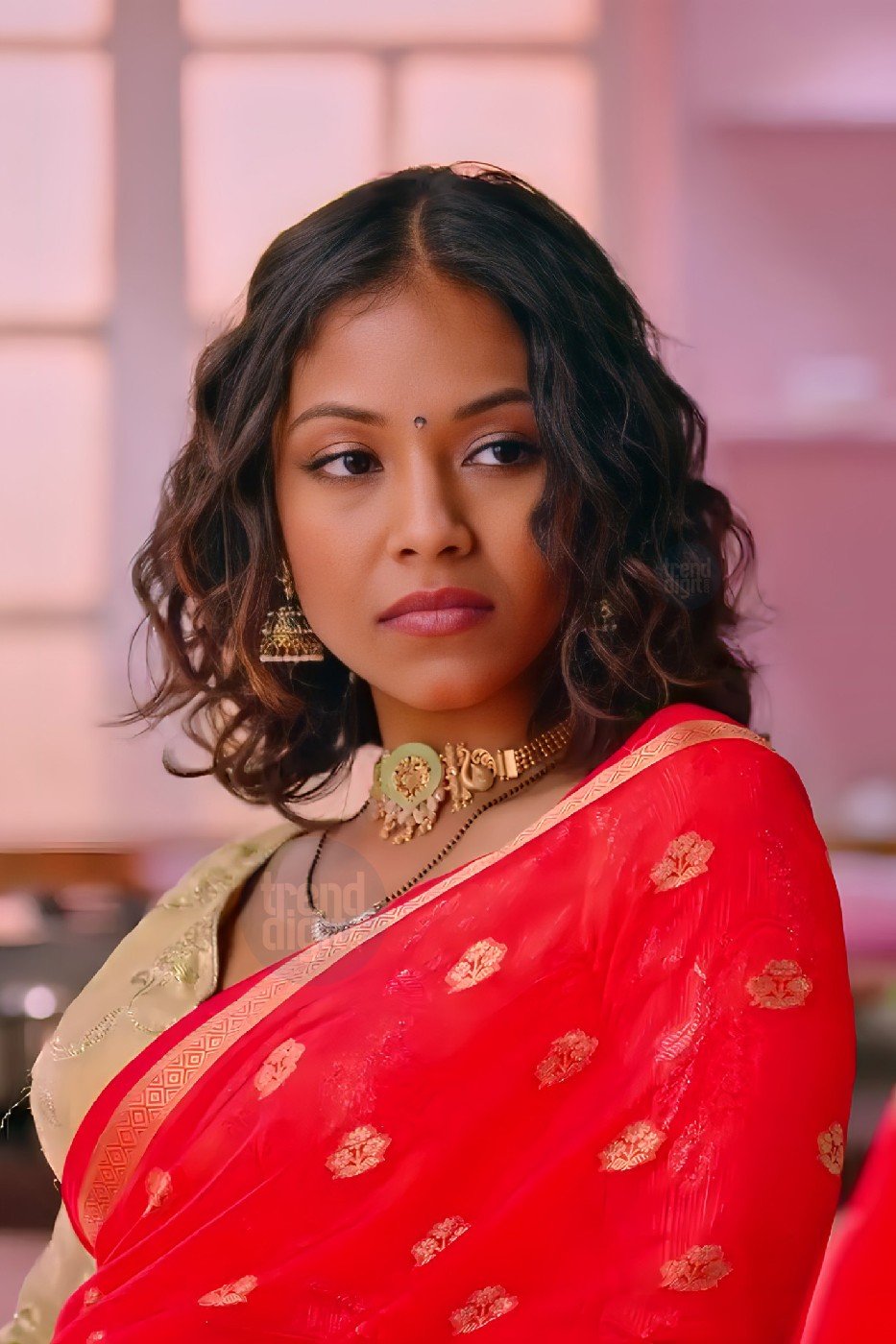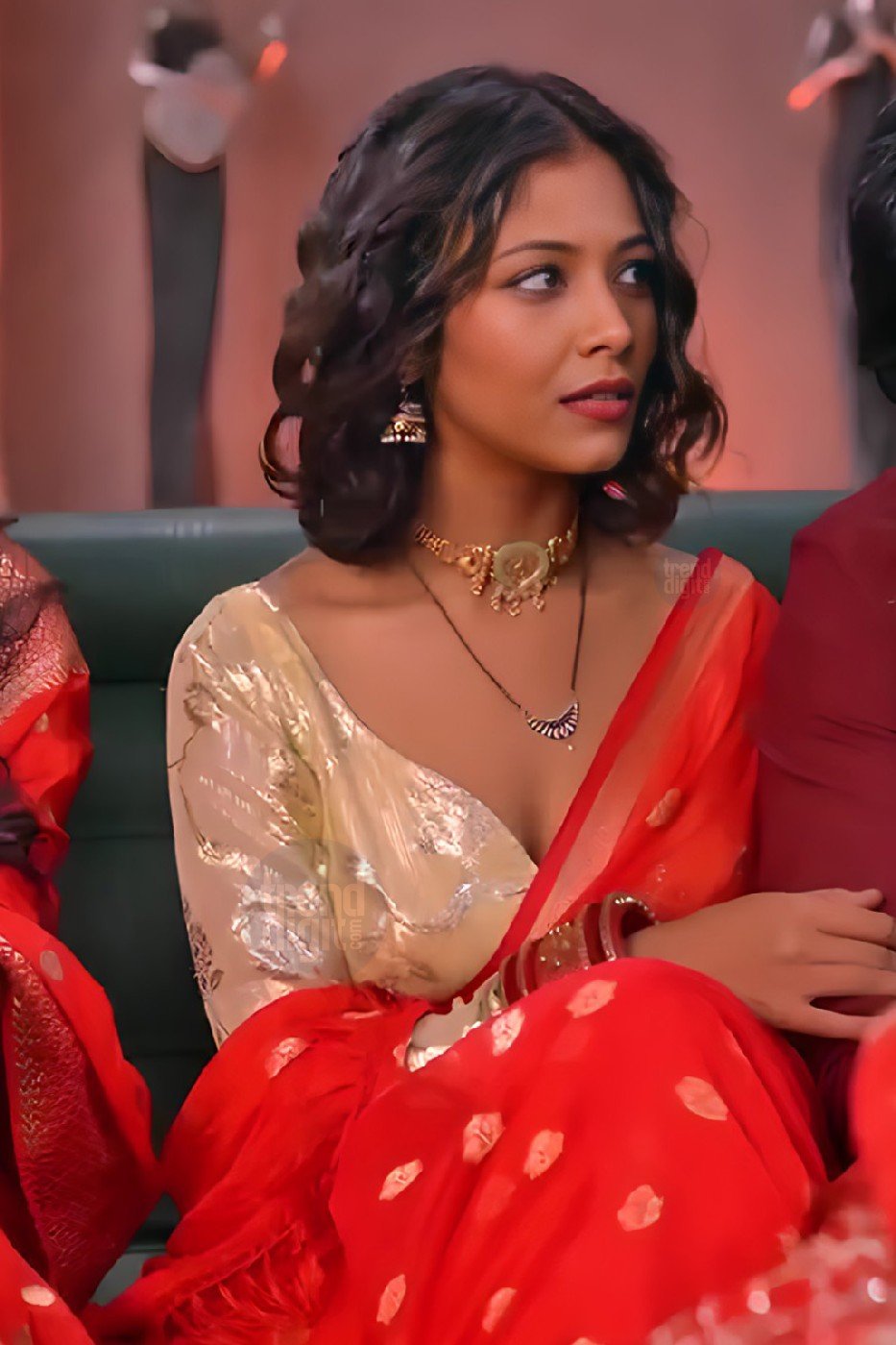 Midway through the visual narrative, Aashima Sharma Suhagraat Web Series Photos highlight her in softer, more subtle saree looks that reflect everyday moments within the storyline. She appears in a red saree with golden polka dots and a light, elegant drape, paired with minimal jewelry and loose, softly curled hair. The understated styling allows her expressions to stand out, conveying vulnerability, anticipation, and emotional depth.