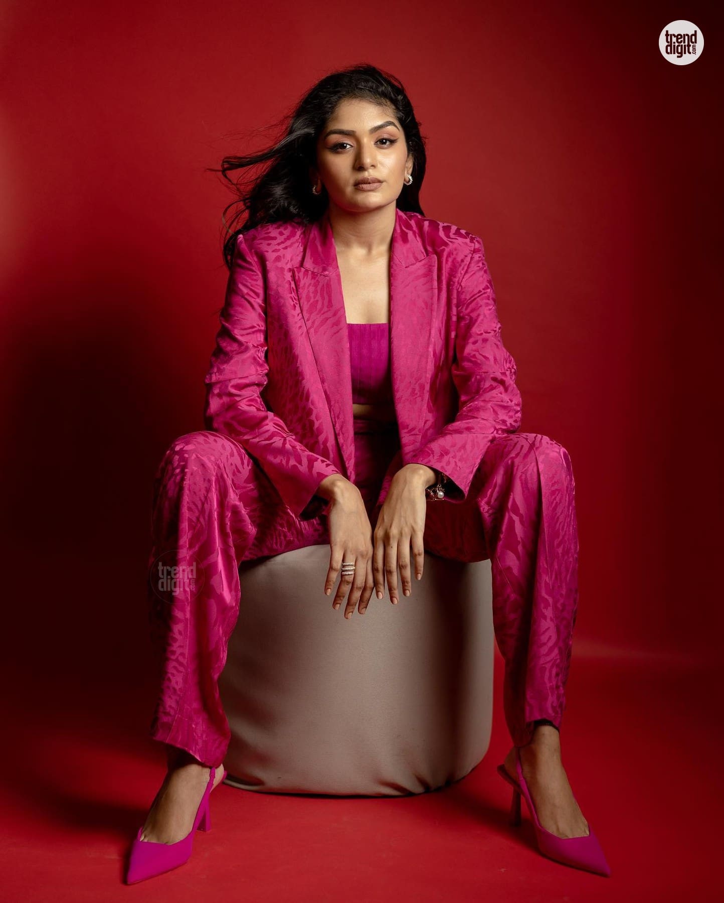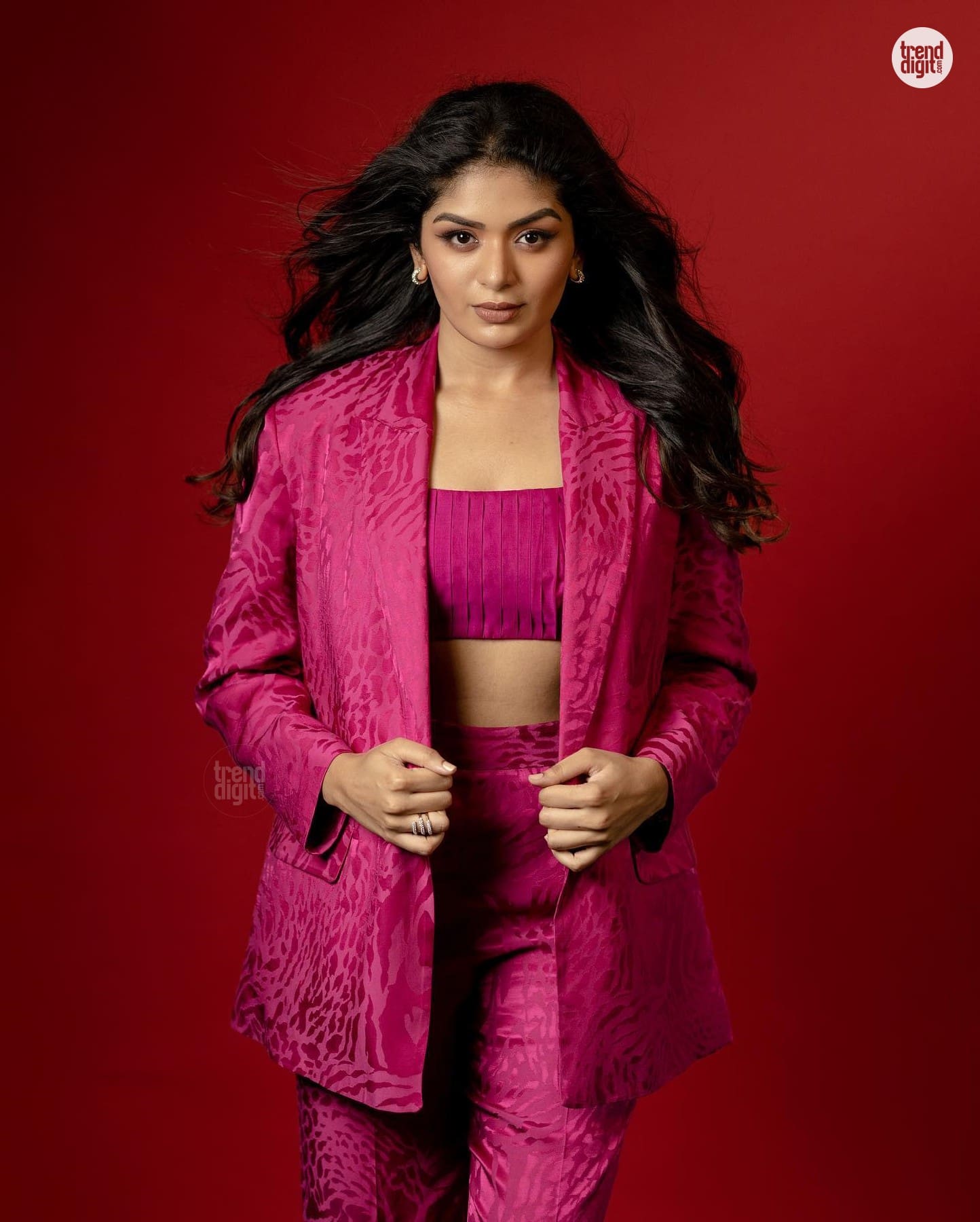 Aditi Shankar is an Indian actress and singer active in Tamil films. This photoshoot features her wearing a pink jacquard pantsuit captured in a studio environment against a solid red backdrop with controlled lighting. The setup emphasizes sharp tailoring and monochrome contrast.