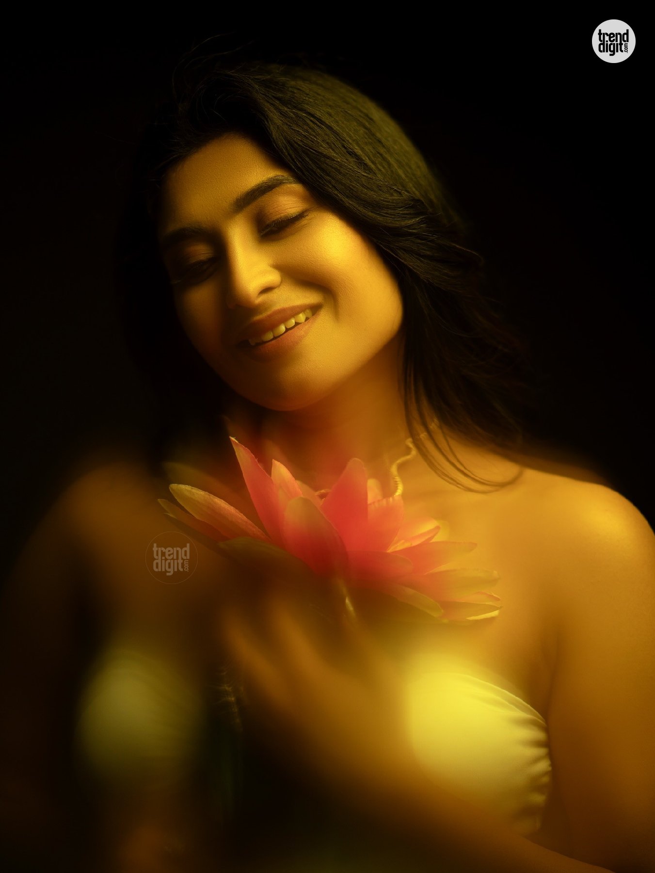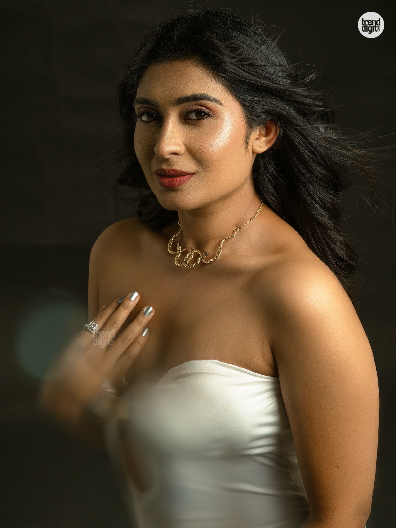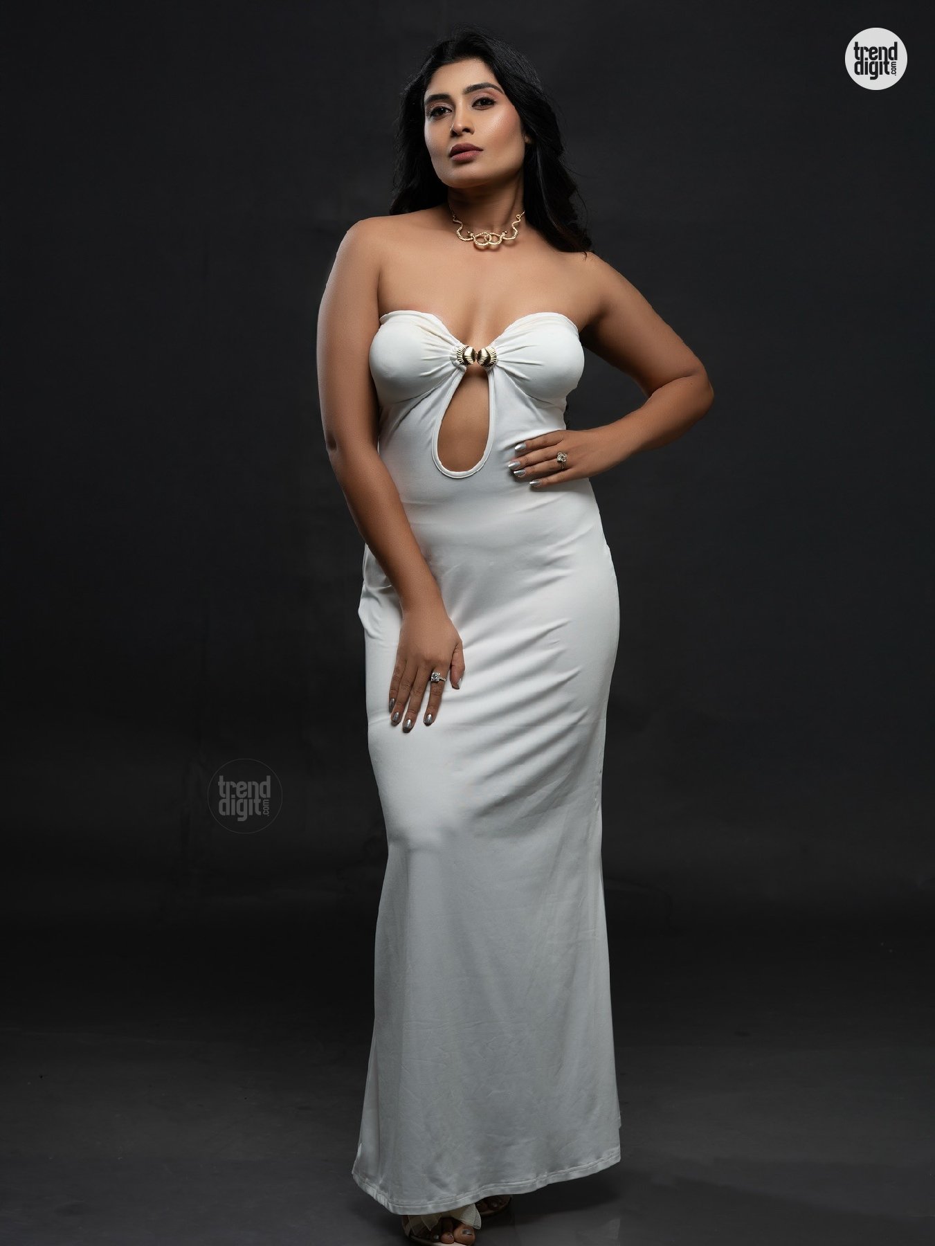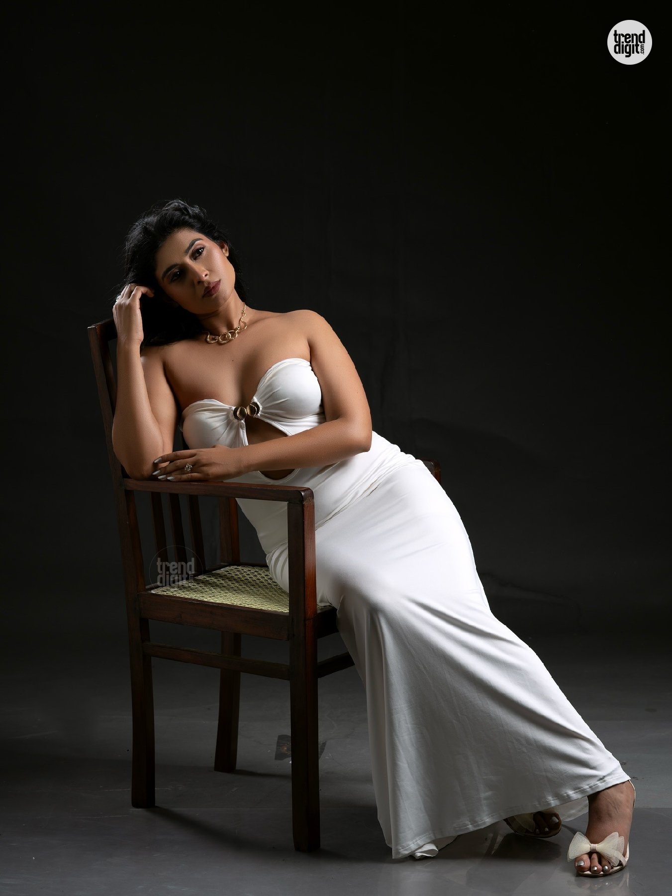 Akshitha Bopaiah is an Indian actress based in South India. This photoshoot features her in a white strapless bodycon dress, captured in a studio setup using soft directional lighting against a dark neutral backdrop. The composition keeps attention on form, posture, and clean styling.