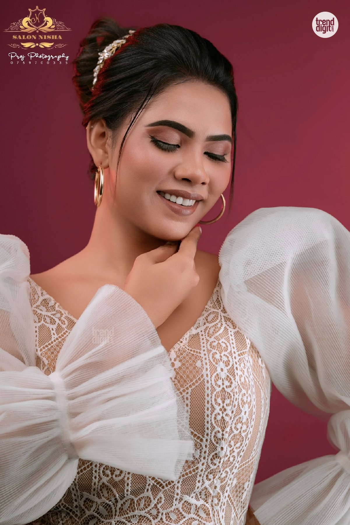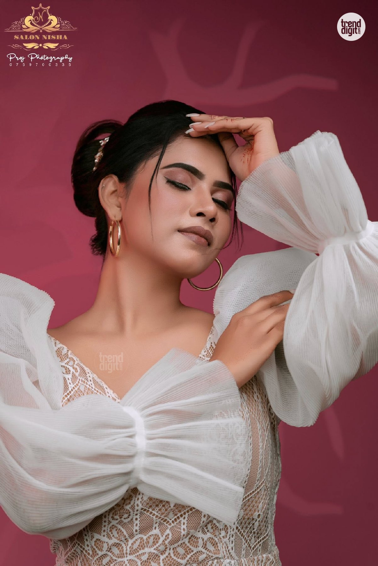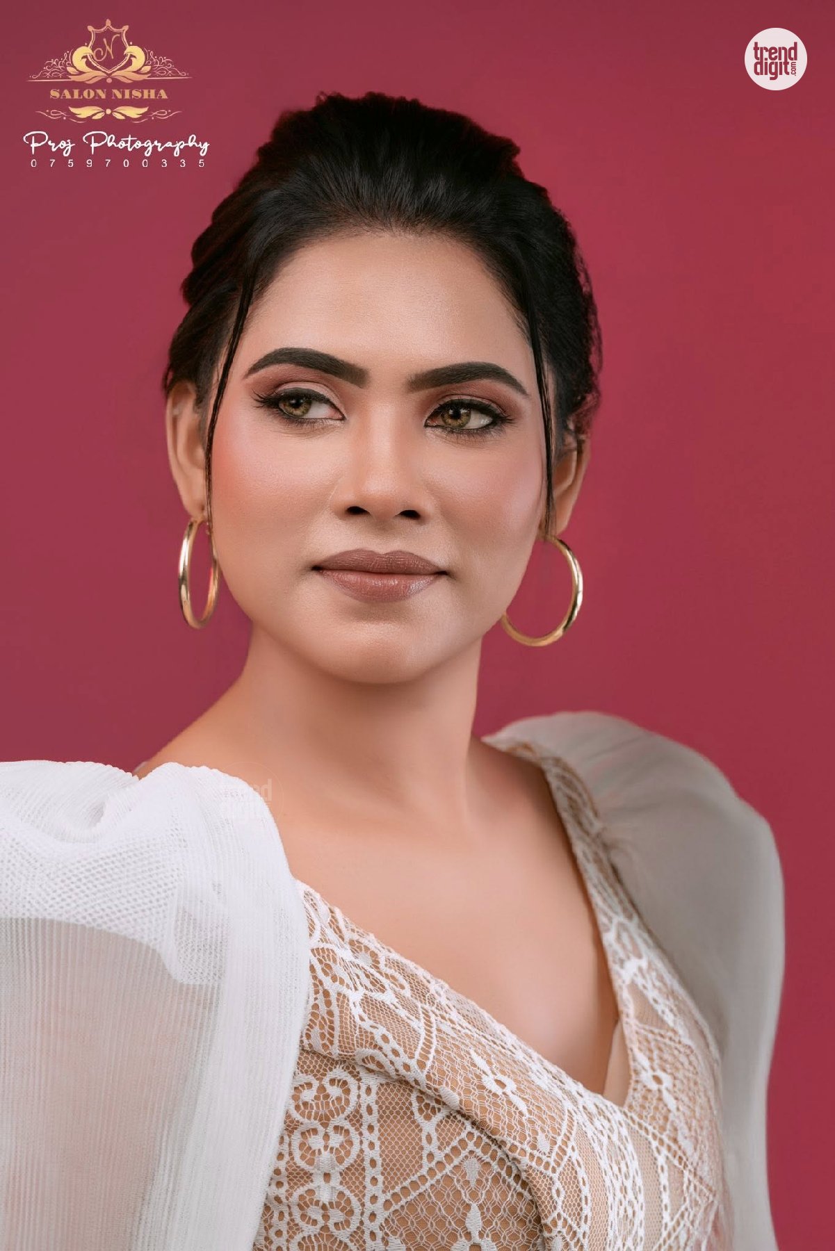 The photography by Proj Photographye uses controlled indoor lighting to emphasize facial features and garment detail with balanced framing. Makeup styling by @nisha_nishanthi presents a polished glam finish with defined brows, soft contouring, and neutral lip tones. The visual execution creates a refined fashion portrait aesthetic.