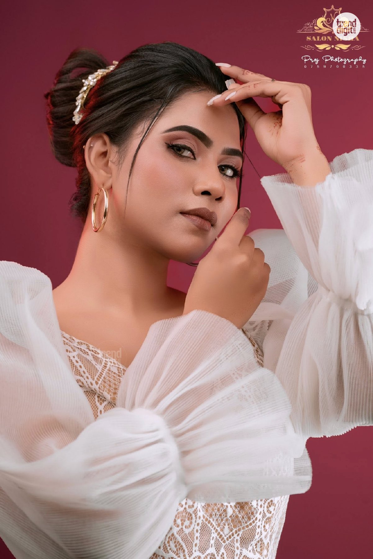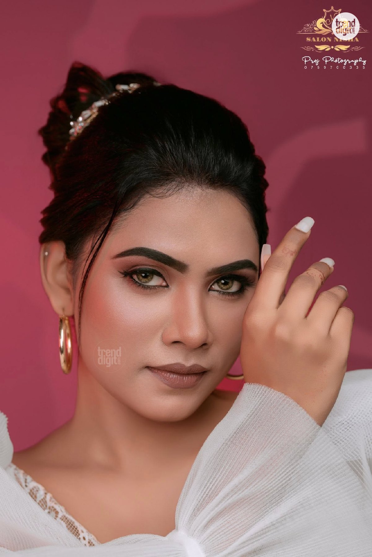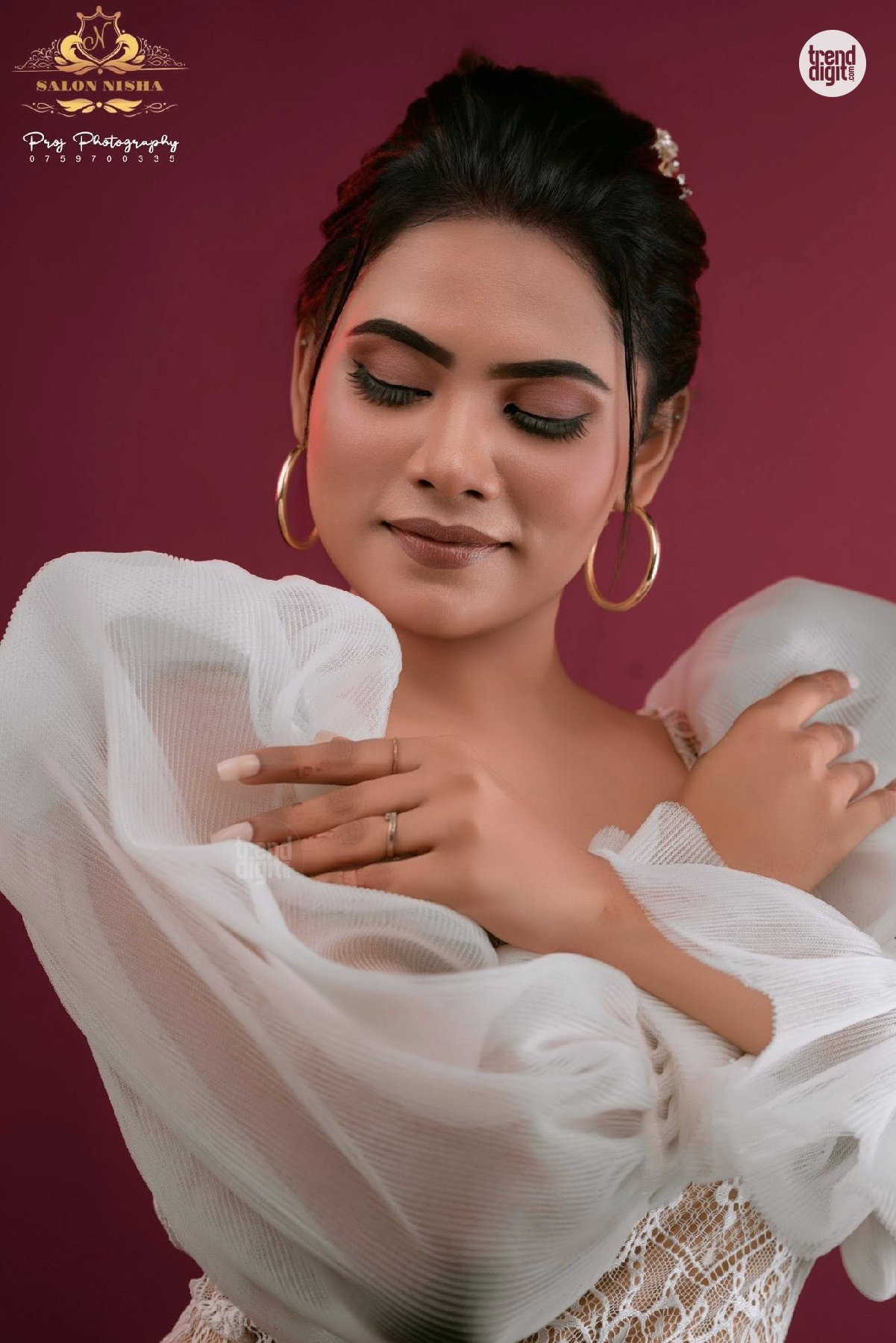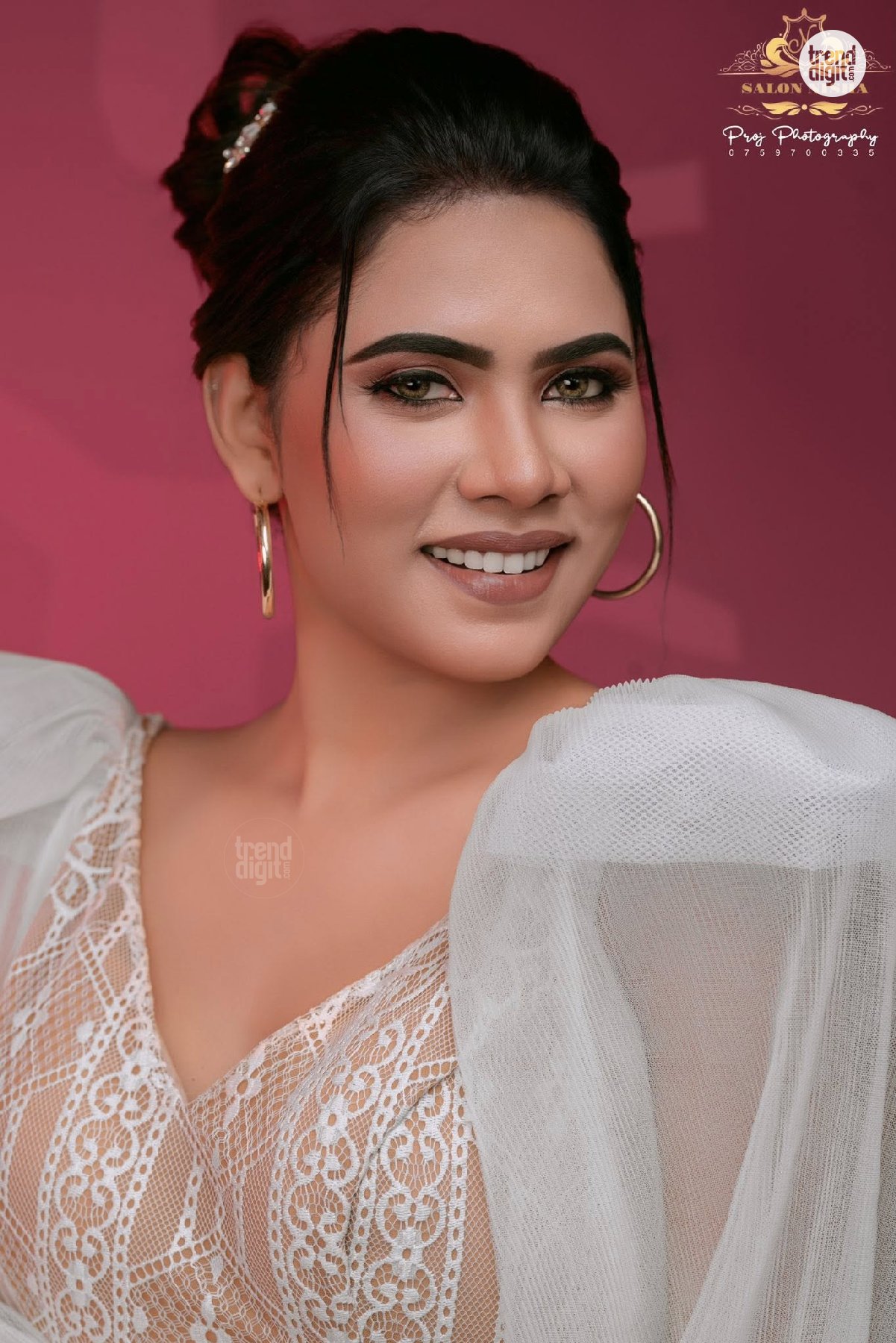 The photography by Proj Photographye uses controlled indoor lighting to emphasize facial features and garment detail with balanced framing. Makeup styling by @nisha_nishanthi presents a polished glam finish with defined brows, soft contouring, and neutral lip tones. The visual execution creates a refined fashion portrait aesthetic.