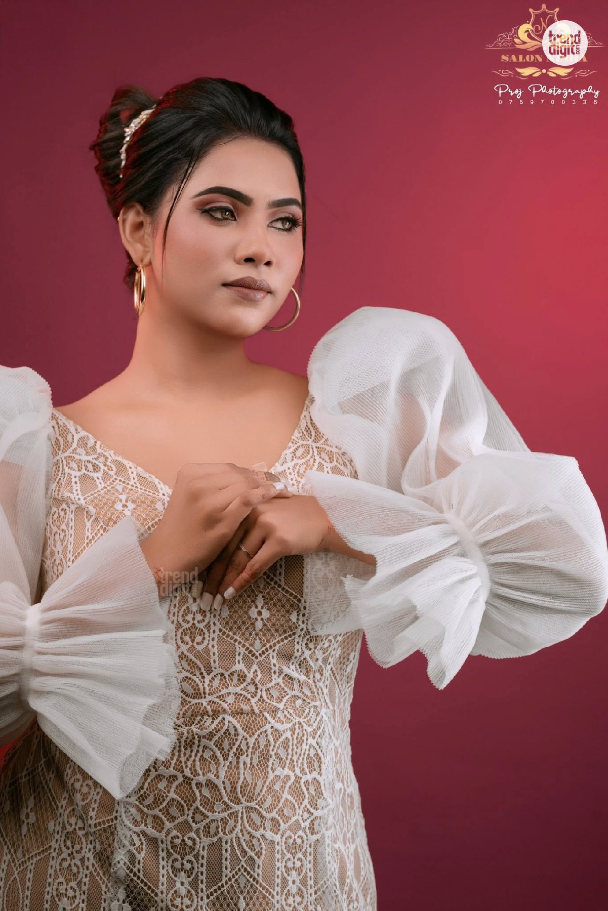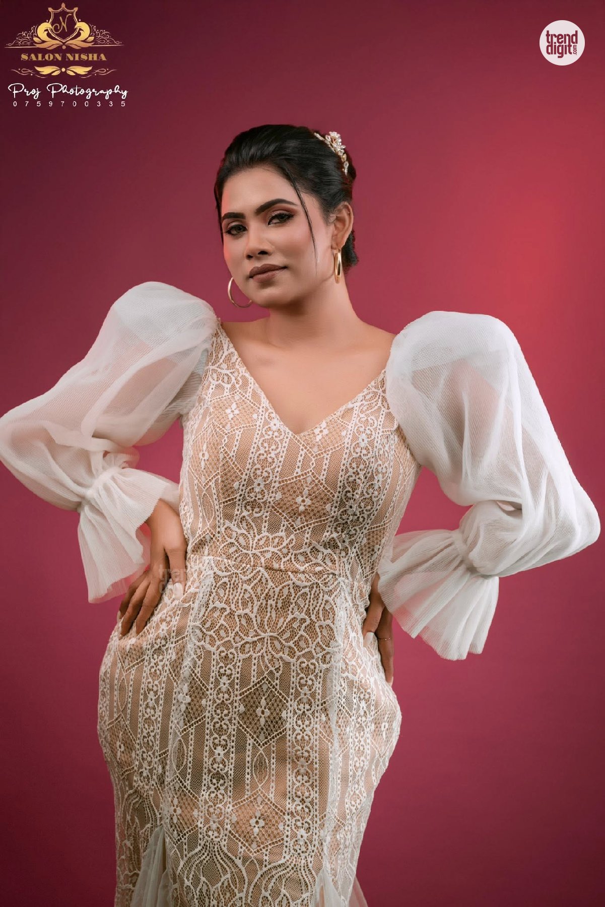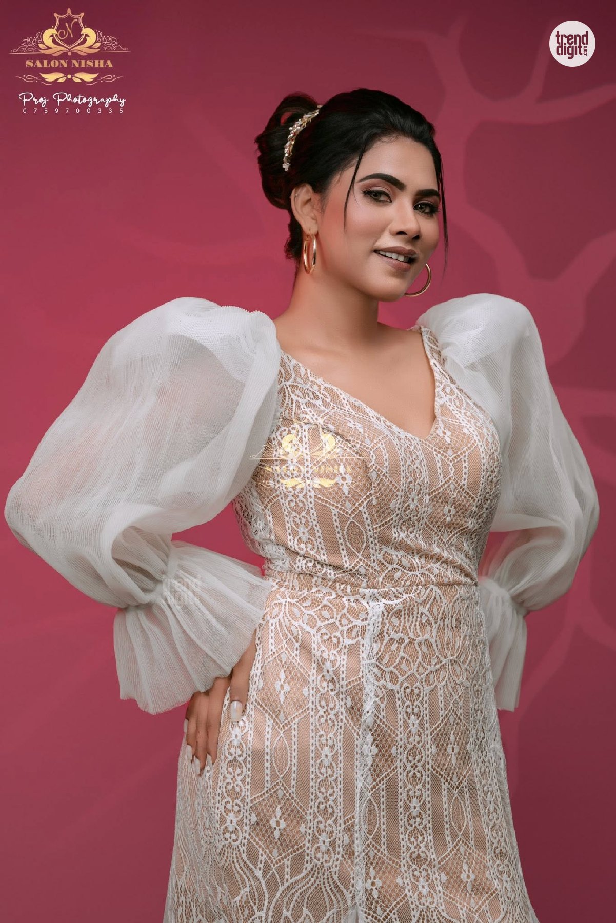 Ani Anista is a Sri Lankan fashion model associated with studio-based fashion and beauty editorials. This photoshoot features the Ani Anista White Lace Gown captured in an indoor studio environment using controlled lighting and a soft pink backdrop. The setup highlights detailed garment textures and clean portrait composition.