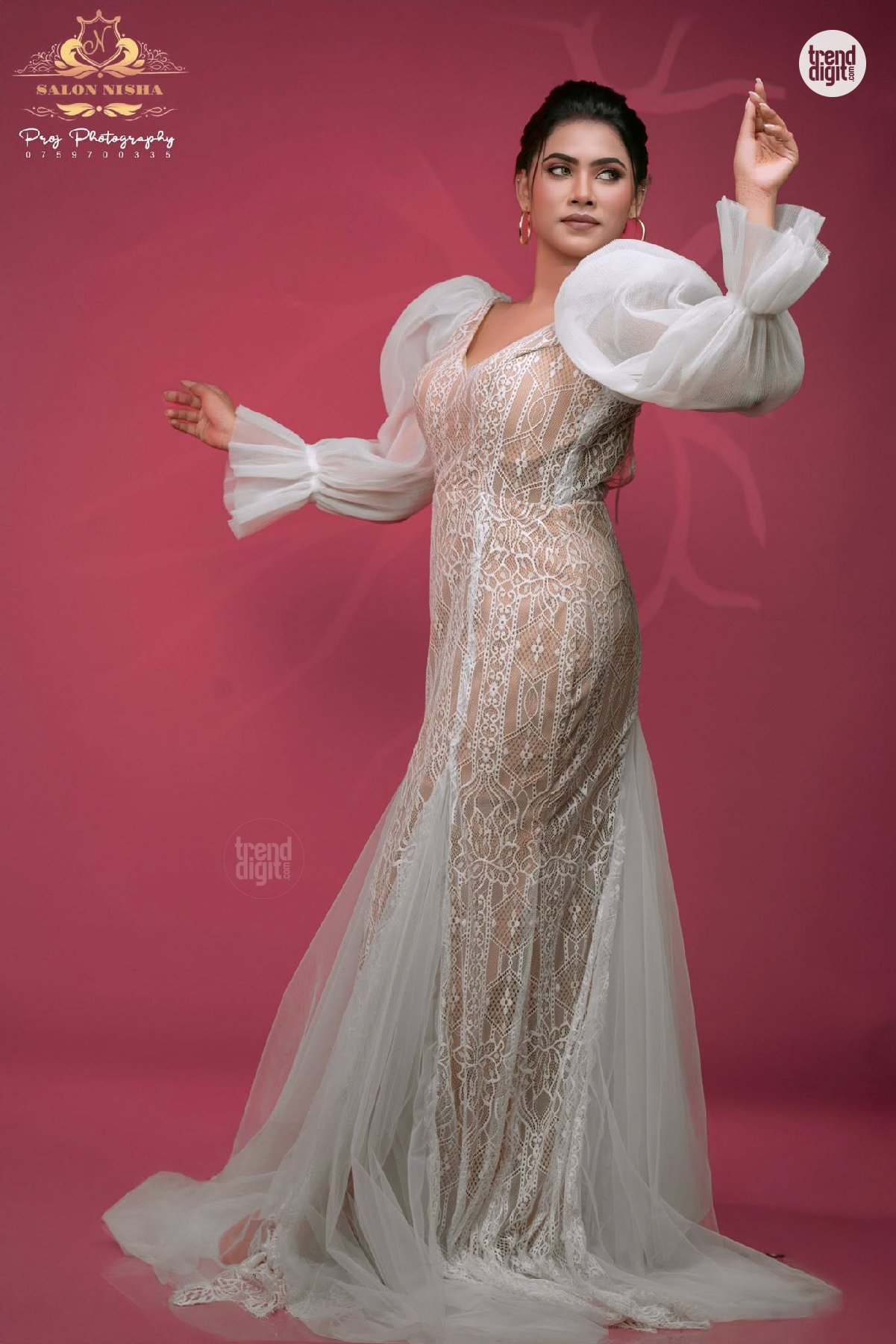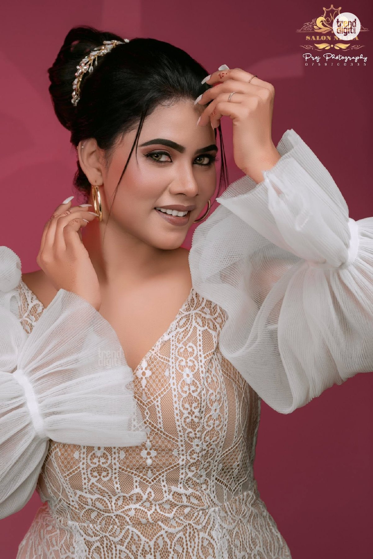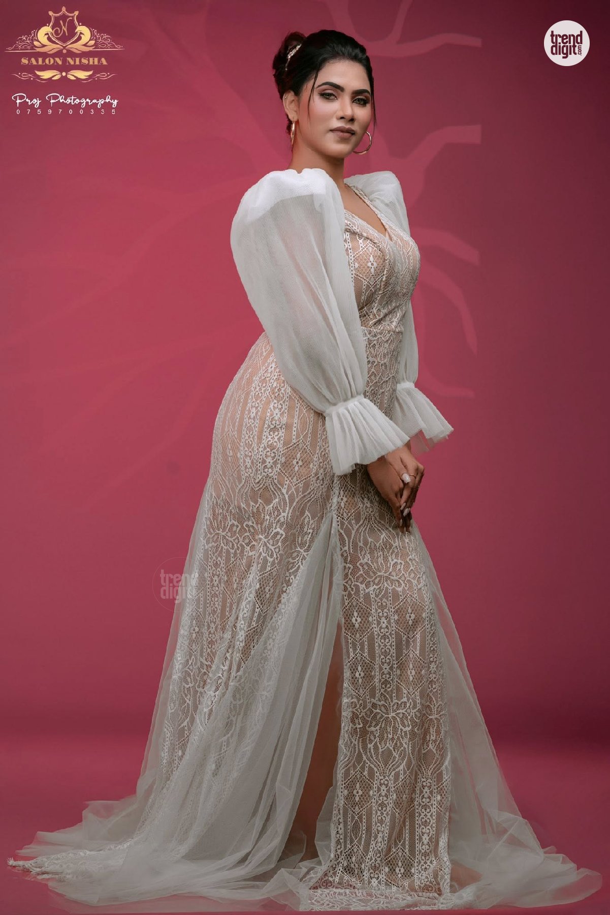 Ani Anista is a Sri Lankan fashion model associated with studio-based fashion and beauty editorials. This photoshoot features the Ani Anista White Lace Gown captured in an indoor studio environment using controlled lighting and a soft pink backdrop. The setup highlights detailed garment textures and clean portrait composition.