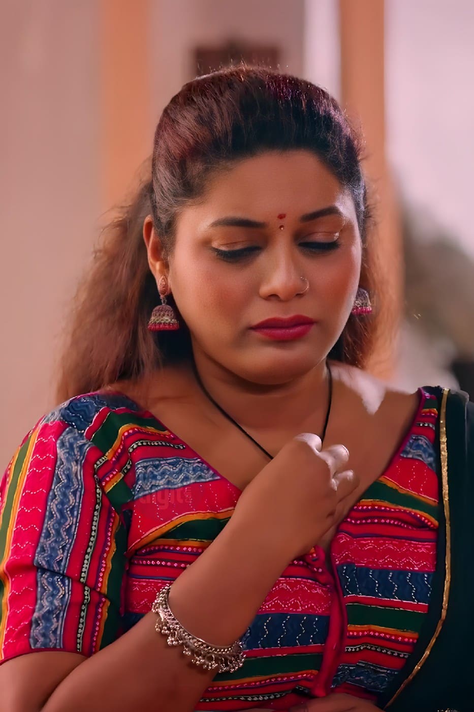 The close-up Chamkili Suhagraat Web Series Photos focus heavily on her expressions, which play a crucial role in defining her character. Her minimal makeup, small red bindi, soft kajal-lined eyes, and natural lip color give her a raw, relatable appearance. She accessorizes with simple jhumka earrings, a black-beaded mangalsutra-style necklace, silver bangles, and a delicate bracelet, keeping the look authentic rather than glamorous.