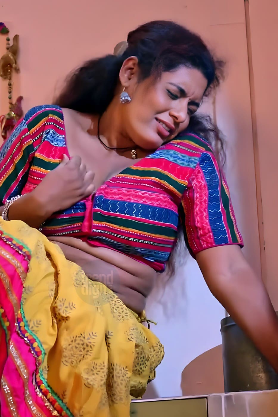 In these Chamkili Suhagraat Web Series Photos, Chamkili is seen wearing a vibrant, rustic traditional outfit that perfectly suits her character’s strong and grounded personality. She appears in a multicolored striped blouse paired with a mustard-yellow lehenga or skirt, complemented by a dark green dupatta with a subtle border. The outfit reflects a regional, desi aesthetic, often seen in rural or small-town narratives, adding realism to her role in Suhagraat.