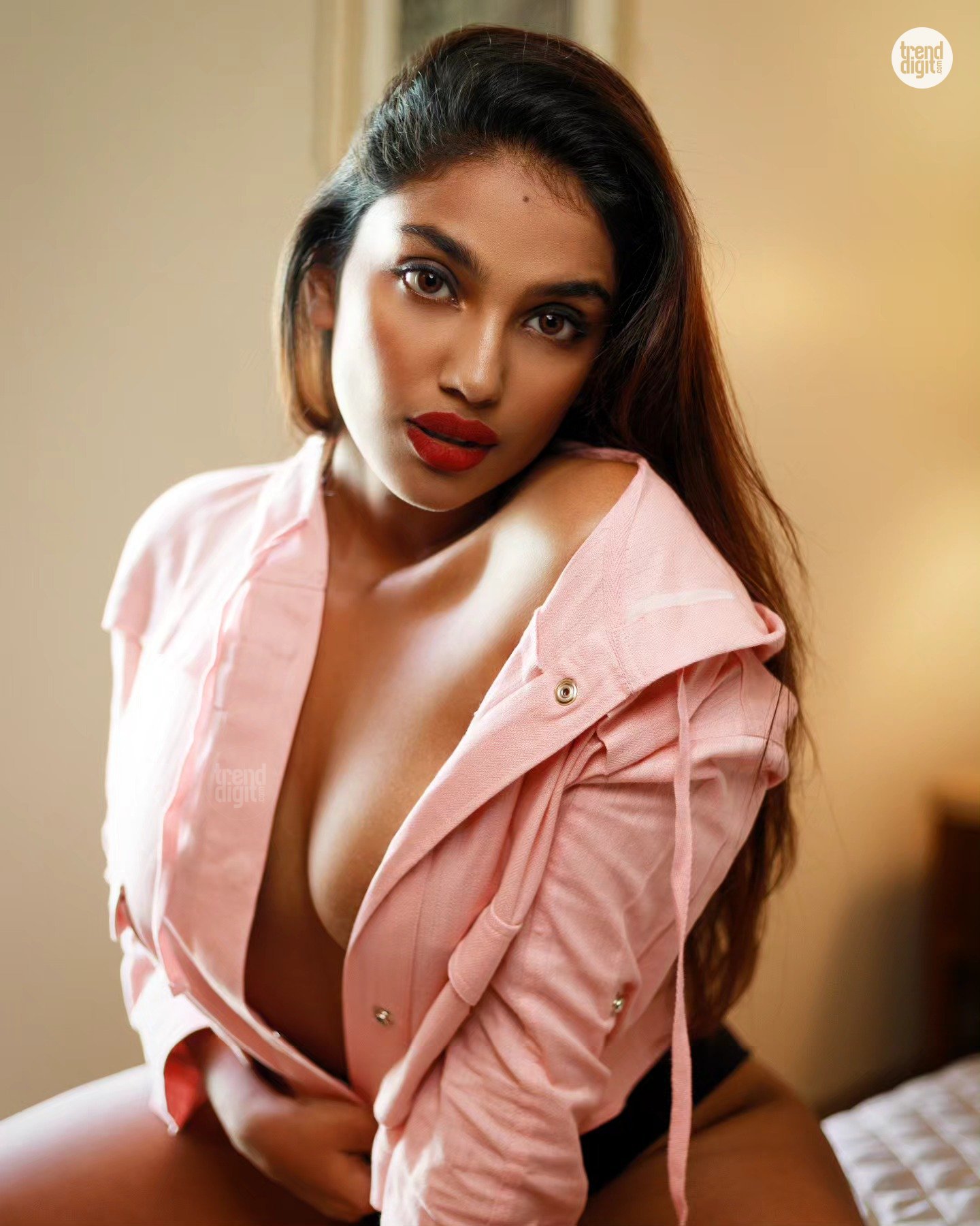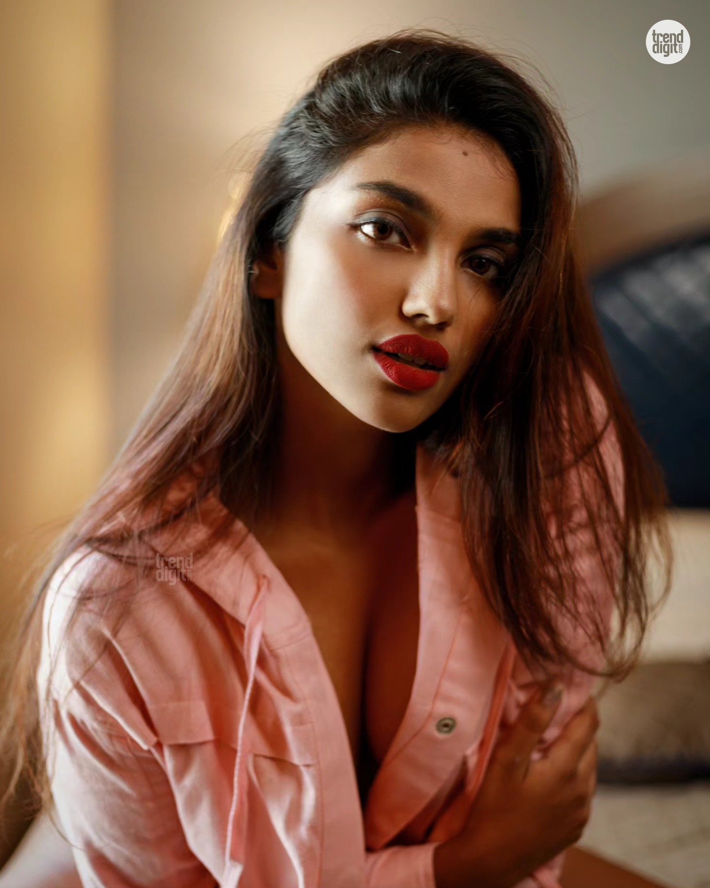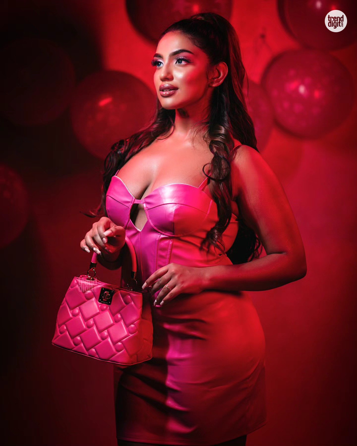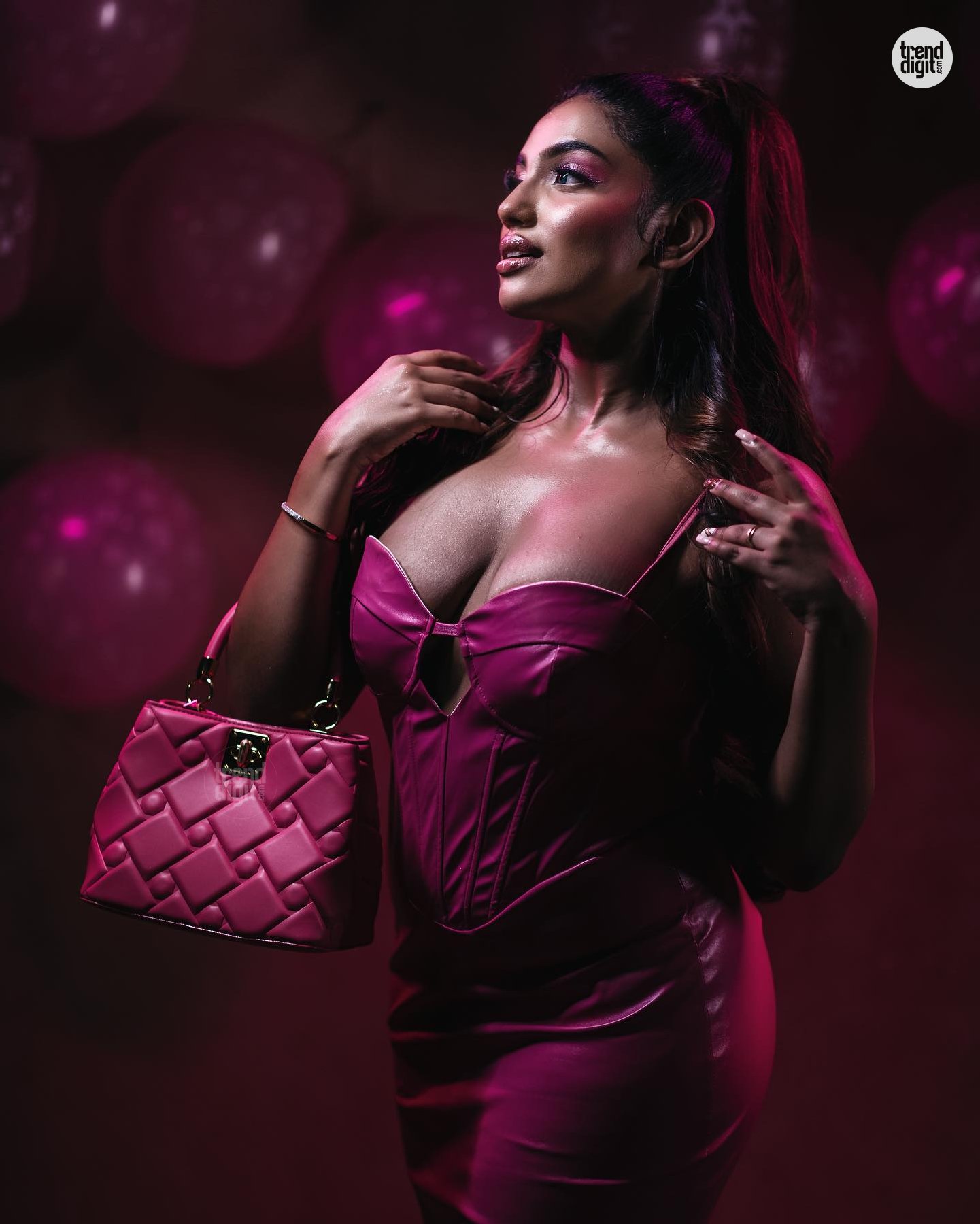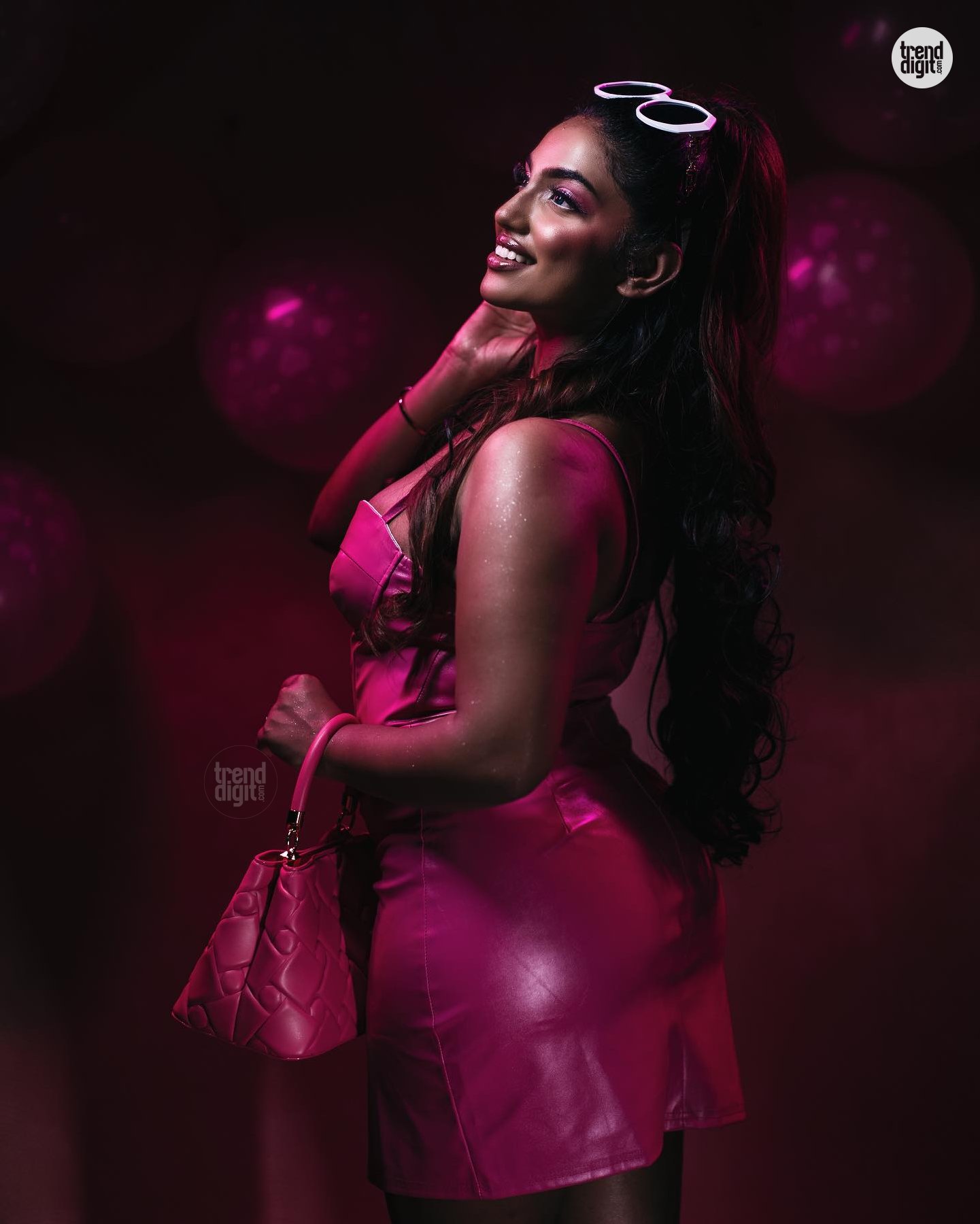 Christina George is a fashion model based in India known for expressive fashion shoots. This photoshoot is captured in a studio with a balloon backdrop using soft red-toned lighting. The setup creates a lively and cohesive visual theme.