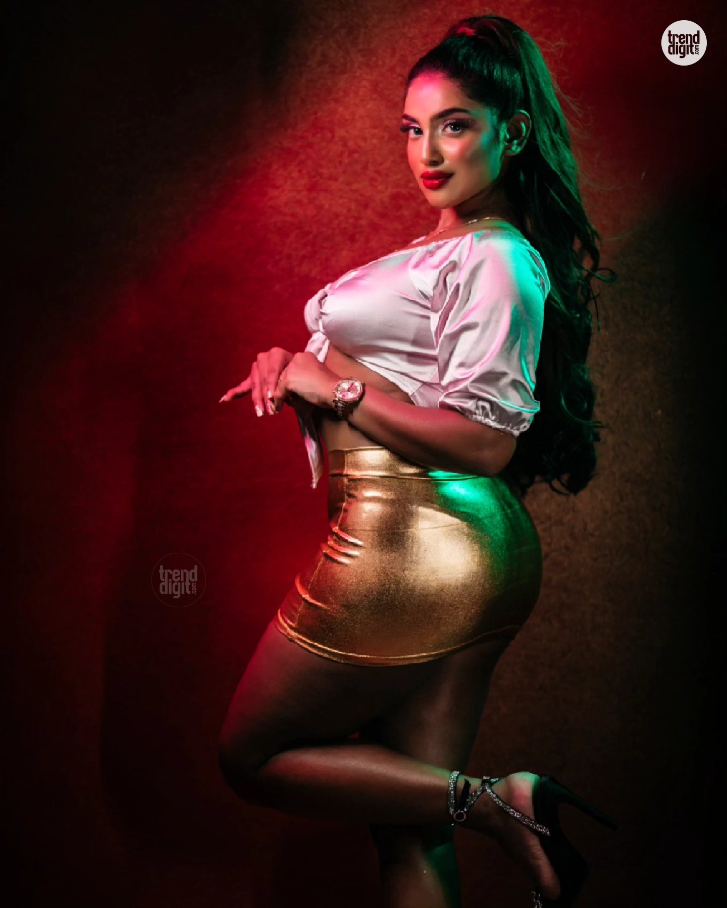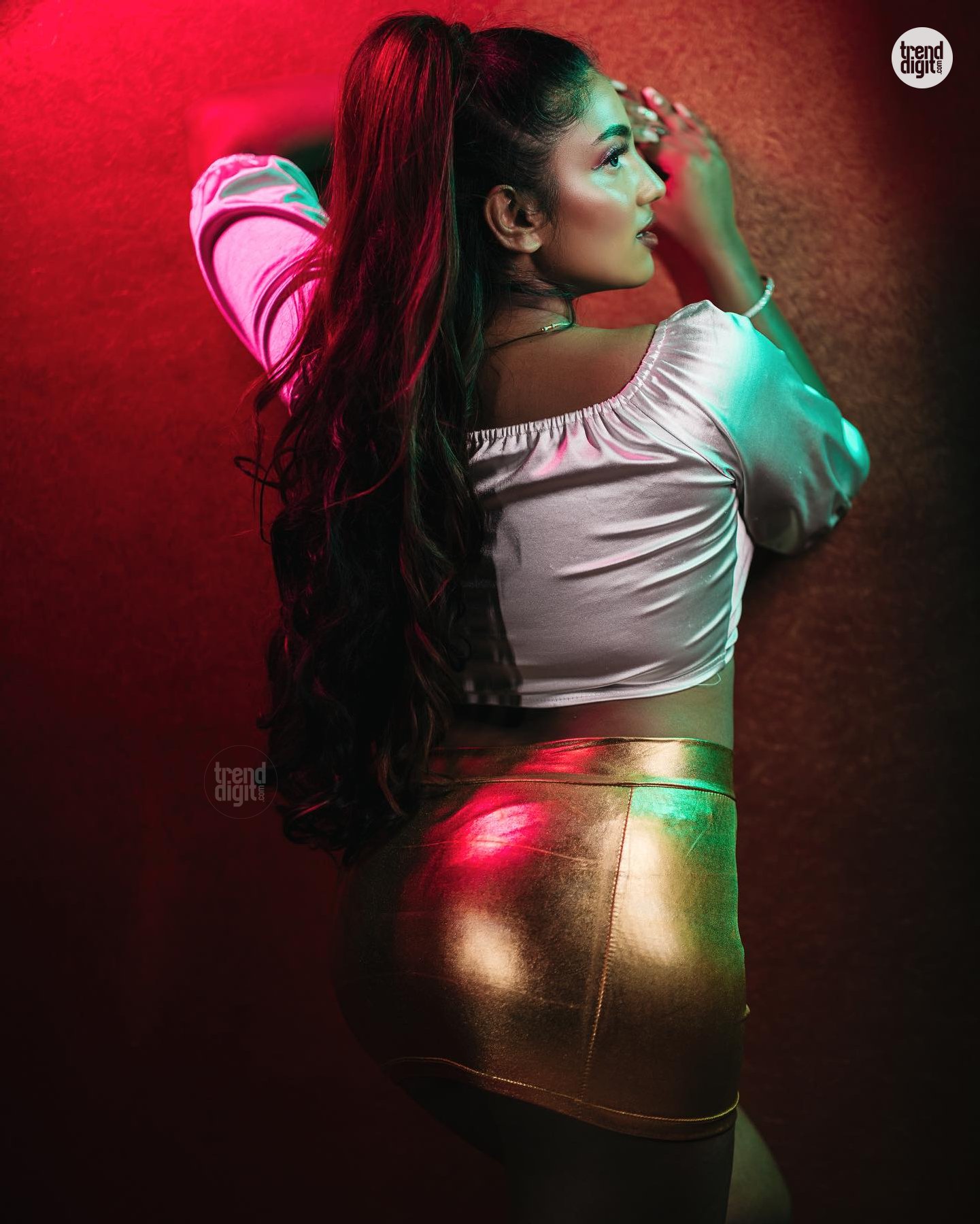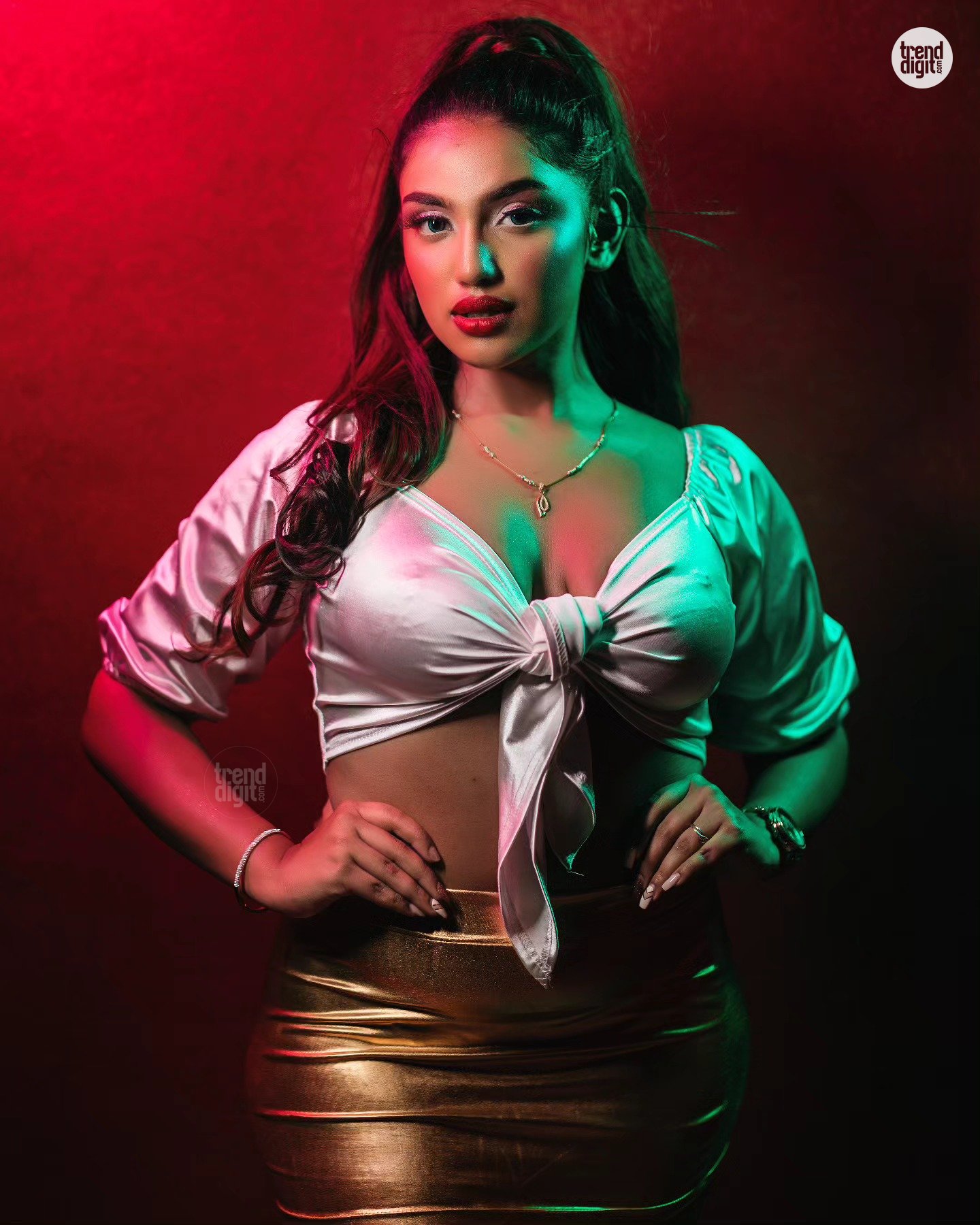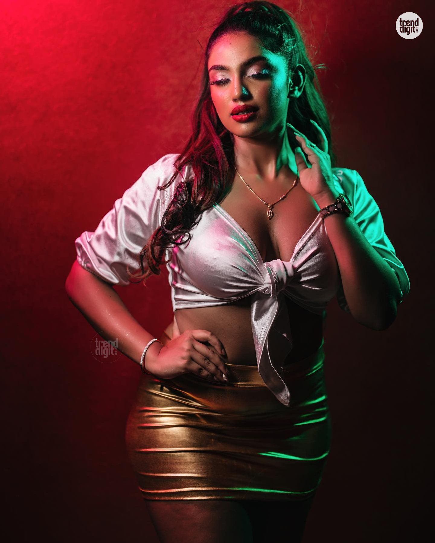 Christina George is a fashion model based in India known for contemporary styled shoots. This outfit feature is captured in a studio setting using dual-tone lighting with red and green hues. The backdrop enhances the contrast and keeps the focus on styling details.