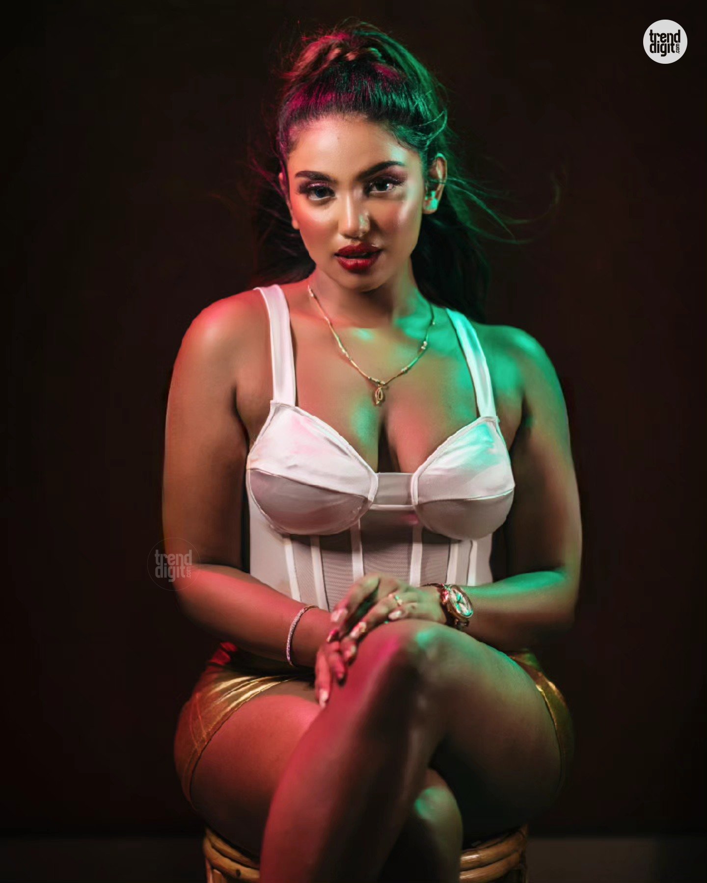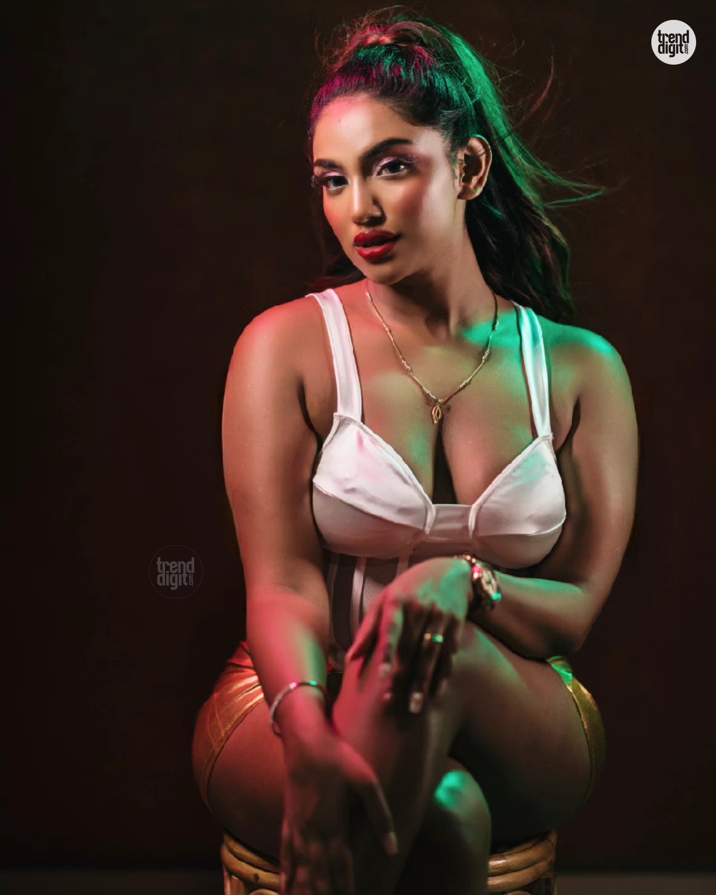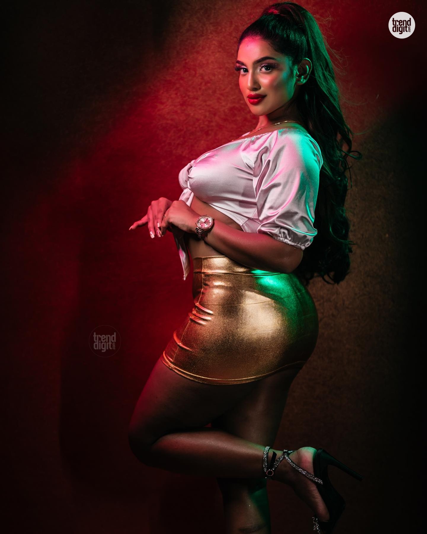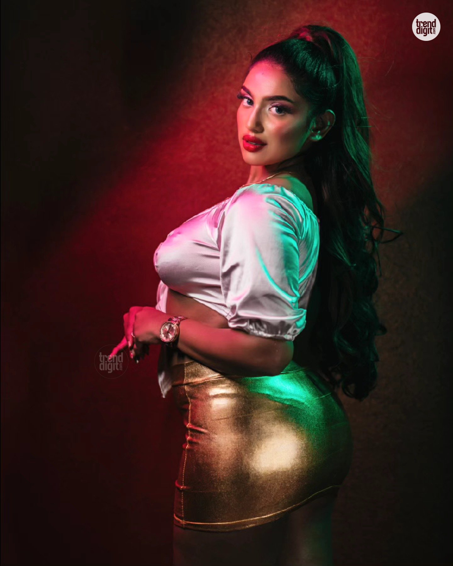 Christina George is a fashion model based in India known for contemporary styled shoots. This outfit feature is captured in a studio setting using dual-tone lighting with red and green hues. The backdrop enhances the contrast and keeps the focus on styling details.