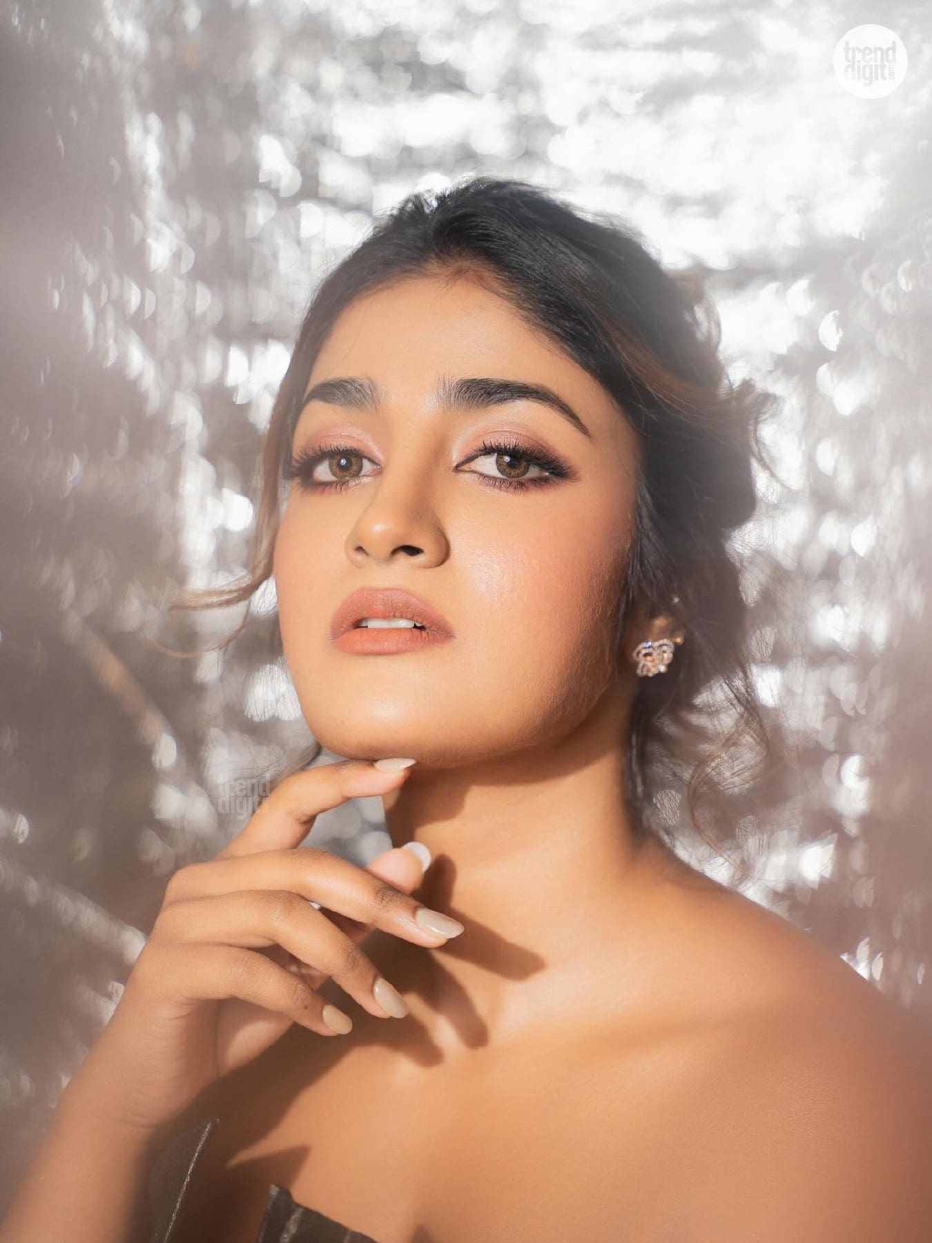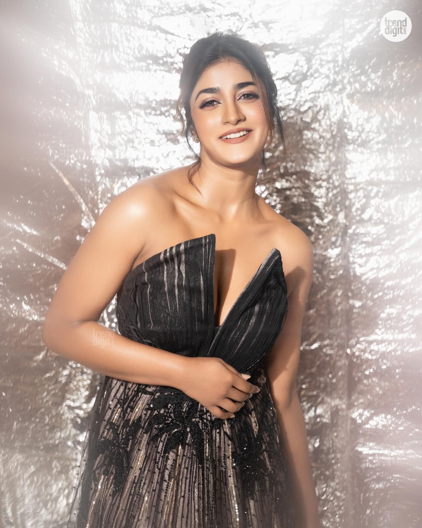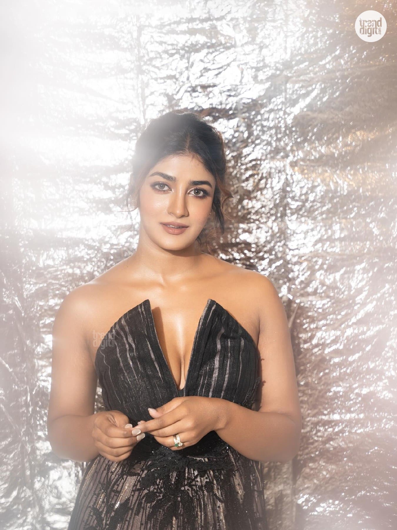 Dimple Hayathi appears in a black embellished gown captured in a softly diffused studio environment. The metallic backdrop reflects light subtly, creating depth and texture around the silhouette.