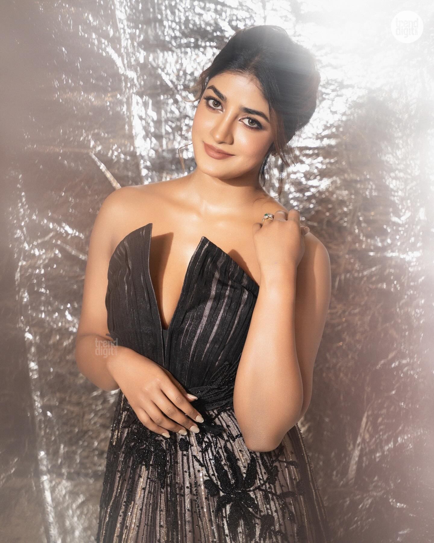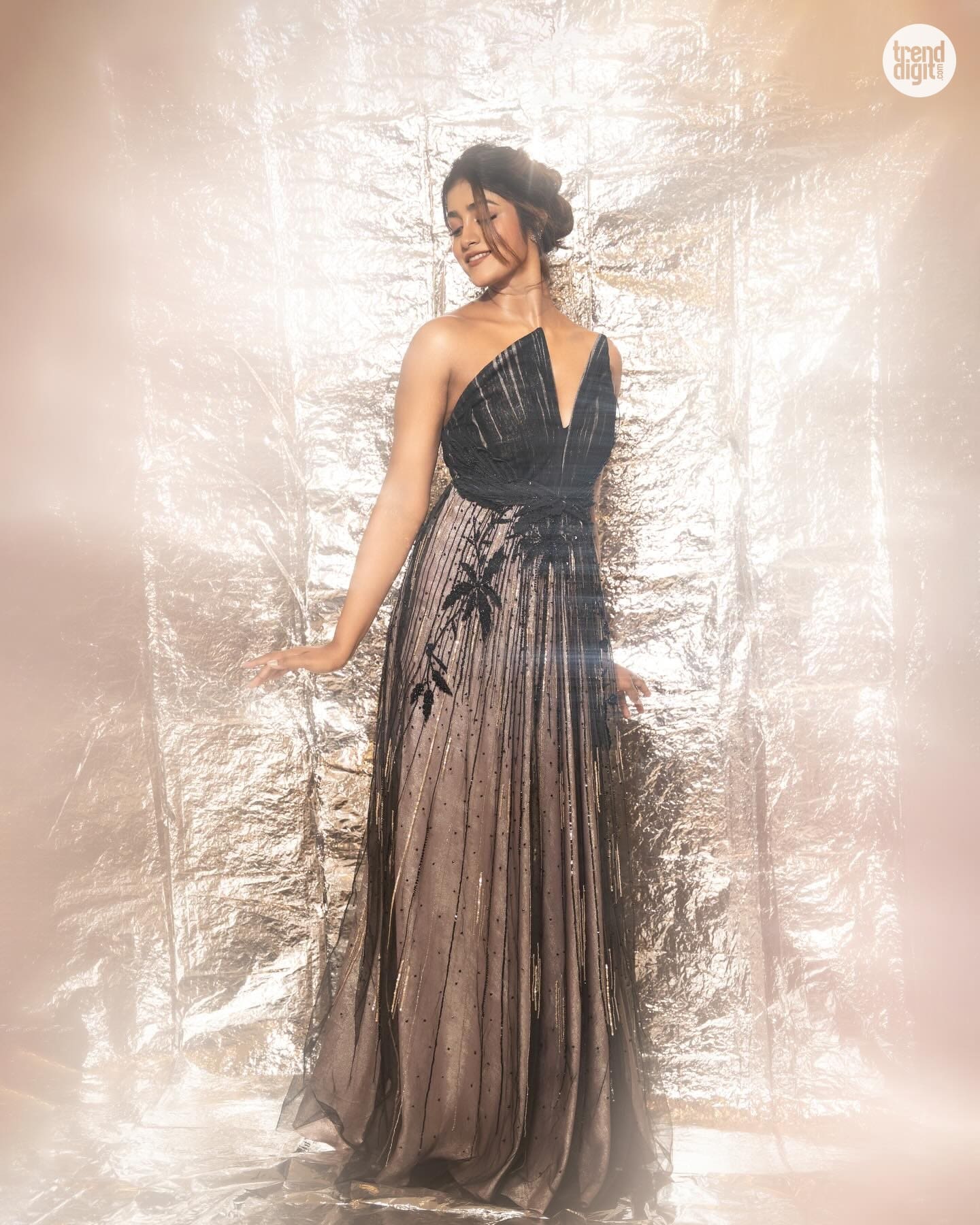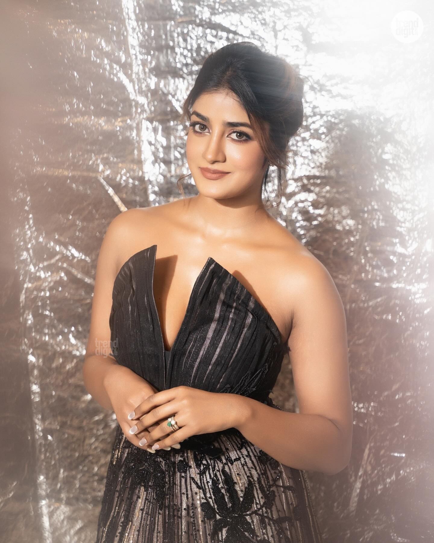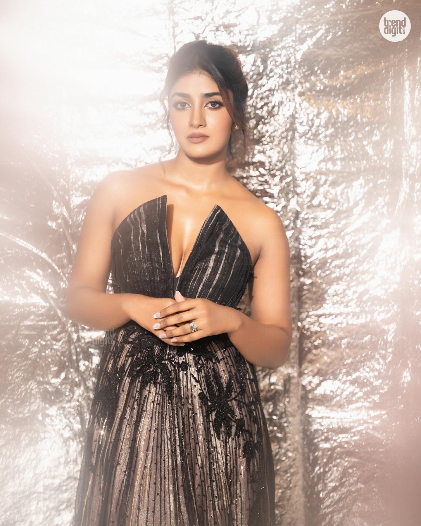 Dimple Hayathi dazzles in a black embellished gown with sheer detailing, styled in a soft-lit studio setup that highlights texture and movement.