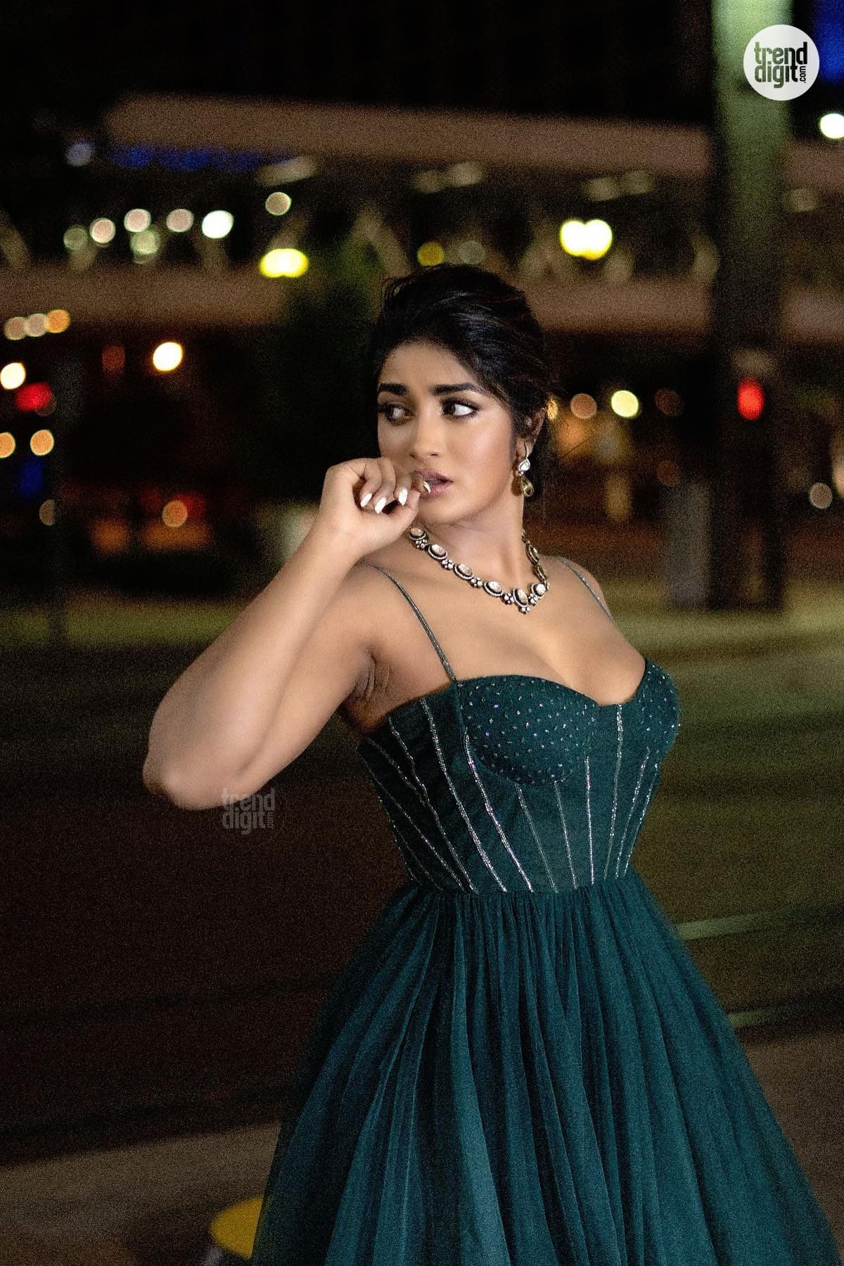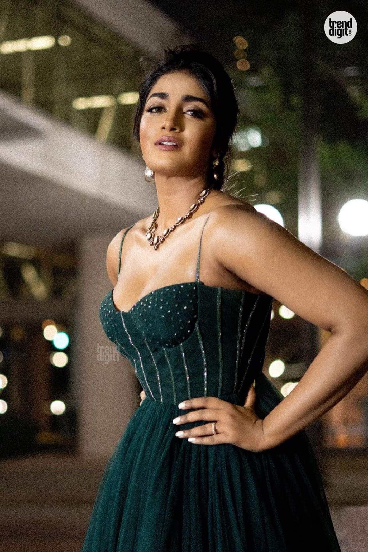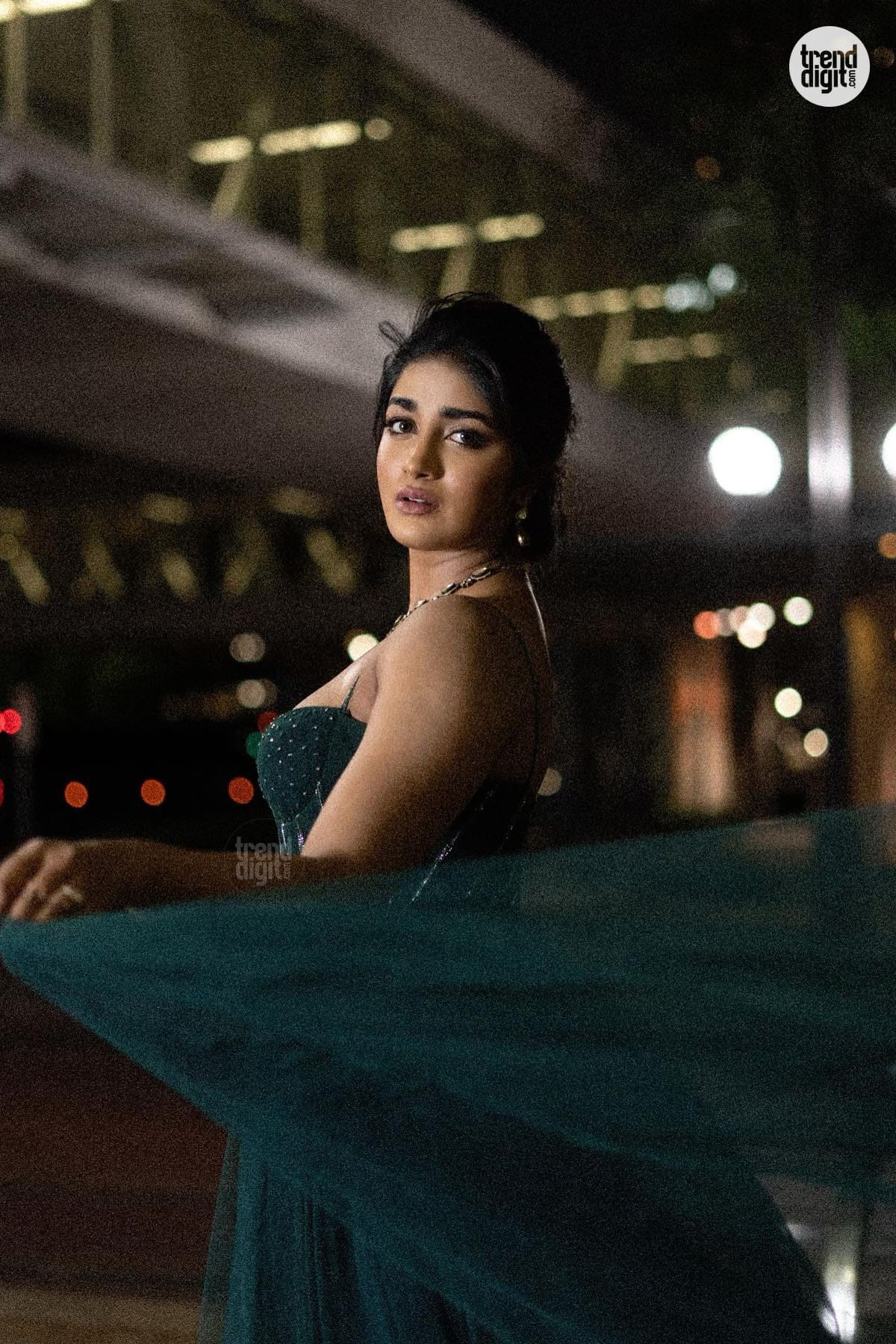 Dimple Hayathi is an Indian actress known for her work in Telugu cinema. This photoshoot features her wearing a dark green embellished gown captured outdoors at night with warm ambient lighting and a softly blurred architectural backdrop. The setting enhances the richness of the gown’s tone.