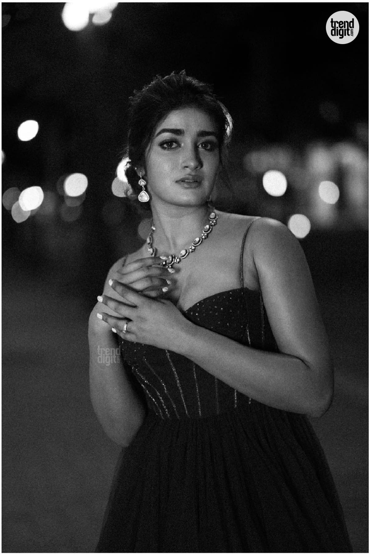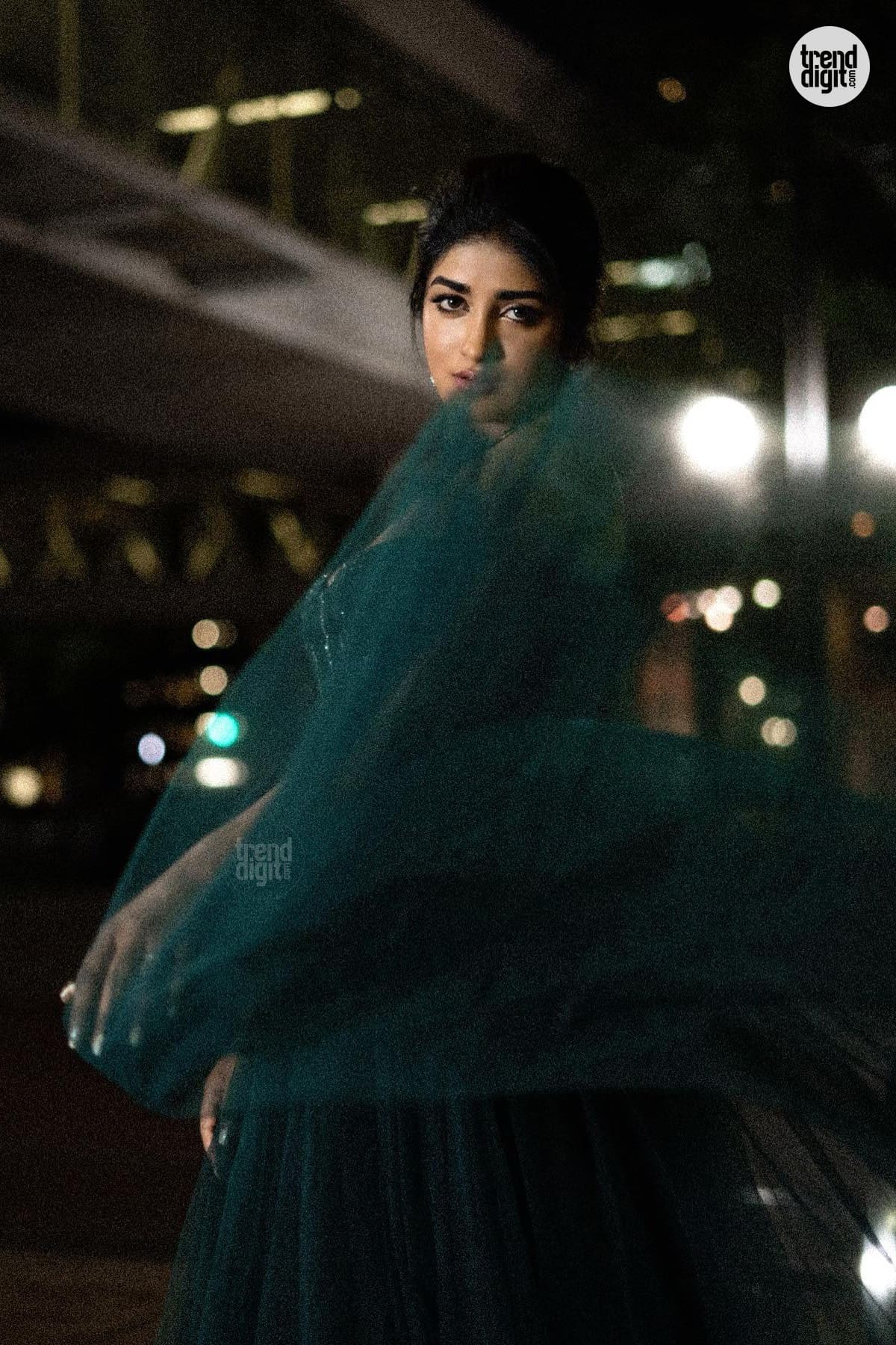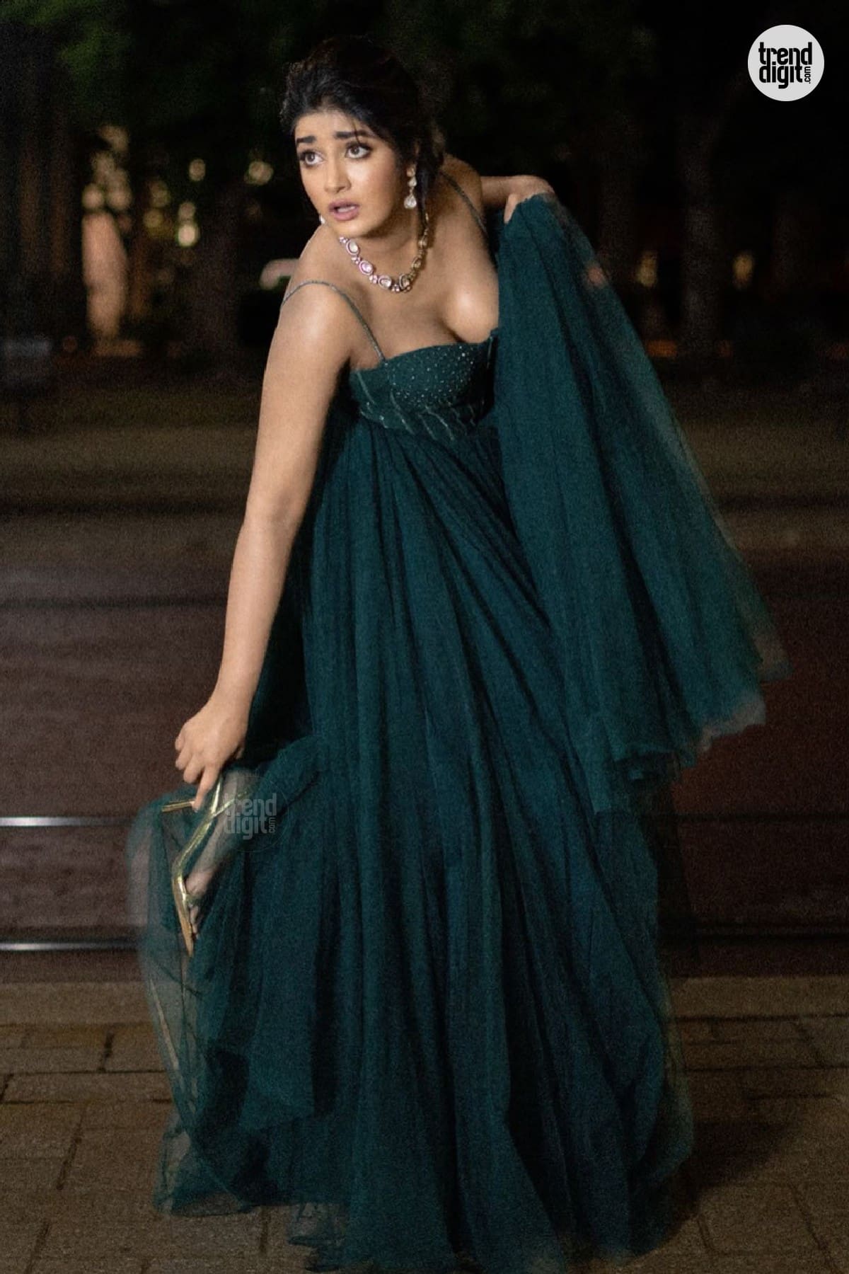 Dimple Hayathi is an Indian actress known for her work in Telugu cinema. This photoshoot features her wearing a dark green embellished gown captured outdoors at night with warm ambient lighting and a softly blurred architectural backdrop. The setting enhances the richness of the gown’s tone.