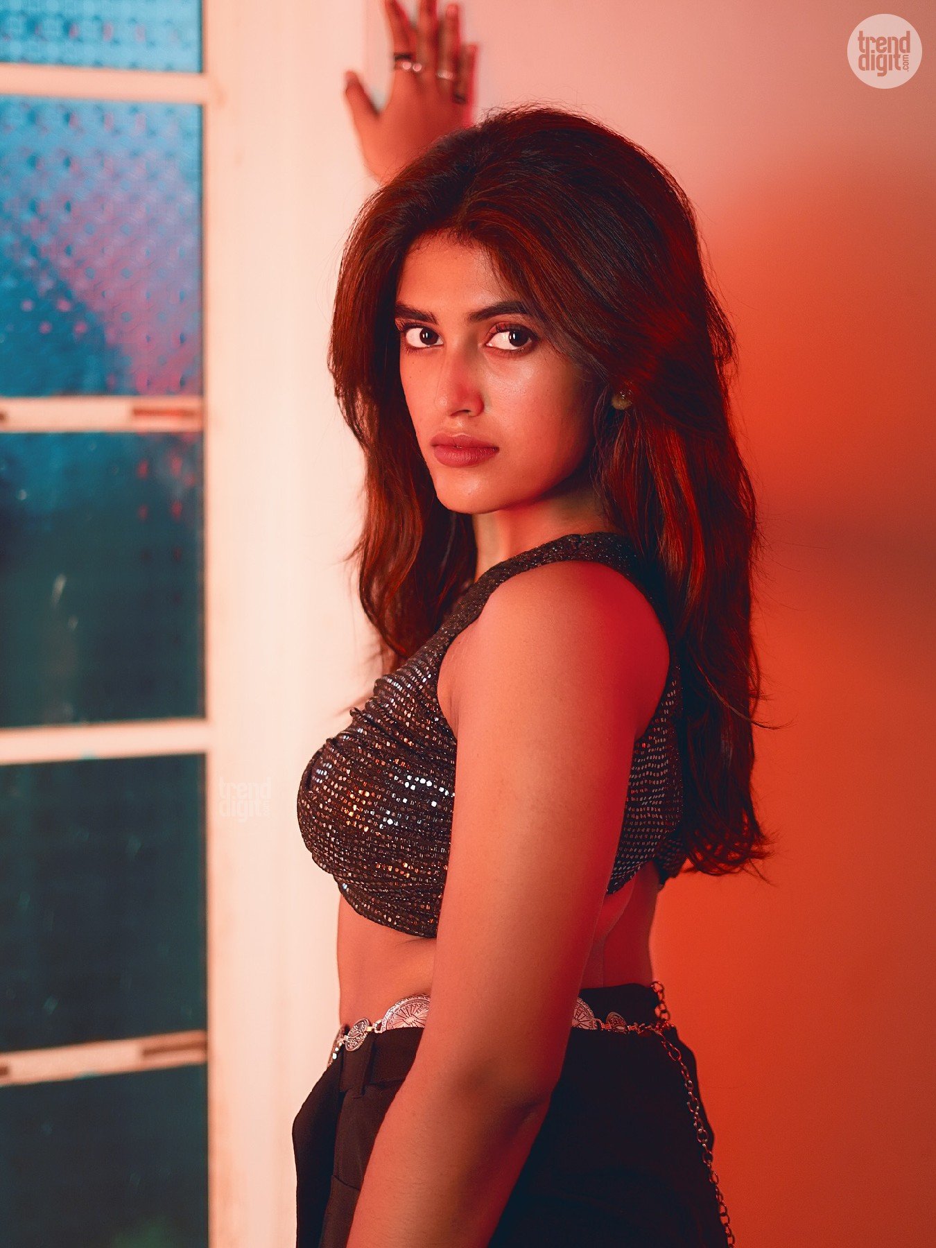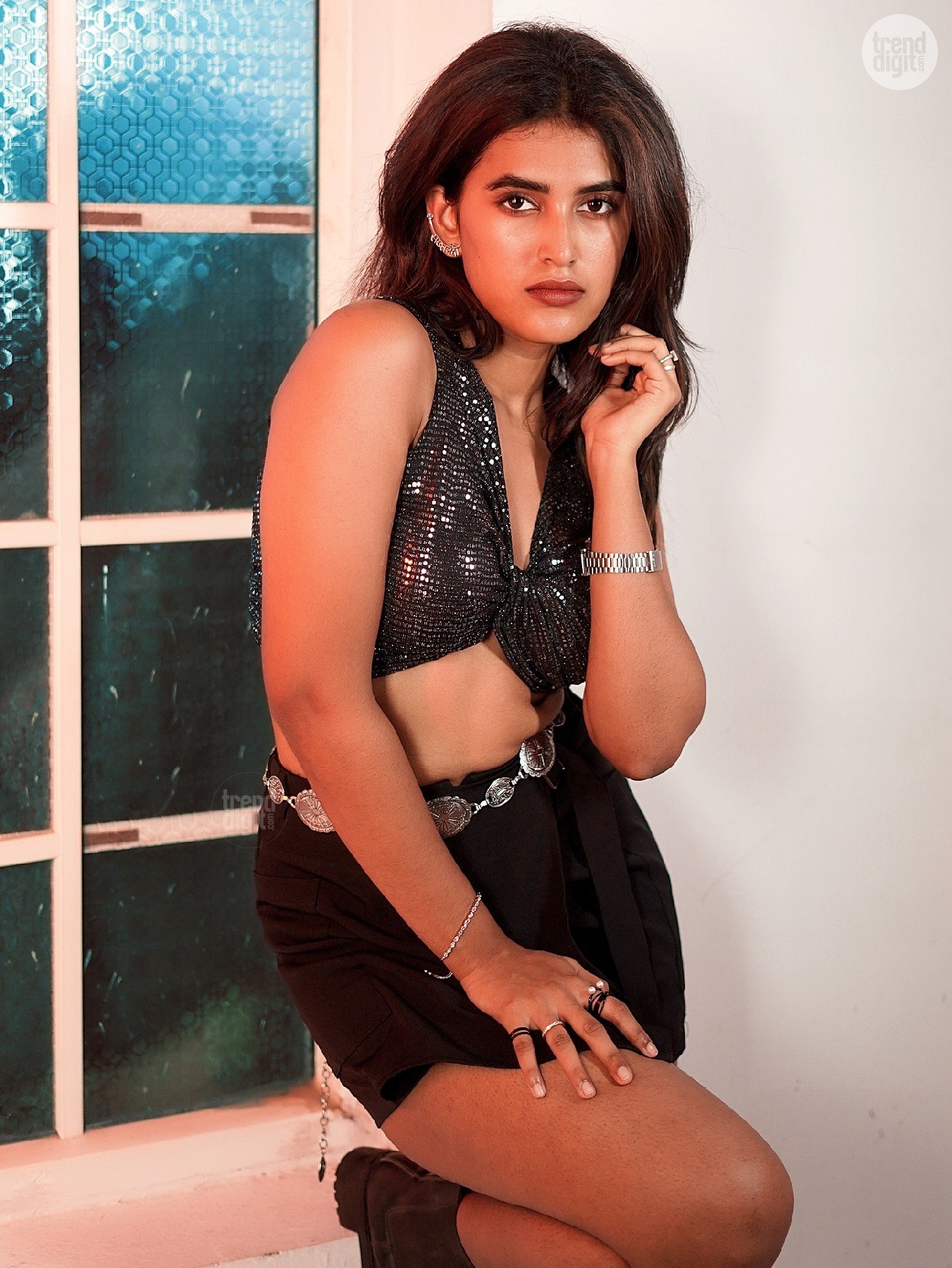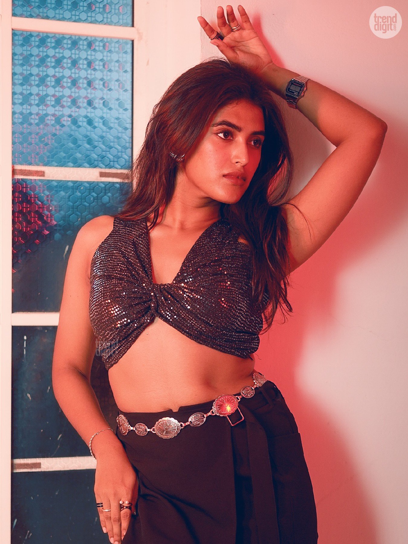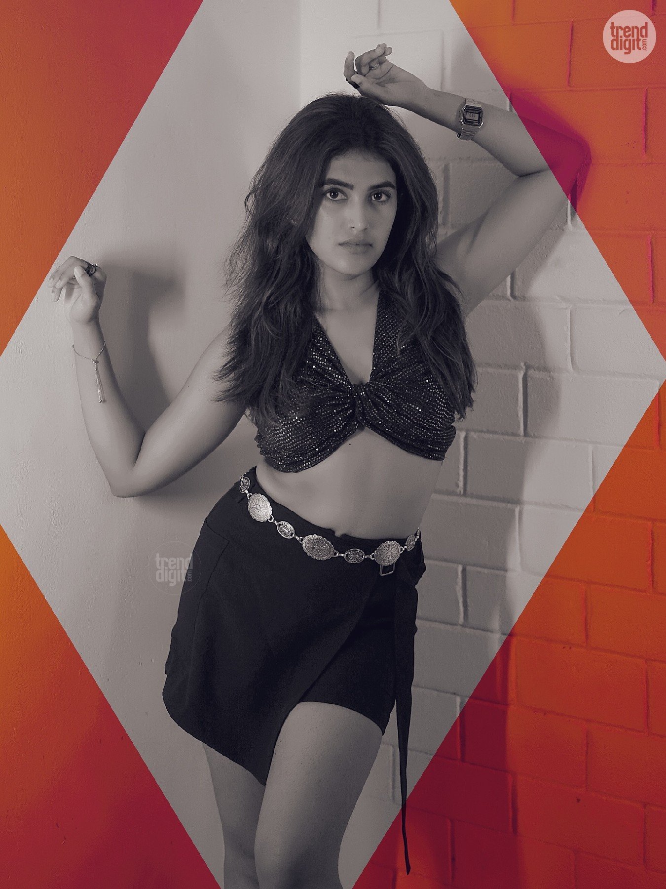 The black outfit features a fitted sequin crop top with a textured shimmer finish. It is paired with a structured skirt accented by a metallic waist belt. Minimal jewellery and sleek styling keep the focus on silhouette and detailing.