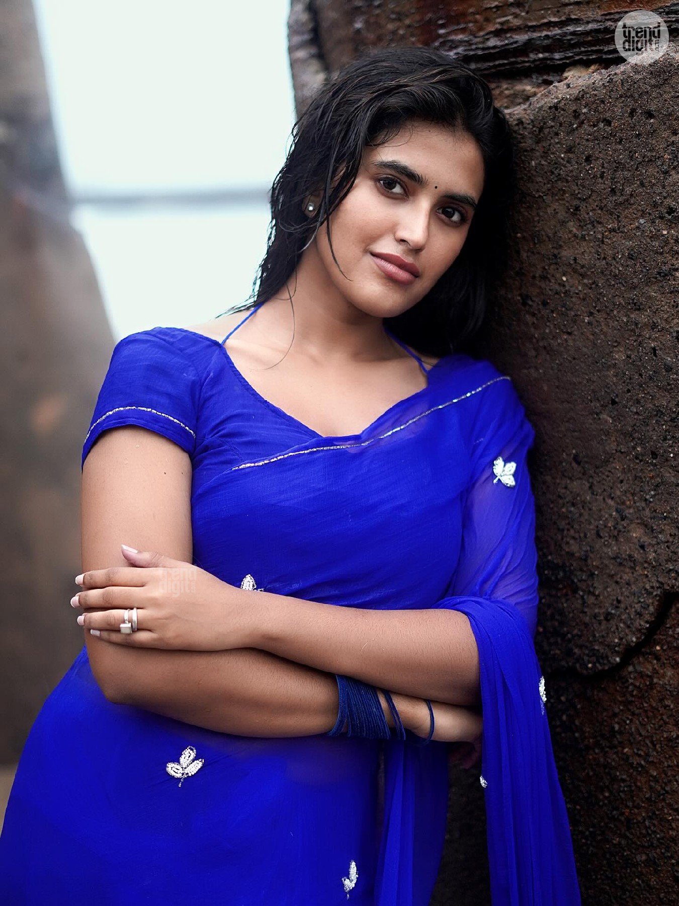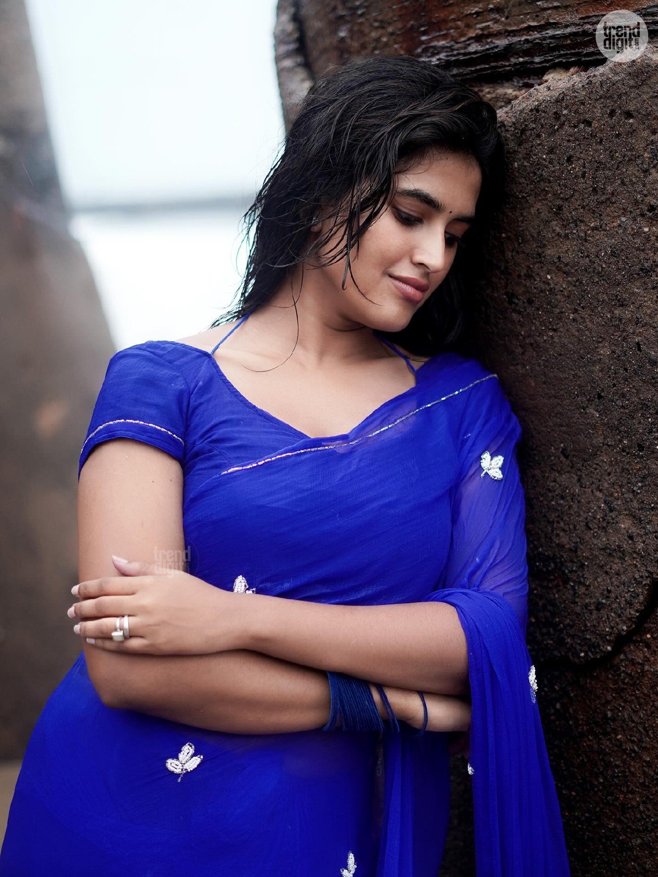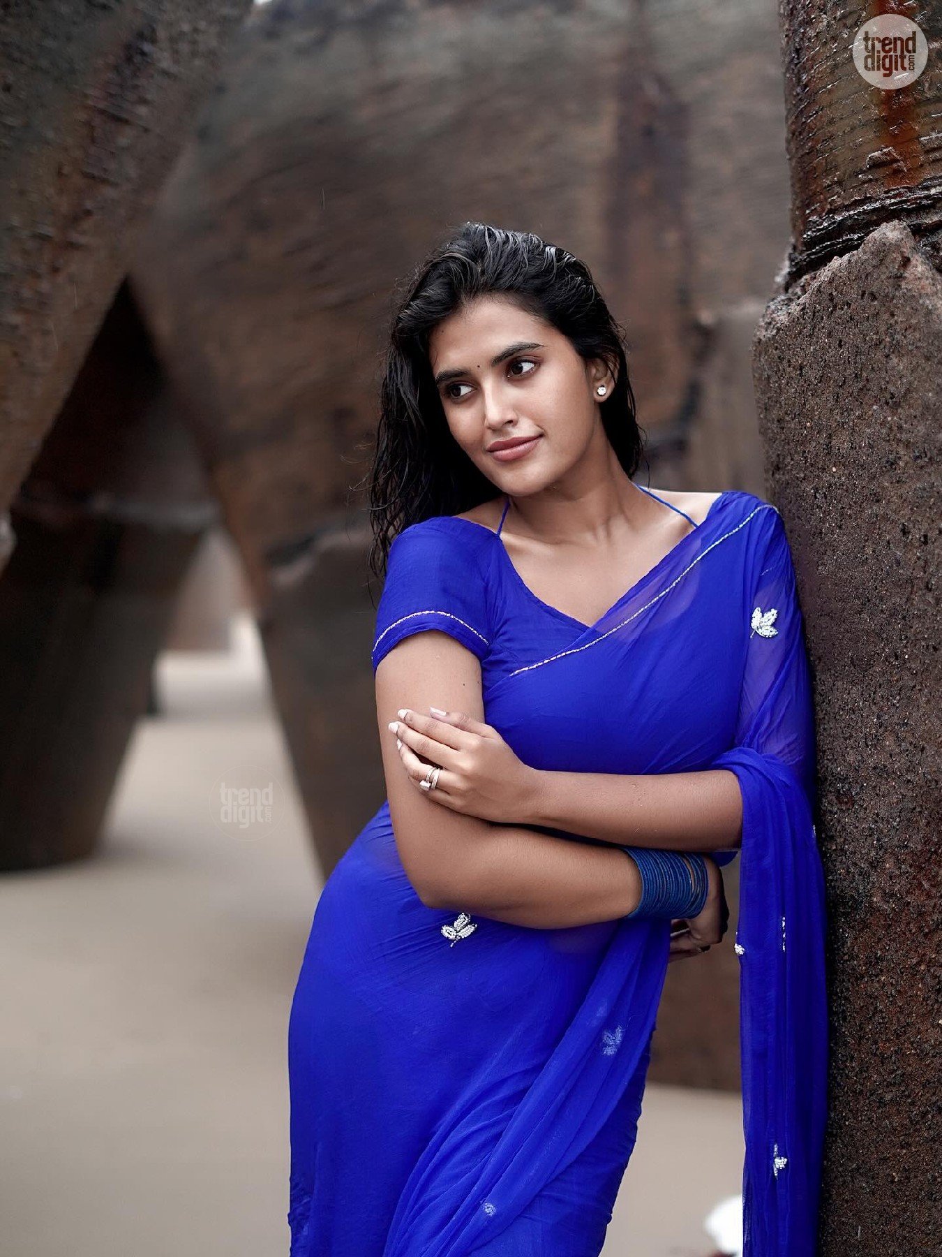 The blue saree features a smooth, lightweight fabric with a semi-sheer drape. Subtle embellishments add delicate detailing without overpowering the design. Jewellery remains minimal with stud earrings and stacked bangles, maintaining a refined balance.