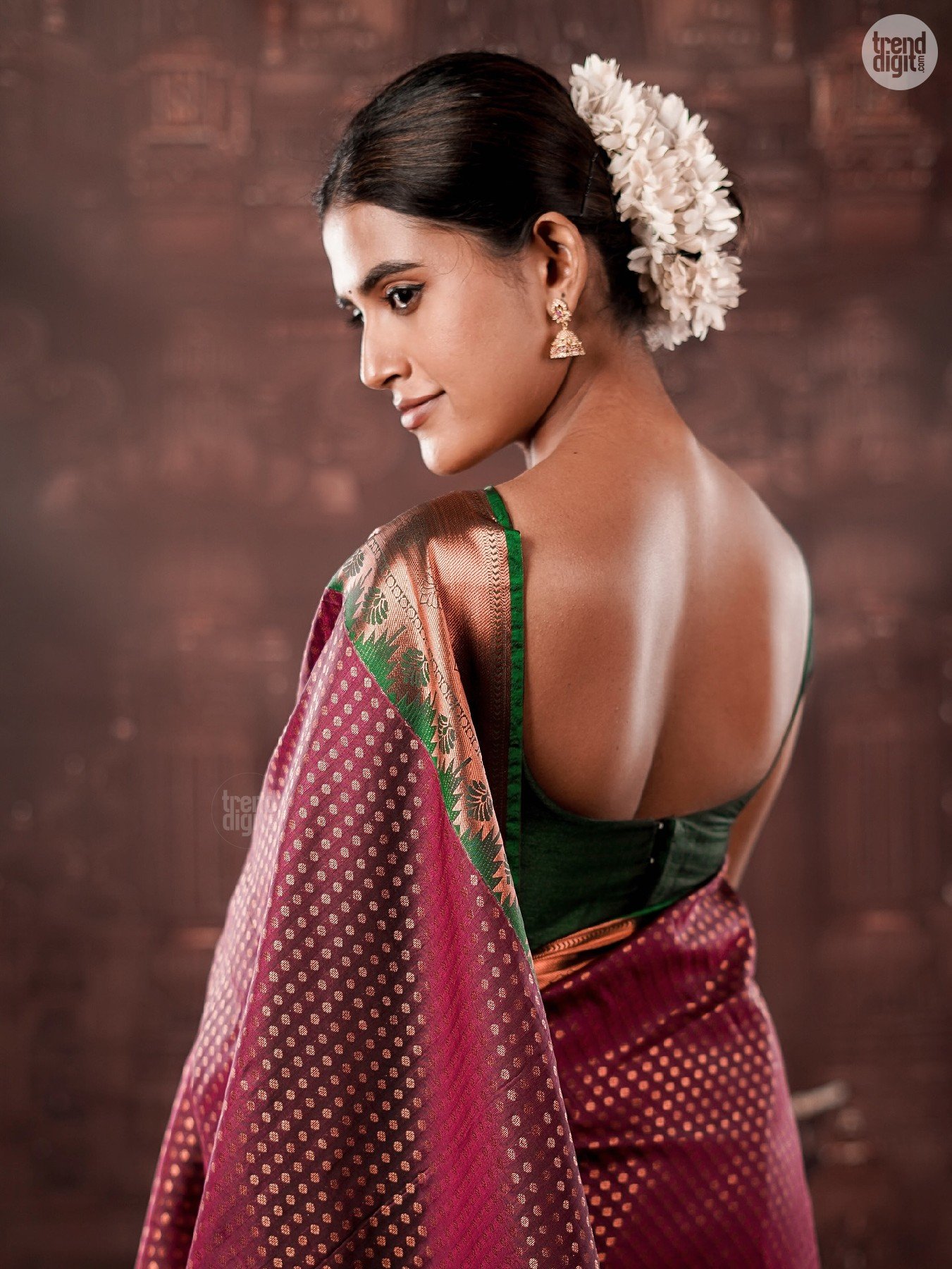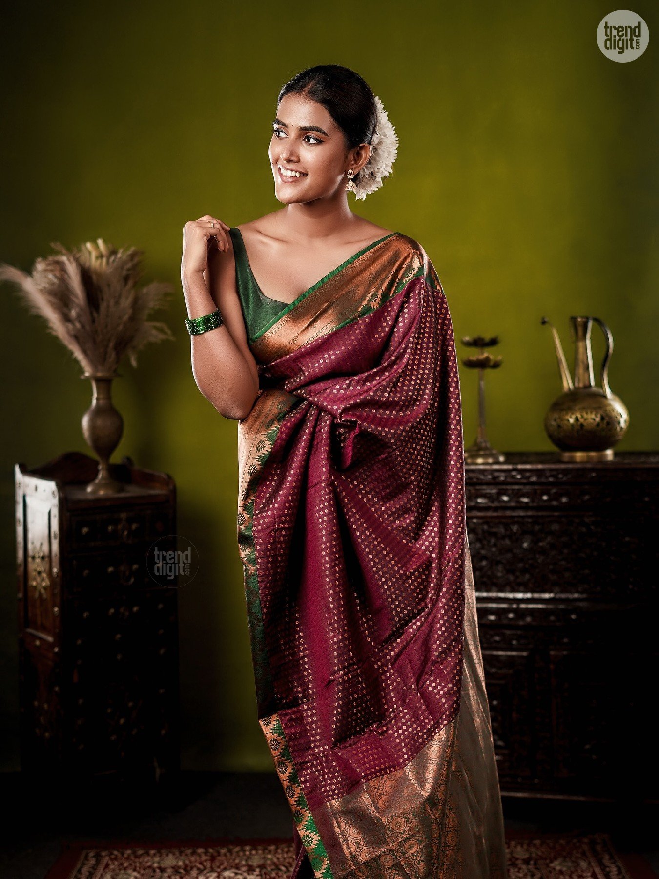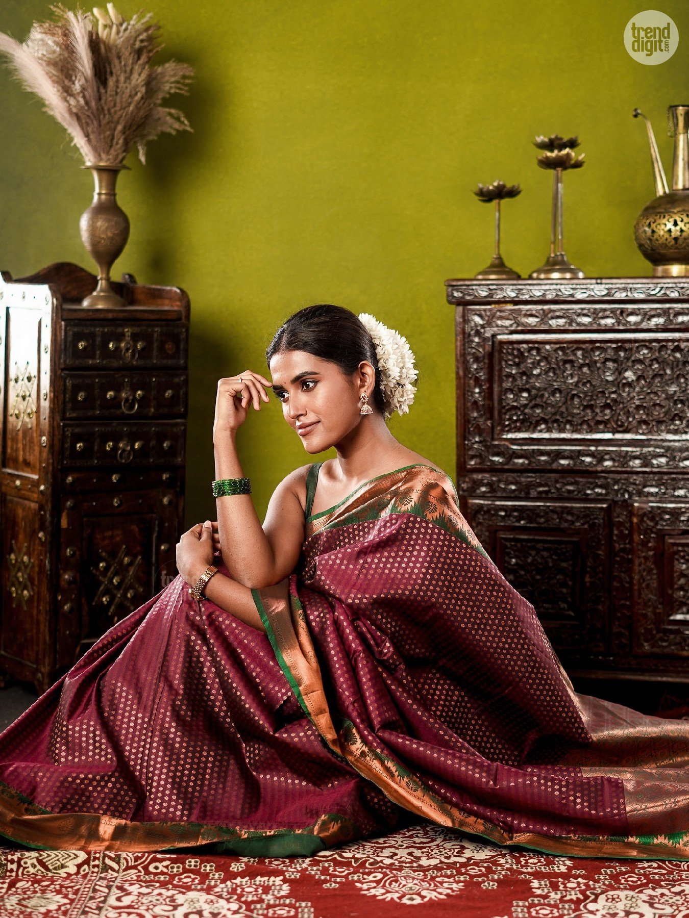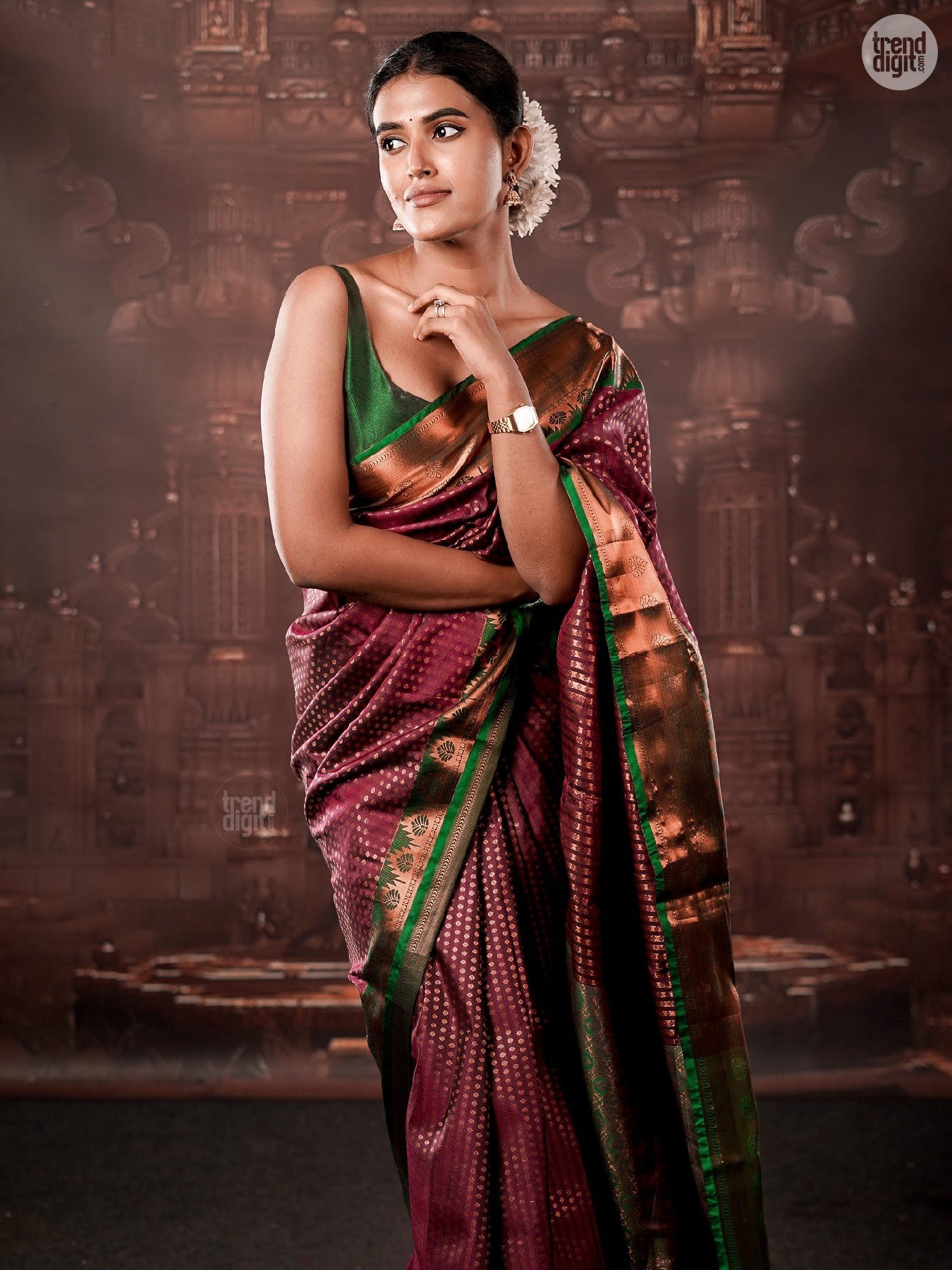 Divya Saravanan is a Chennai-based model and fashion creator known for culturally inspired styling. This photoshoot is captured indoors in a controlled studio environment with a heritage-inspired backdrop. Warm lighting enhances the fabric’s depth and detailing.