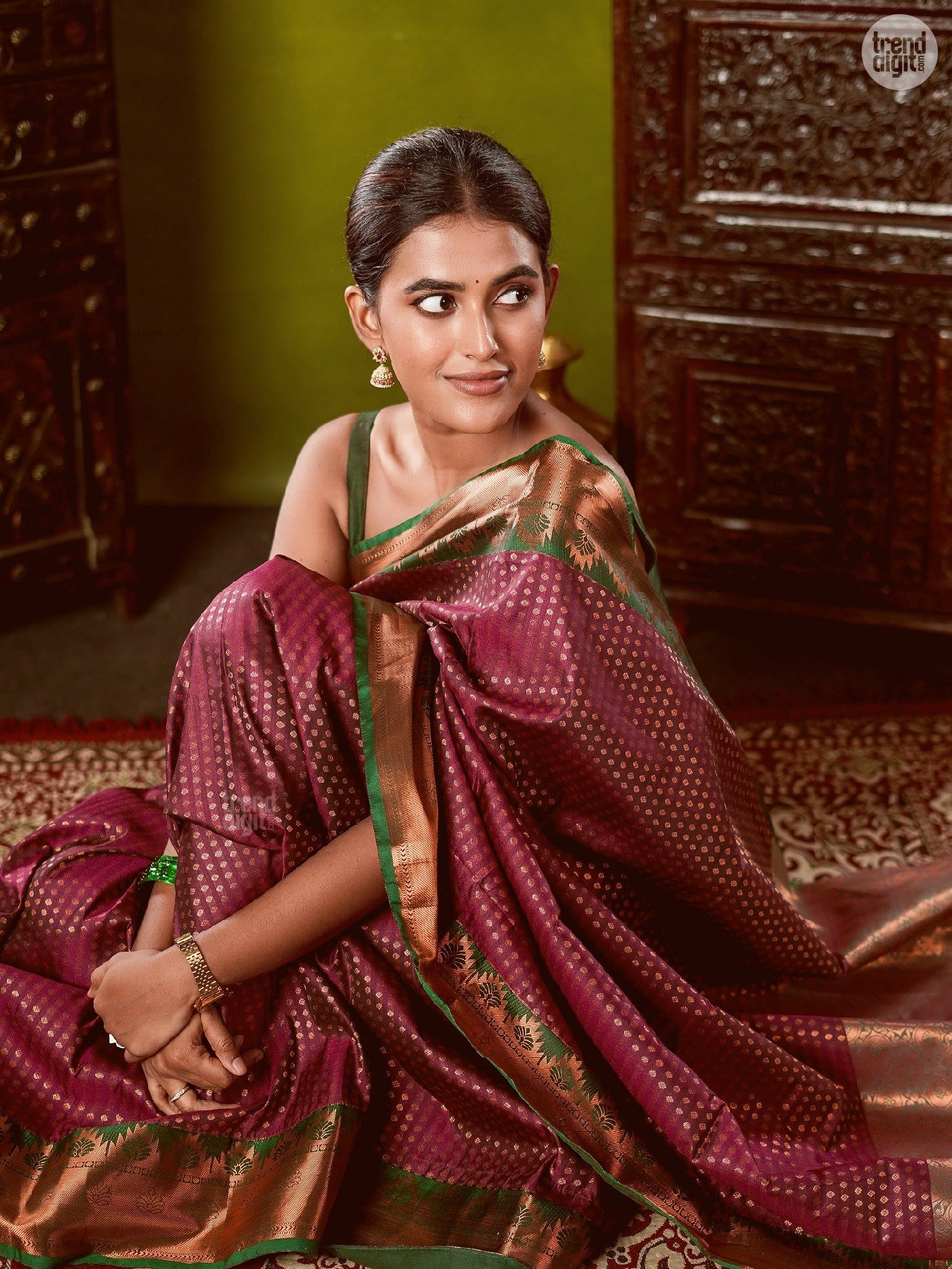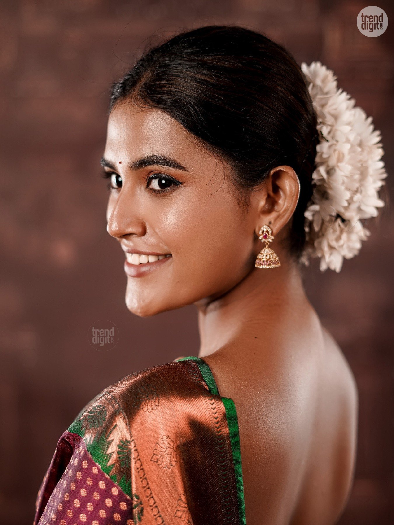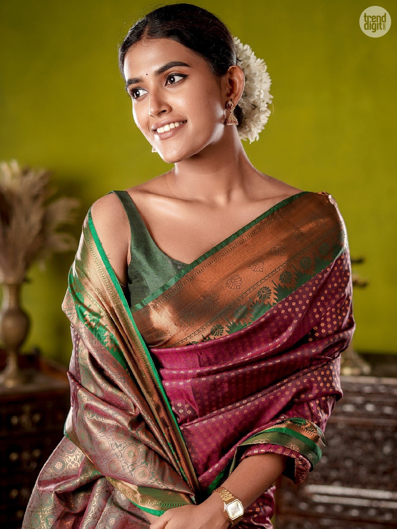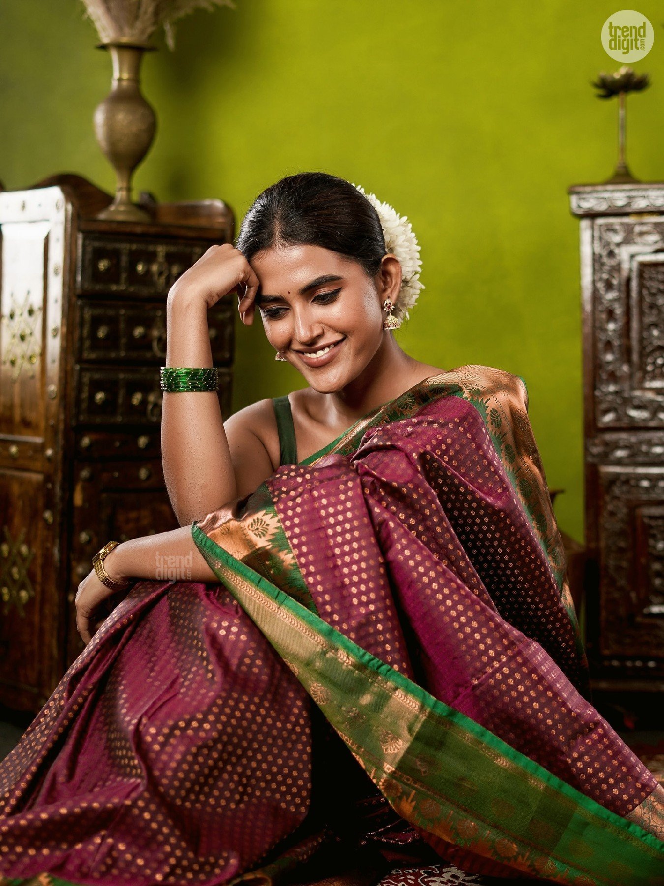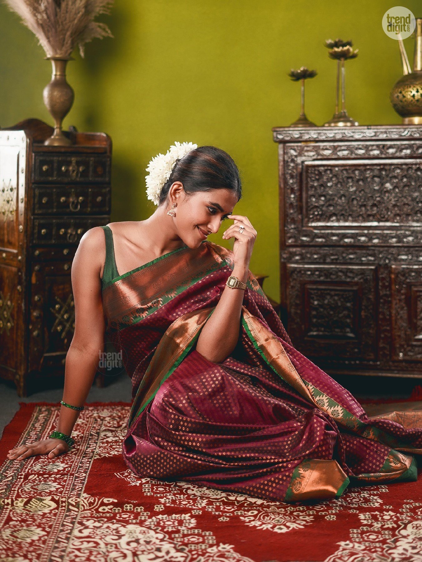 Divya Saravanan is a Chennai-based model and fashion creator known for culturally inspired styling. This photoshoot is captured indoors in a controlled studio environment with a heritage-inspired backdrop. Warm lighting enhances the fabric’s depth and detailing.