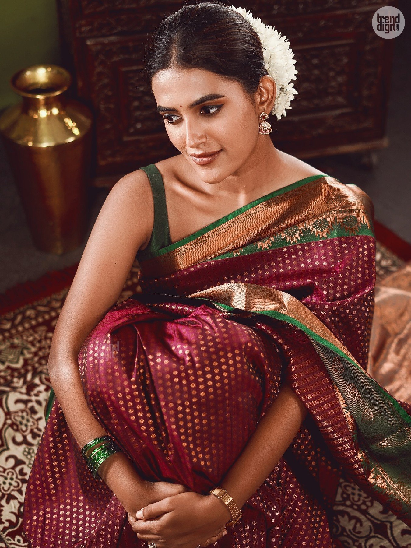 The maroon silk saree features intricate gold motifs woven across the body with a contrasting border. The structured pleats maintain a classic silhouette, complemented by a sleeveless blouse. Traditional earrings and stacked bangles complete the ensemble.