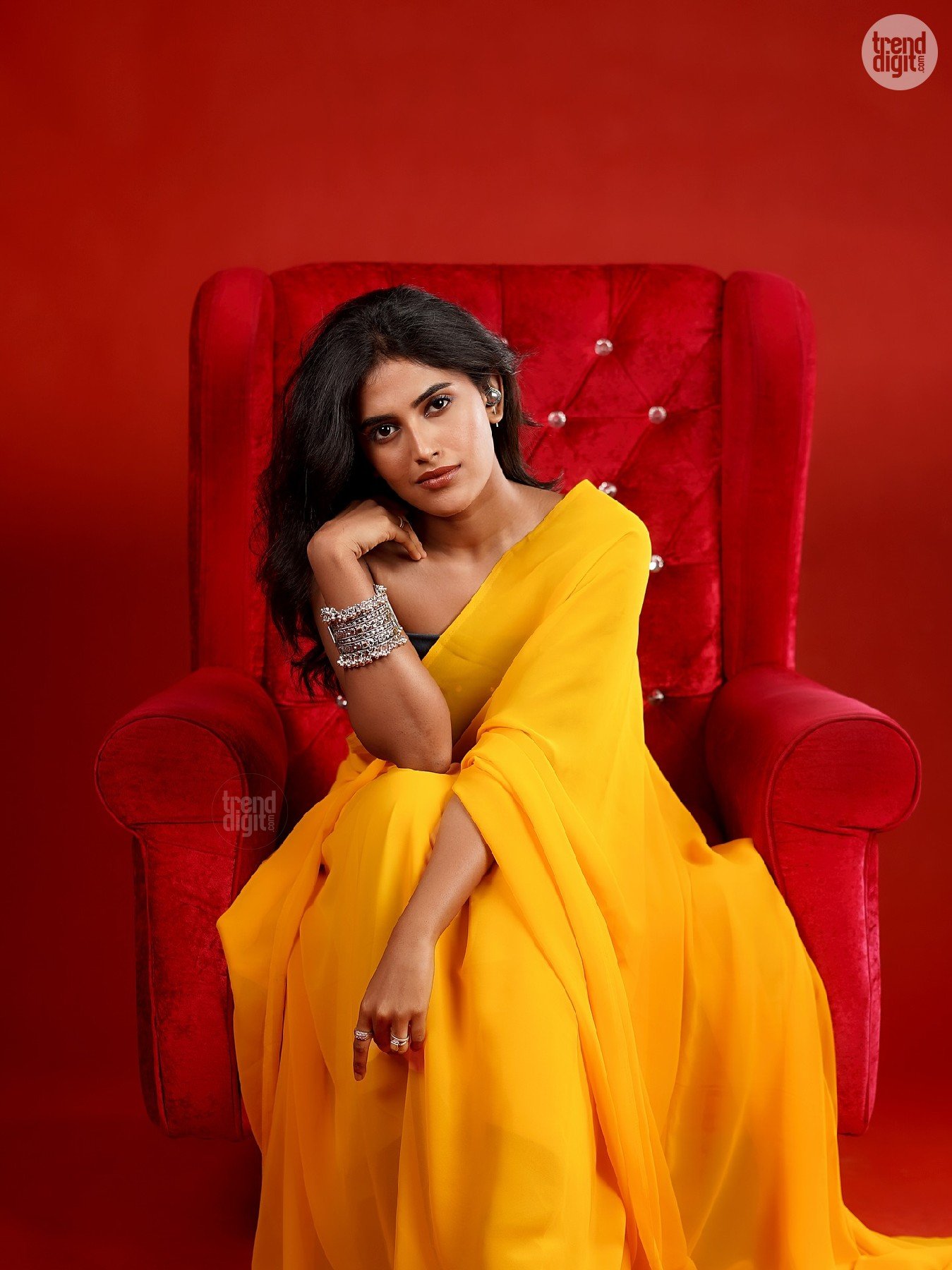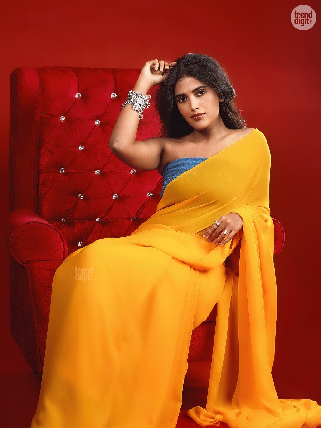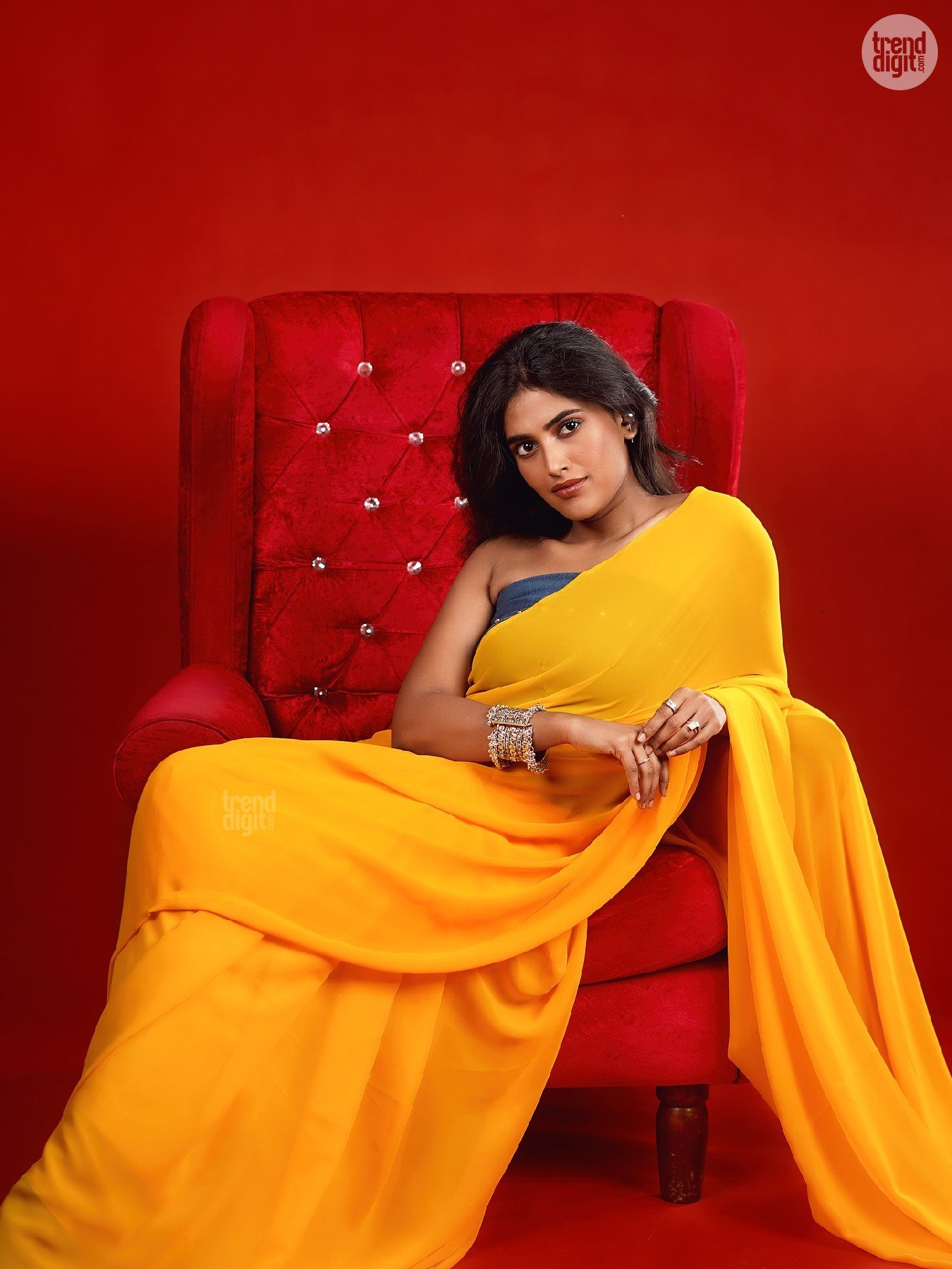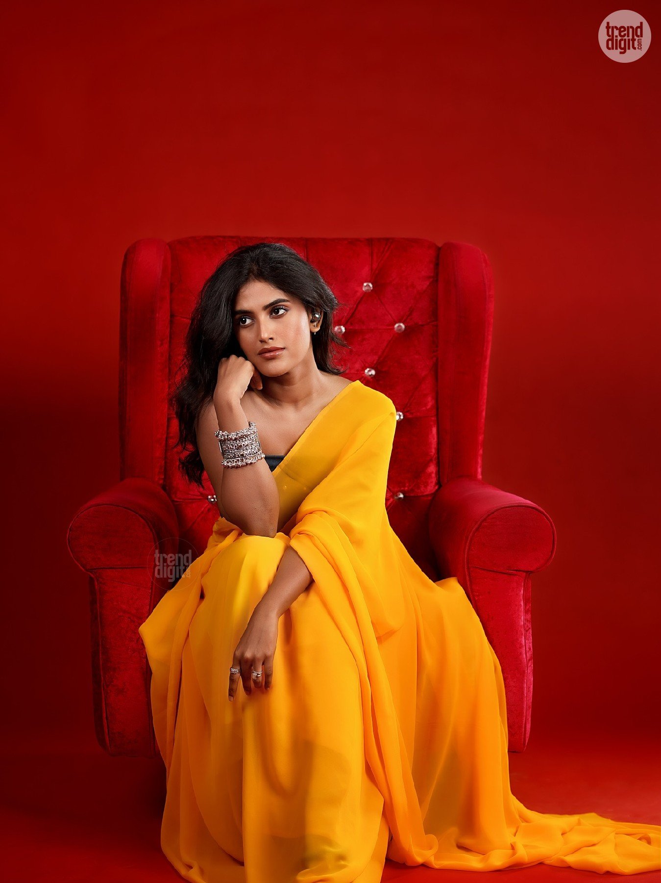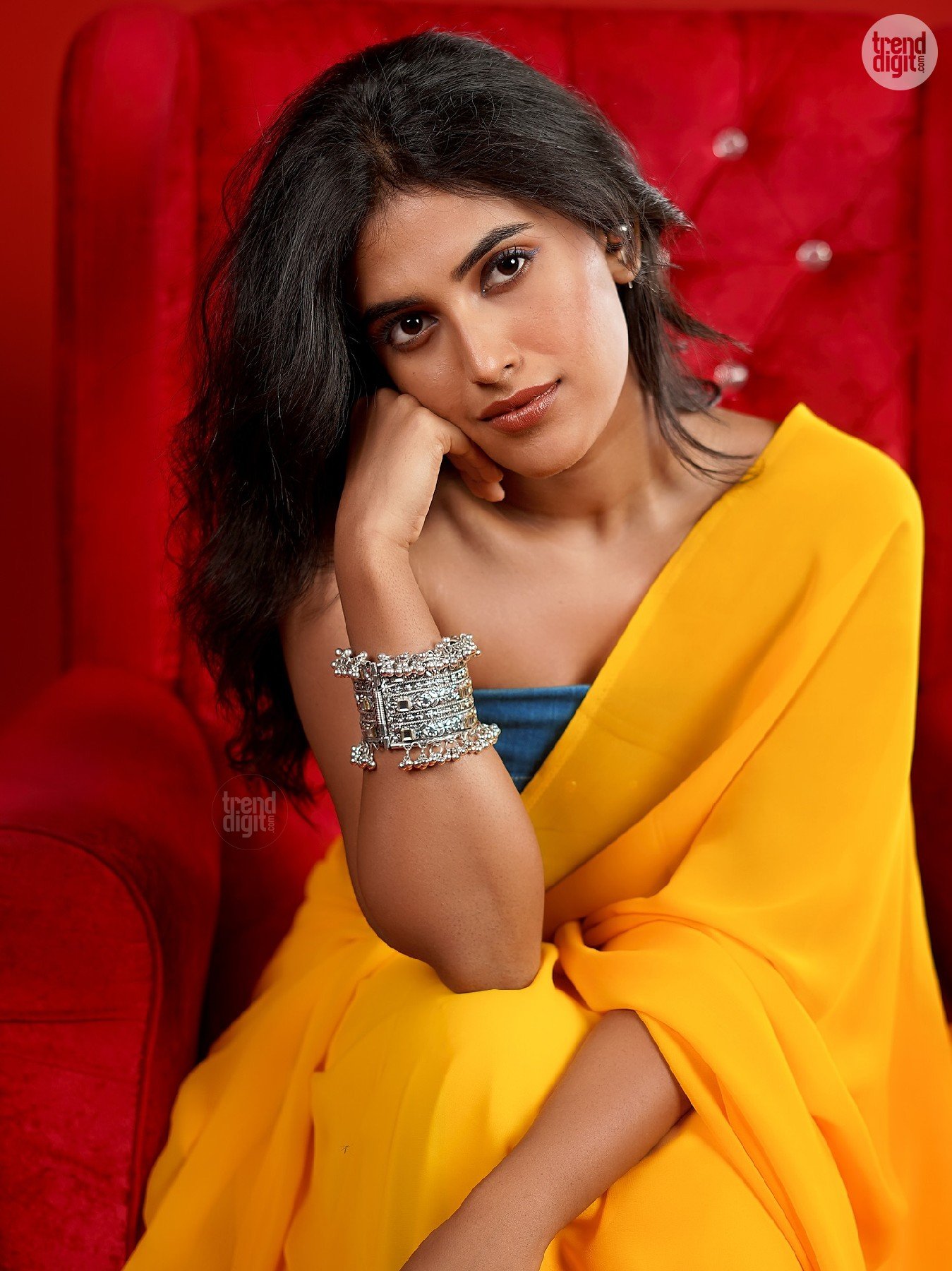 The yellow saree features a fluid, lightweight fabric with a smooth drape and matte finish. It is layered over a structured dark blouse, creating visual depth. She pairs the look with statement silver cuff bangles and minimal additional jewellery, keeping the styling clean yet impactful.