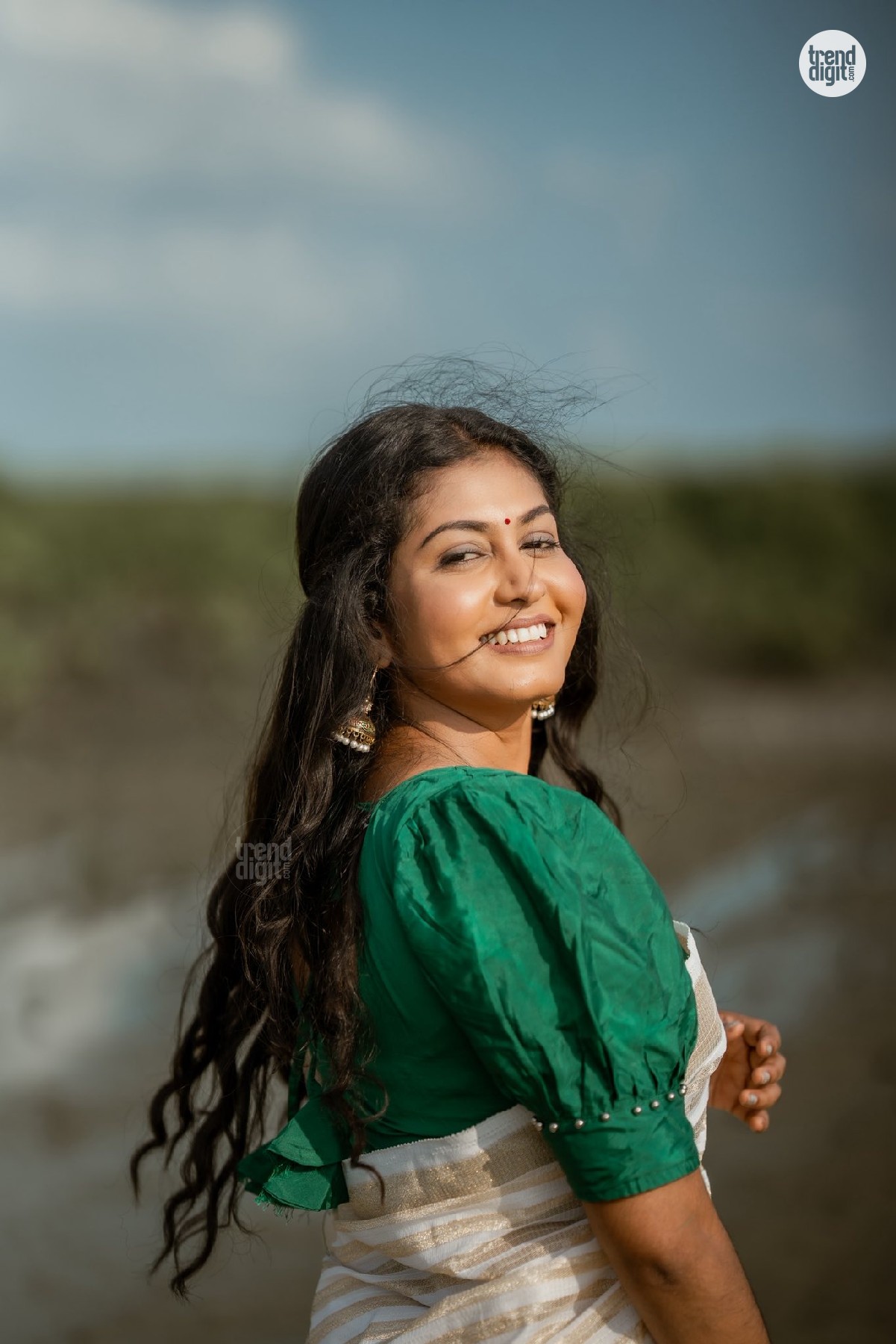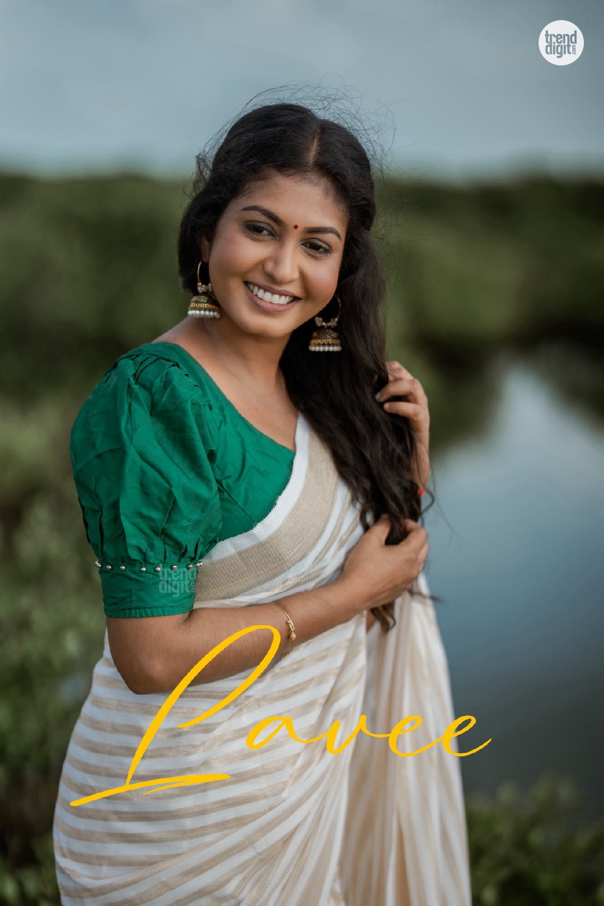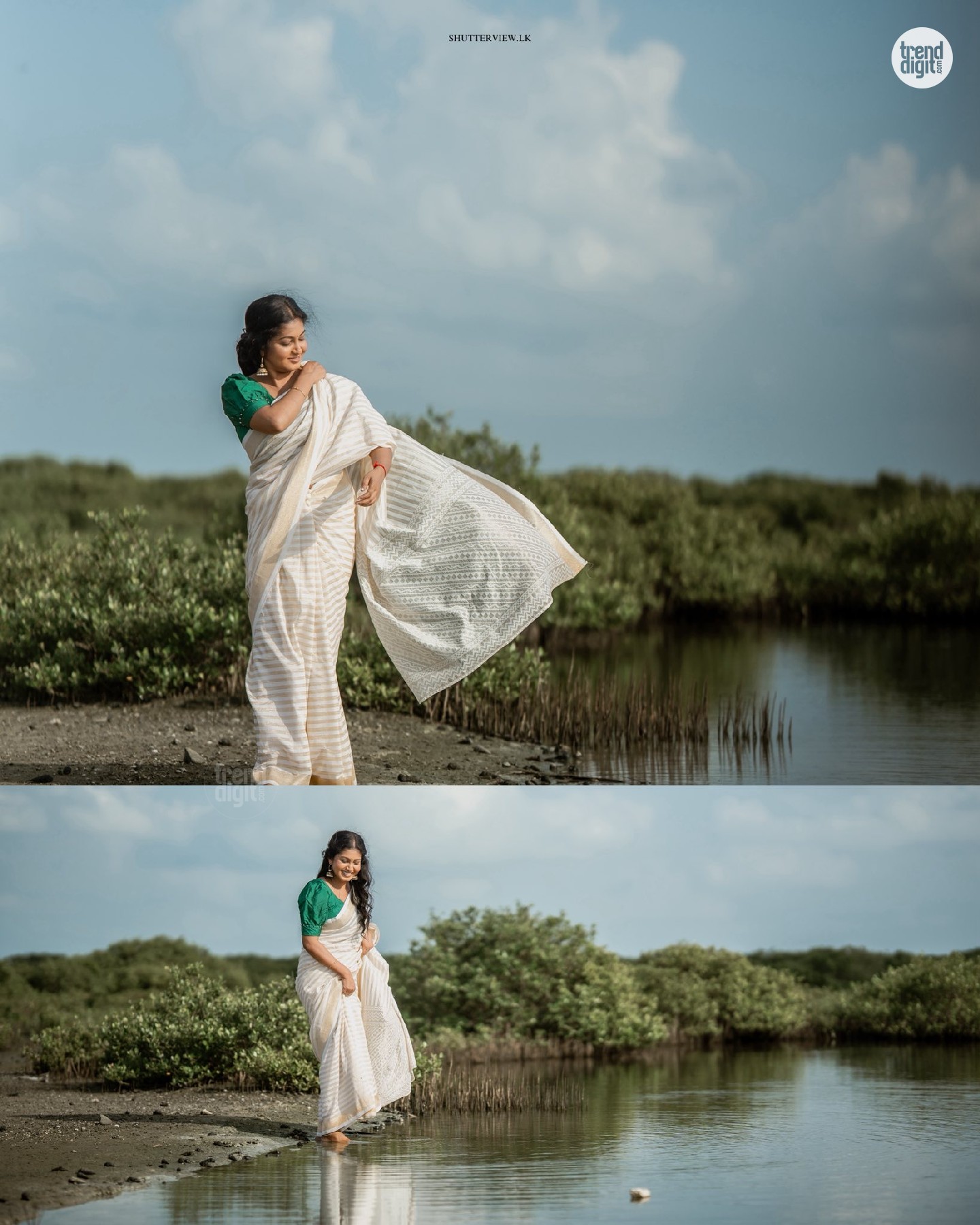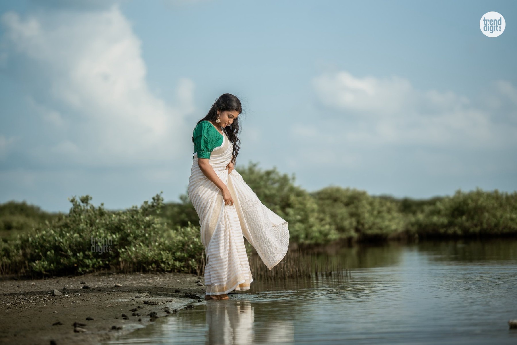 Lavanja is a Sri Lankan Tamil model and dancer associated with fashion and cultural photoshoots. This Lavanja Cream Kasavu Saree feature is captured outdoors near a calm waterside landscape using soft daylight and natural greenery as the backdrop. The setting highlights the gentle movement of the saree while maintaining a relaxed portrait atmosphere.