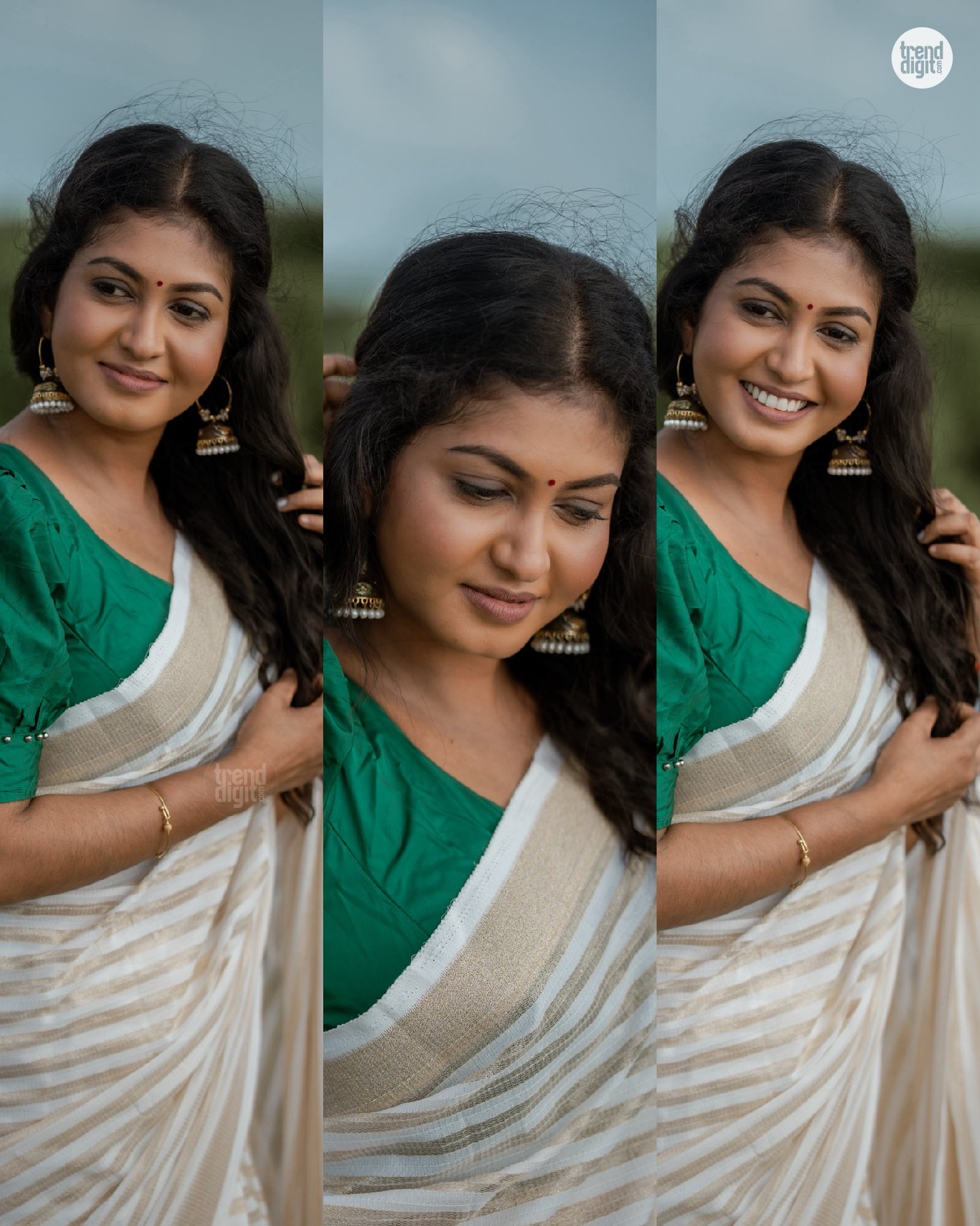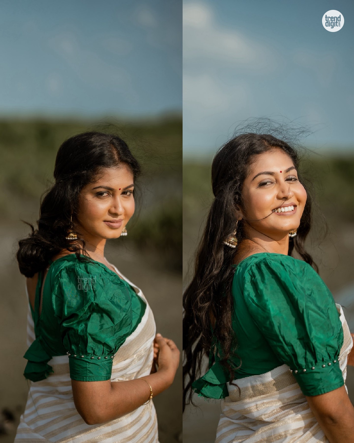 The saree appears in a traditional cream kasavu fabric with soft gold horizontal borders and a lightweight drape that moves naturally in the breeze. It is paired with a vibrant green blouse featuring puff sleeves and subtle bead details. Accessories remain minimal, with classic jhumka earrings and a small bindi completing the look.