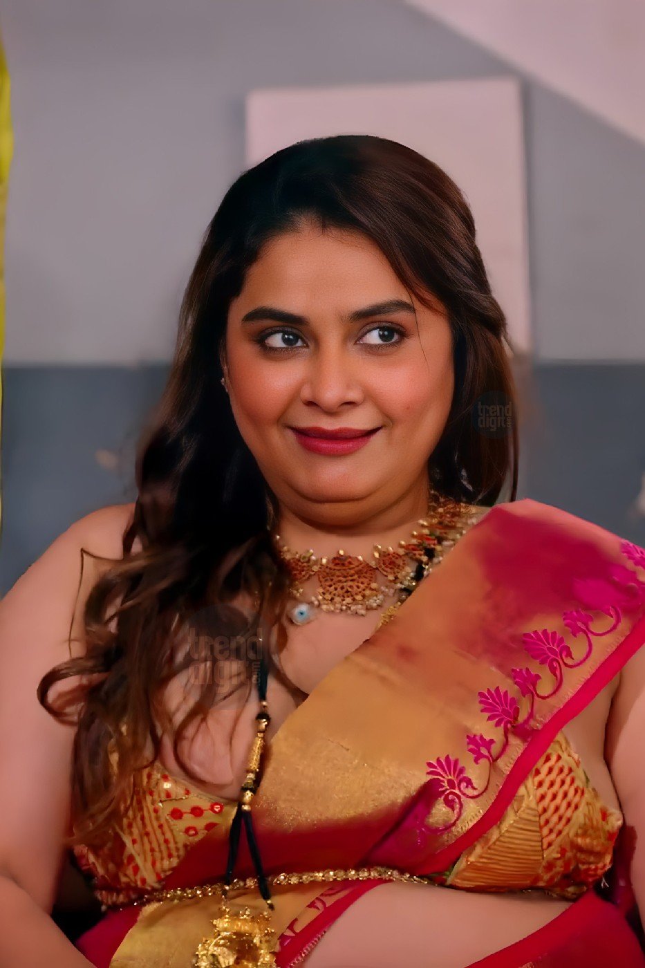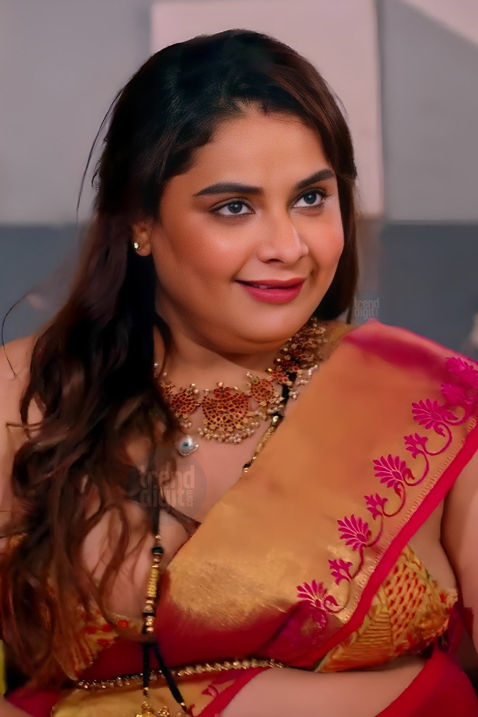 The red-and-gold saree with floral motifs on the pallu further adds visual depth to her character. Warm lighting, close-up shots, and calm indoor backgrounds help convey vulnerability, contemplation, and emotional conflict. Her facial expressions play a crucial role in driving the narrative, making these scenes relatable to viewers.