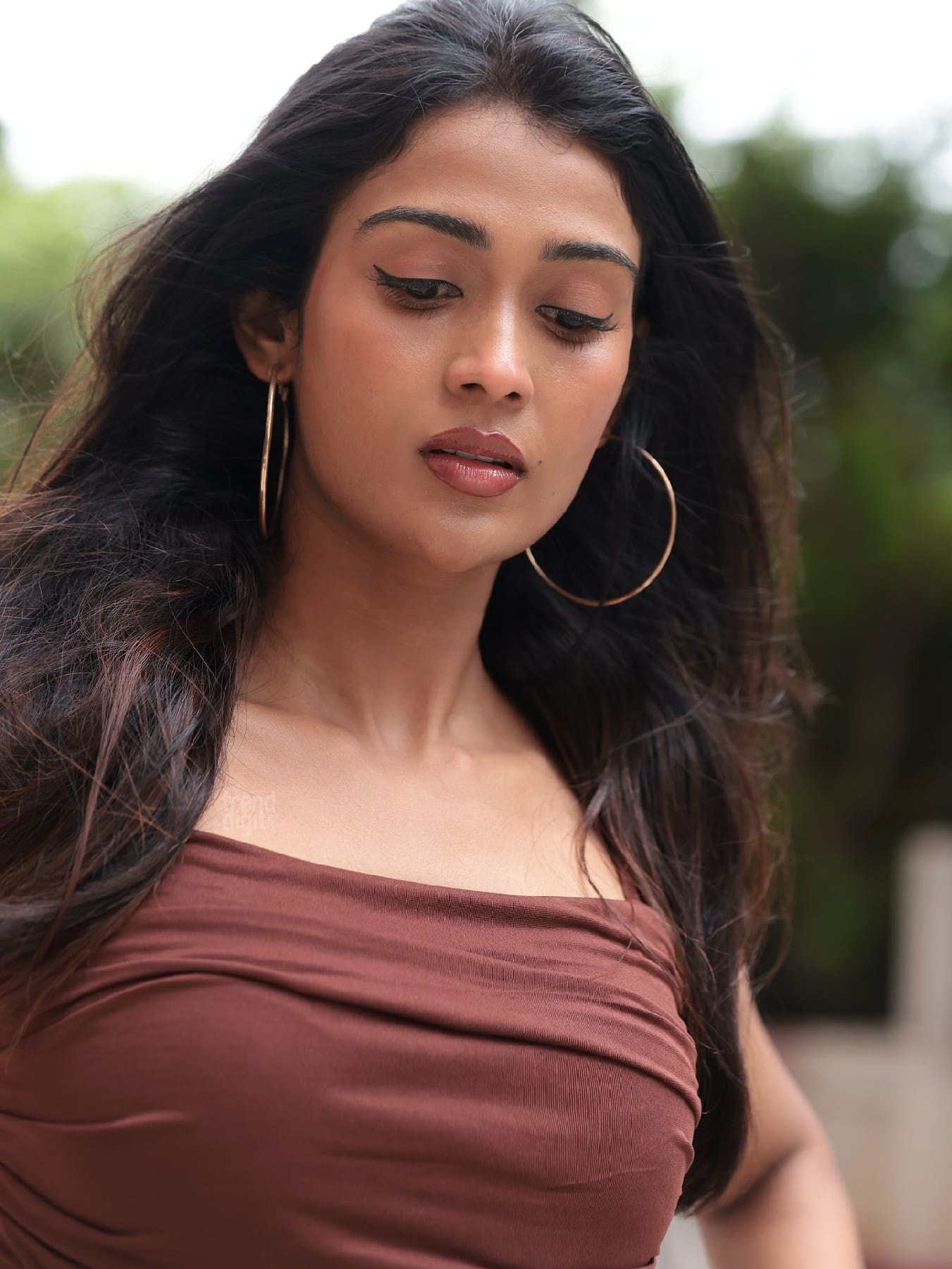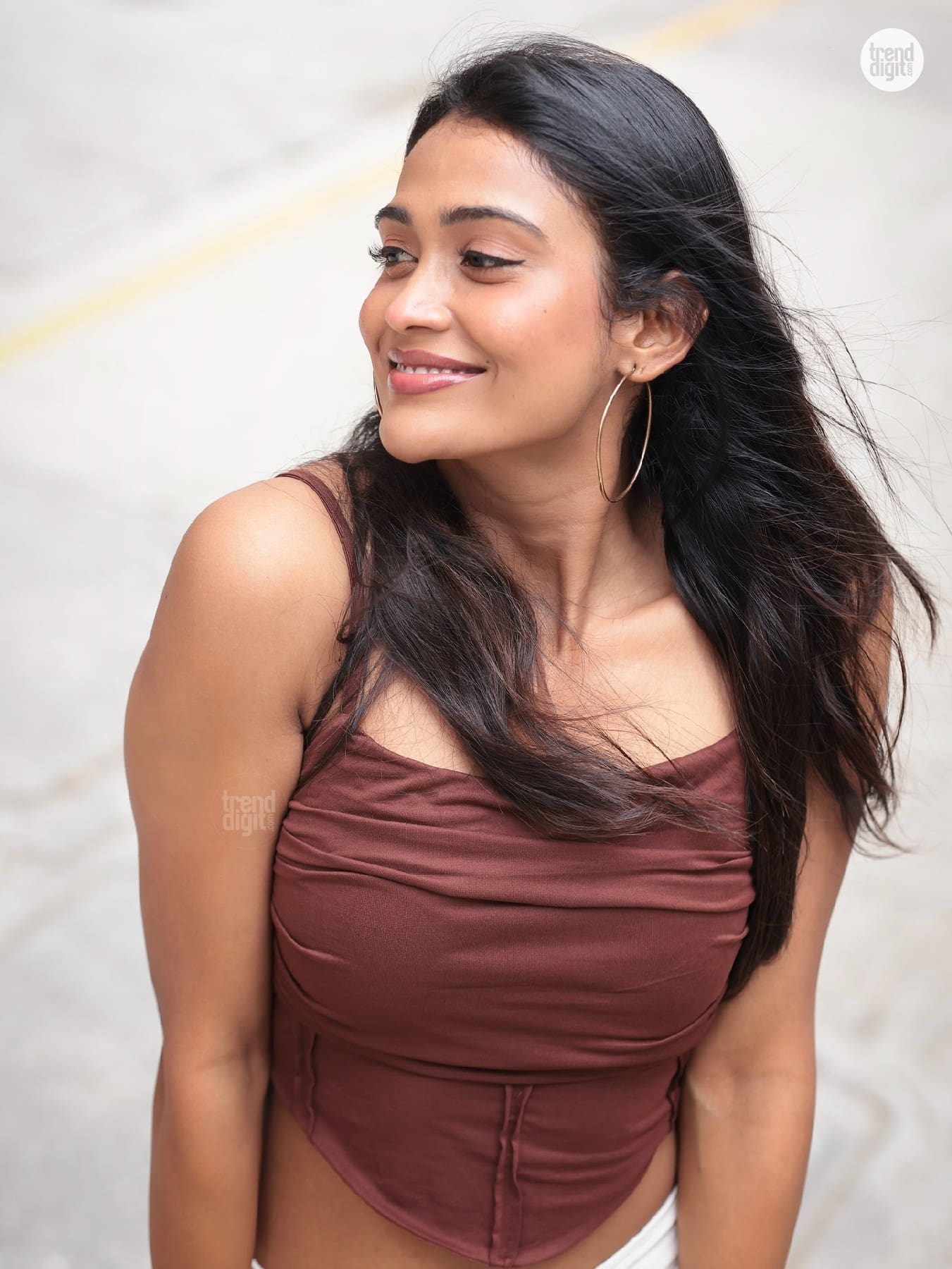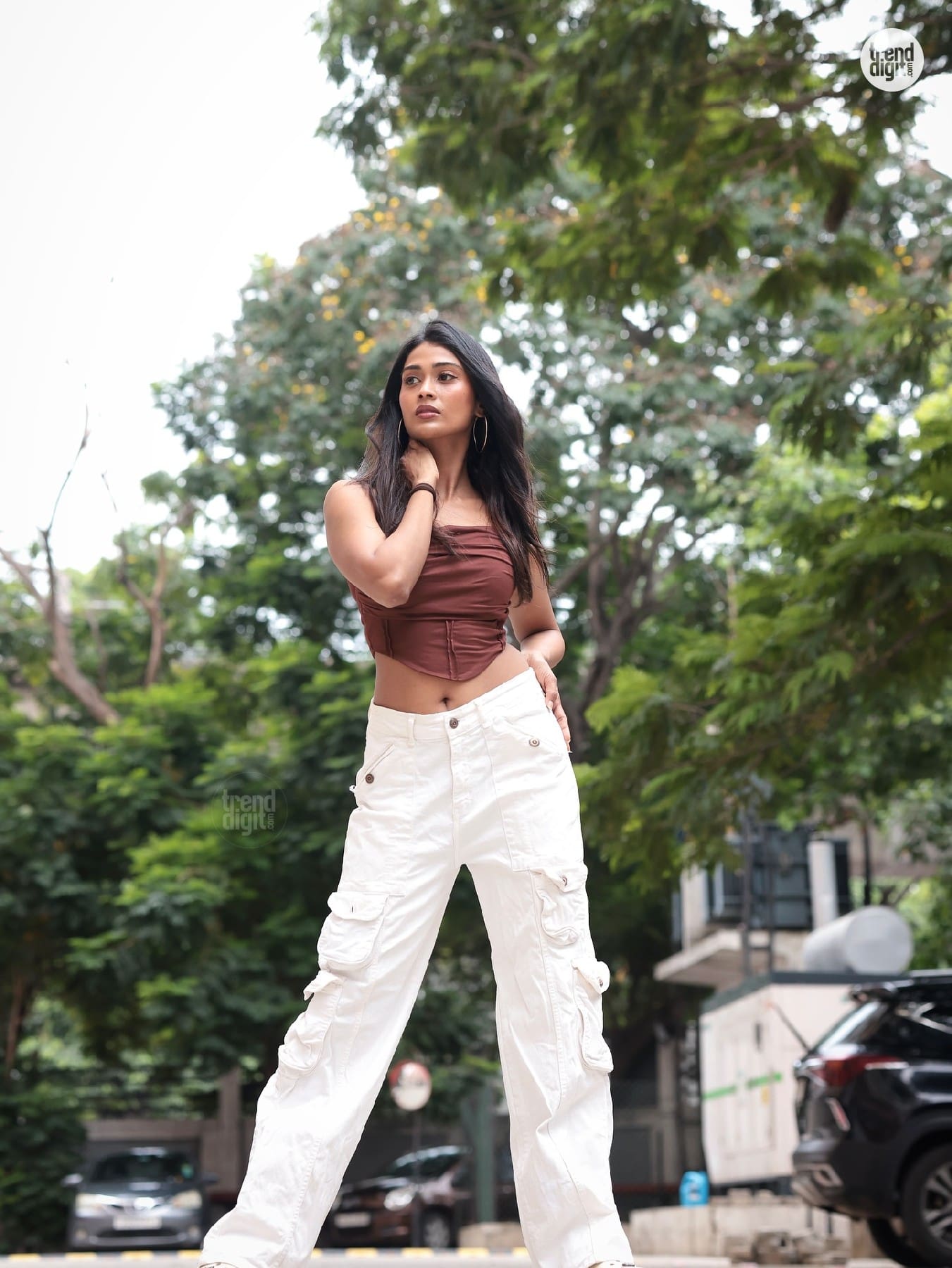 Poornima Ravi presents a modern street-style ensemble featuring a structured brown corset top styled with white cargo pants. The photoshoot takes place outdoors in a residential urban setting with greenery in the background.