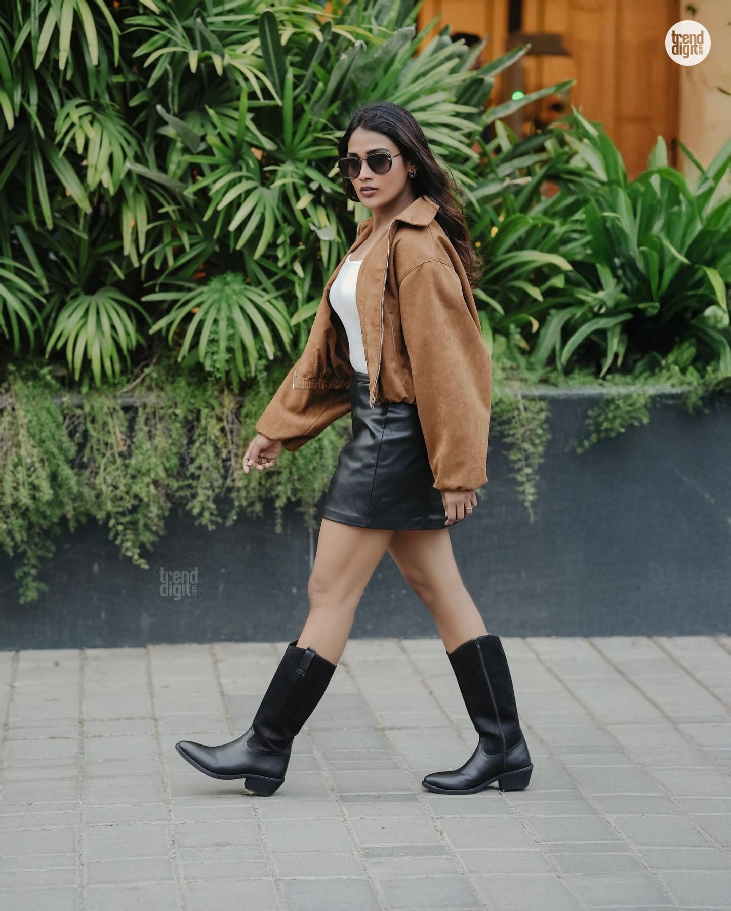 The outfit includes a fitted white top layered under a cropped brown jacket, complemented by a black leather mini skirt. Knee-high black boots add structure and elevate the street-style aesthetic. Oversized sunglasses and minimal jewellery complete the look.