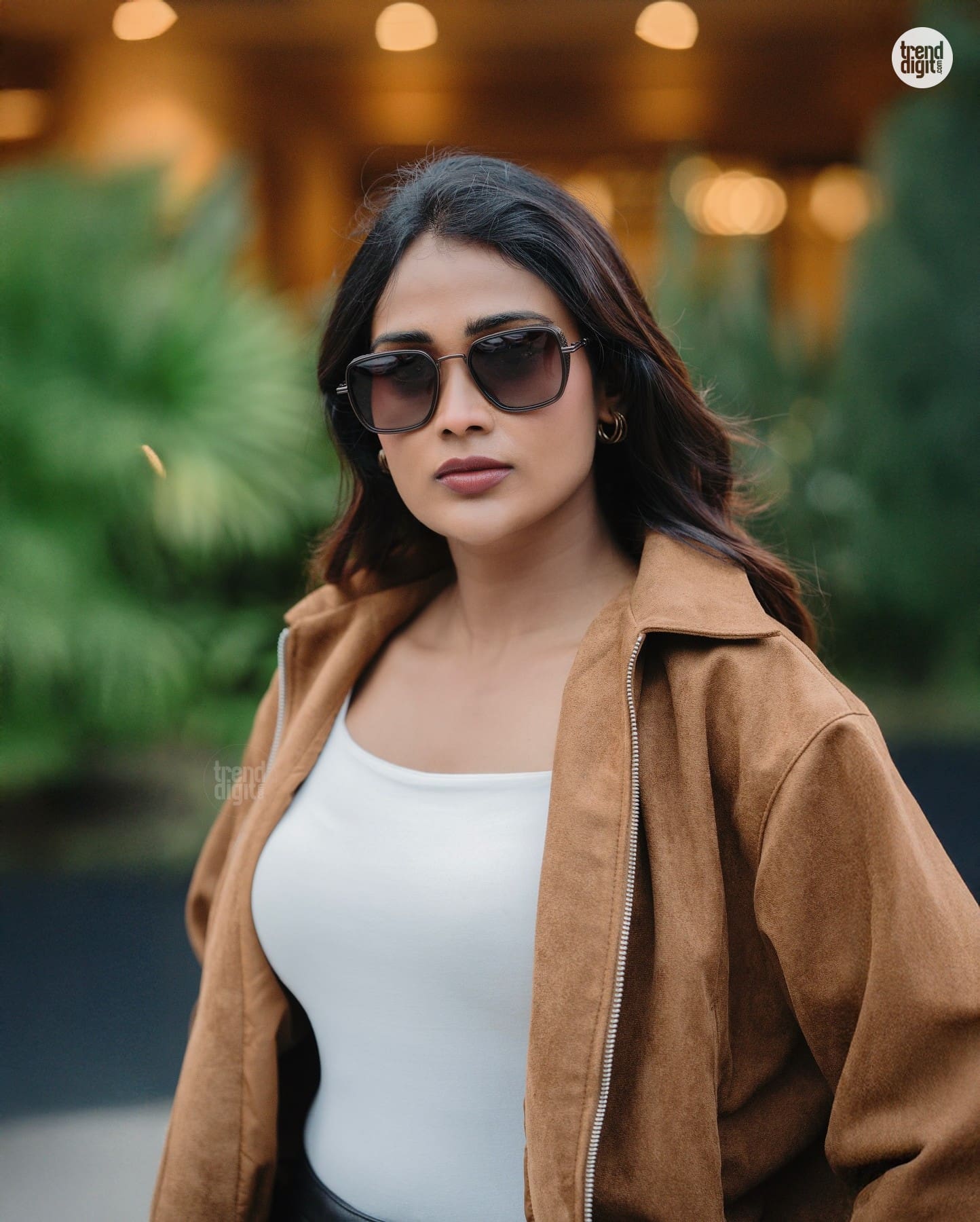 Poornima Ravi is recognized for her contemporary fashion styling and digital influence. In this outdoor photoshoot, she pairs a brown suede jacket with a black mini skirt, styled amid a vibrant green landscape that contrasts the earthy tones of the outfit.
