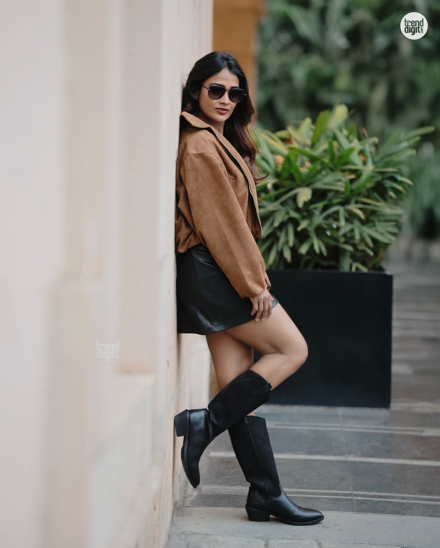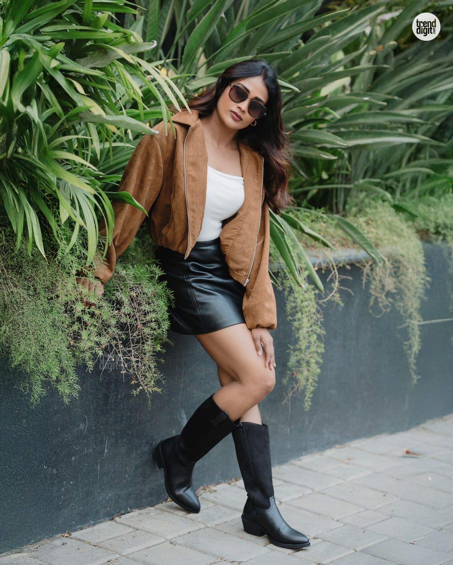 Poornima Ravi styles a brown suede jacket with a black mini skirt and boots, creating a bold urban fashion look against a lush green backdrop.