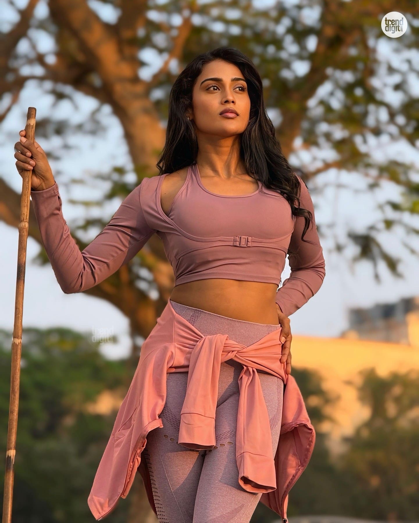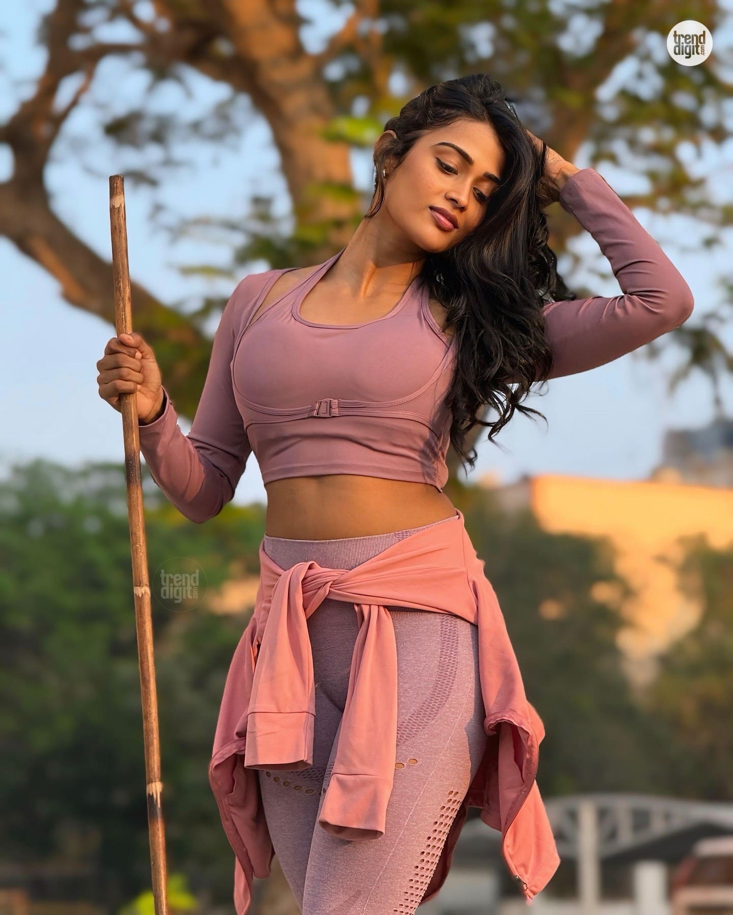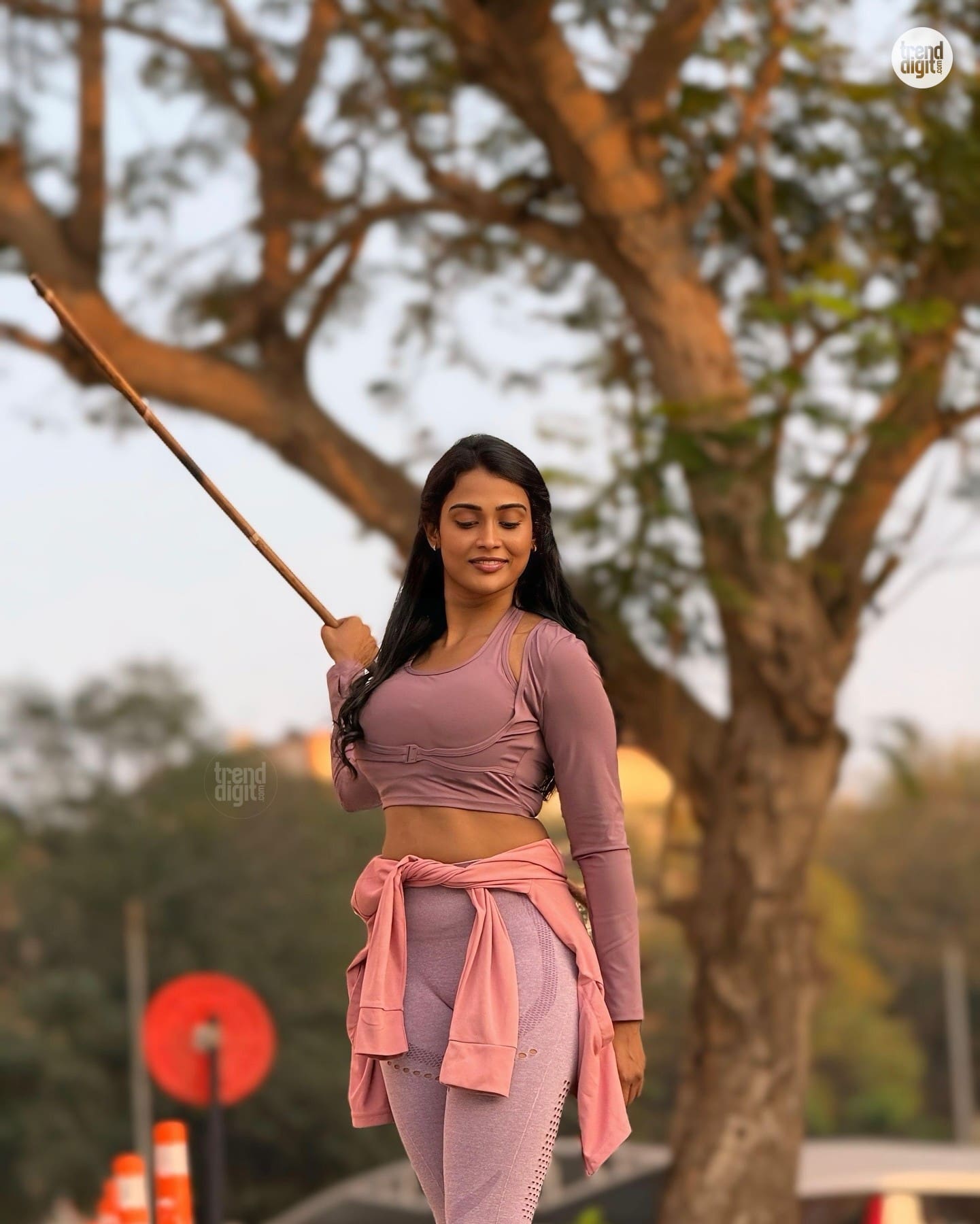 Poornima Ravi is an Indian artist and digital creator based in Tamil Nadu, known for her fashion-forward and expressive styling. This photoshoot captures her wearing a mauve sportswear set in an outdoor park setting with soft evening light and trees forming a natural backdrop. The setting emphasizes active yet styled visuals.