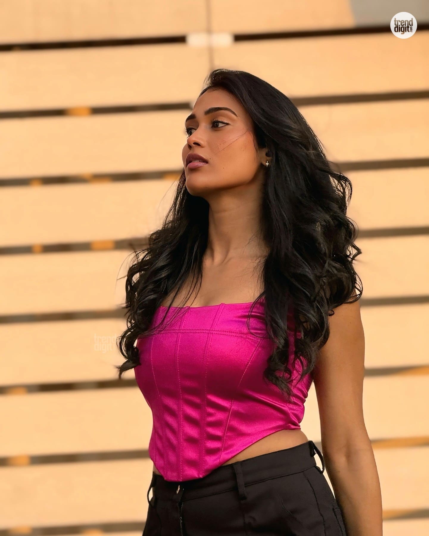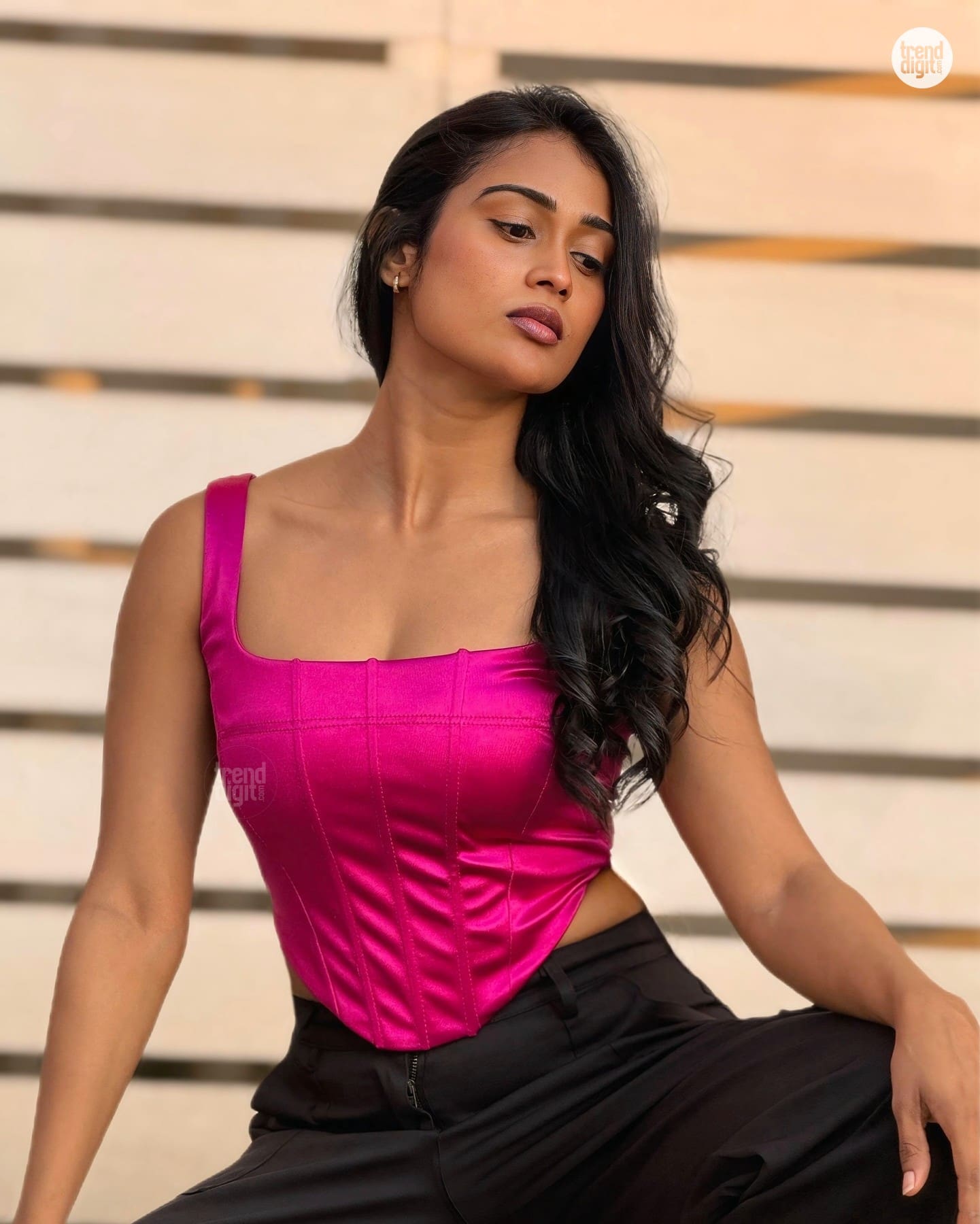 Poornima Ravi is an Indian artist and digital creator based in Tamil Nadu, known for her expressive fashion styling and strong digital presence. This photoshoot features her wearing a pink satin corset top captured outdoors against a structured architectural backdrop in warm evening light. The setting enhances the rich sheen of the fabric.