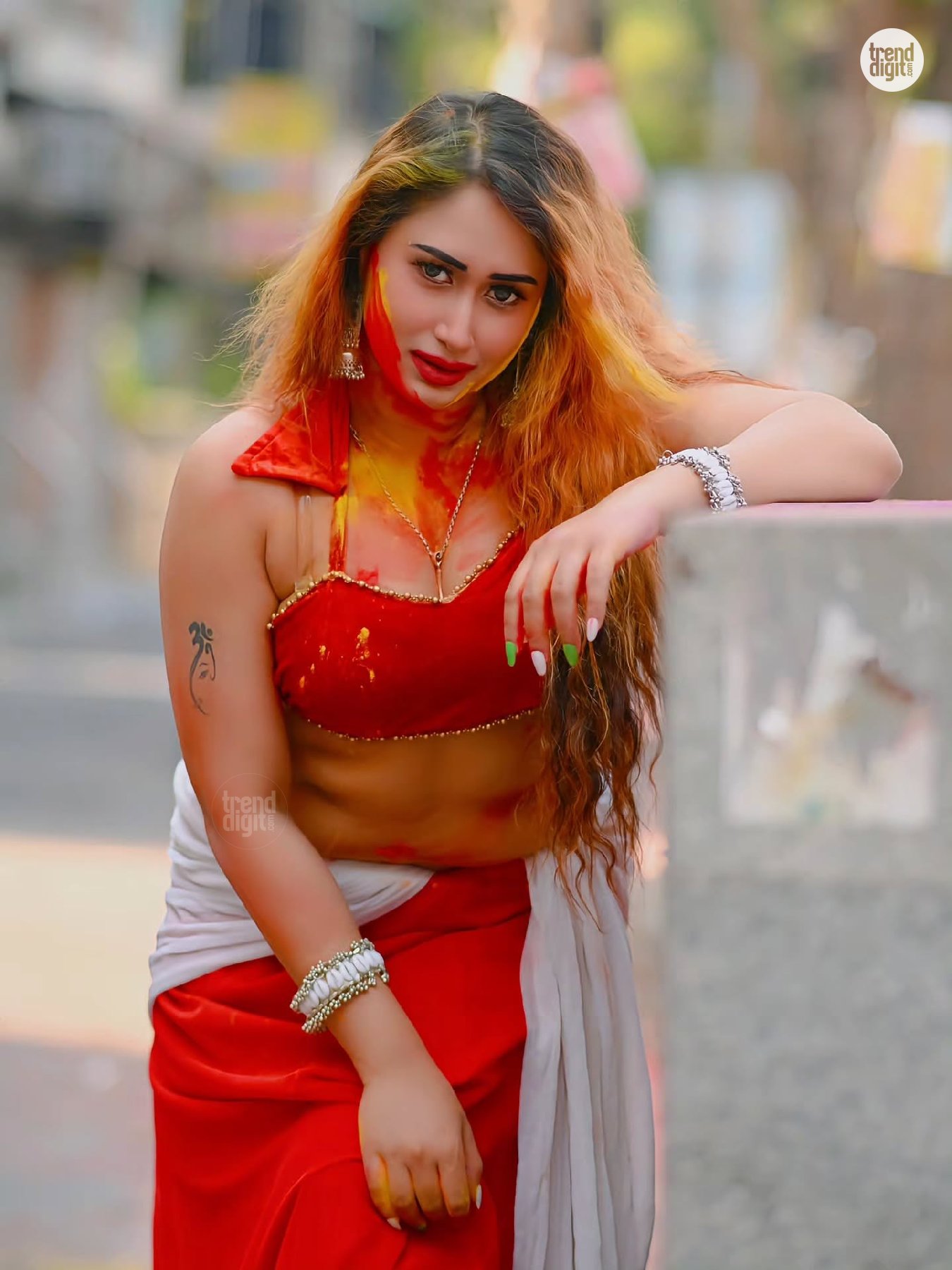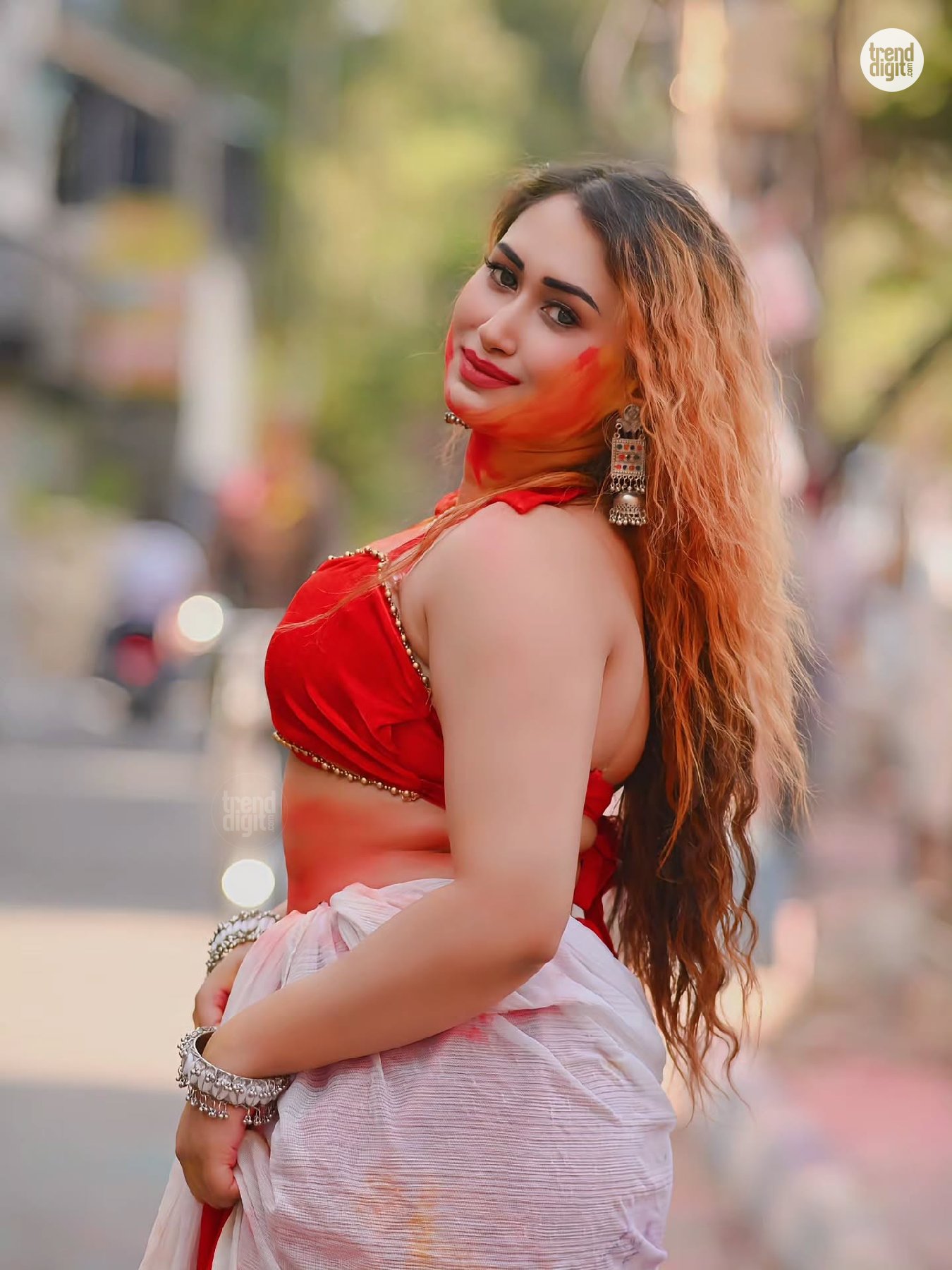 Priyanka Barnitta is an Indian web series actress and model associated with digital platforms. This photoshoot featuring Priyanka Barnitta red blouse white saree is captured outdoors on a street setting using natural light and soft background blur. The setup highlights festive elements and candid expressions.