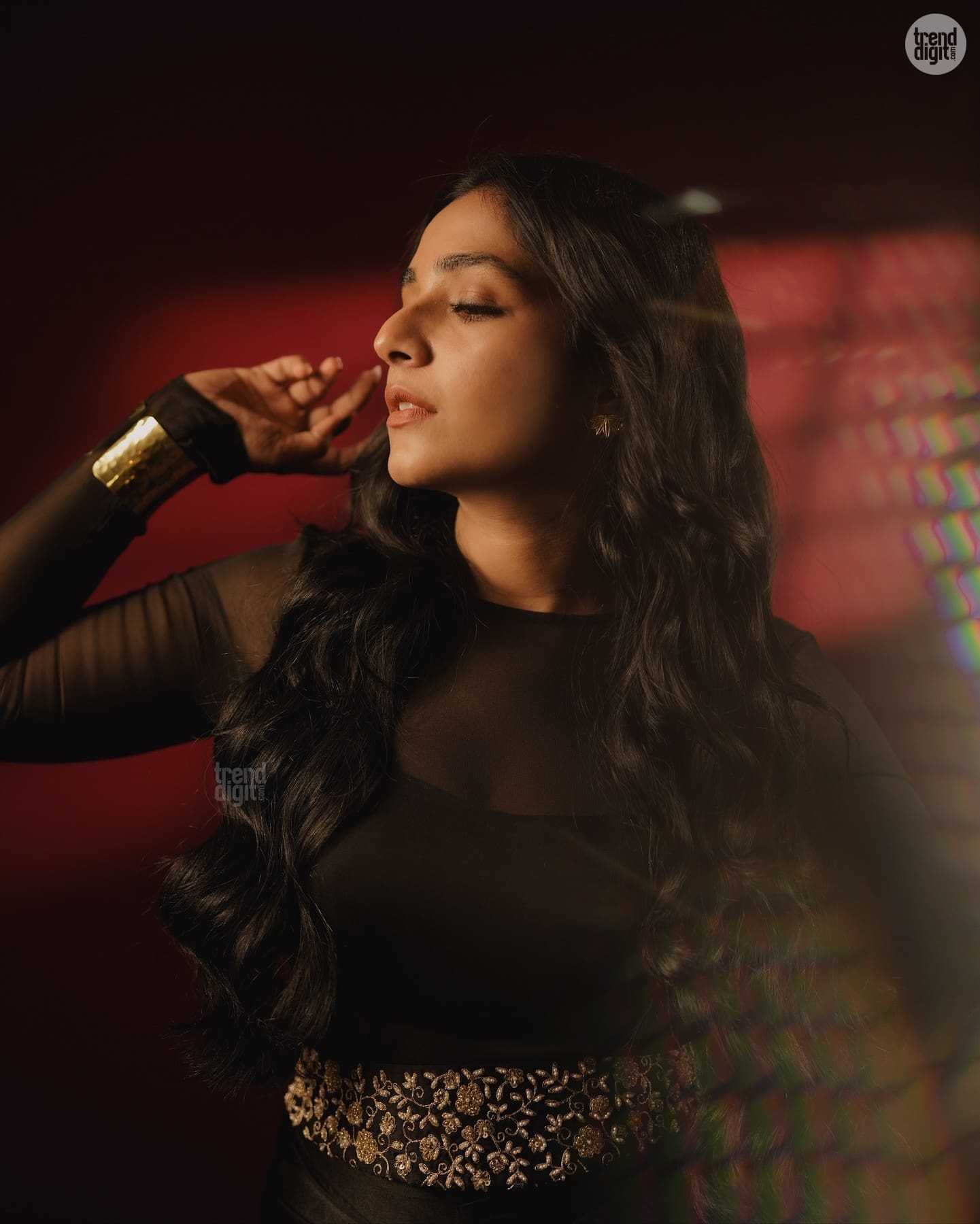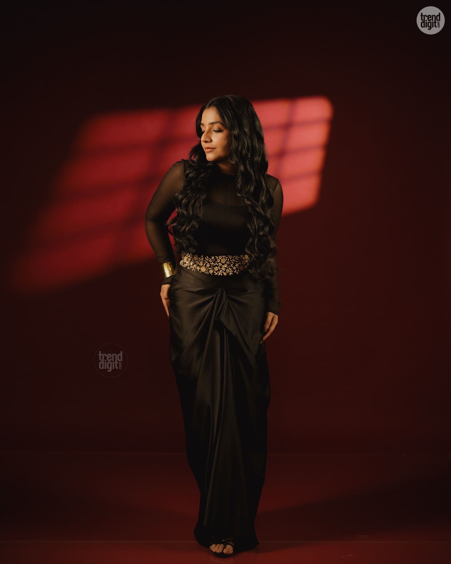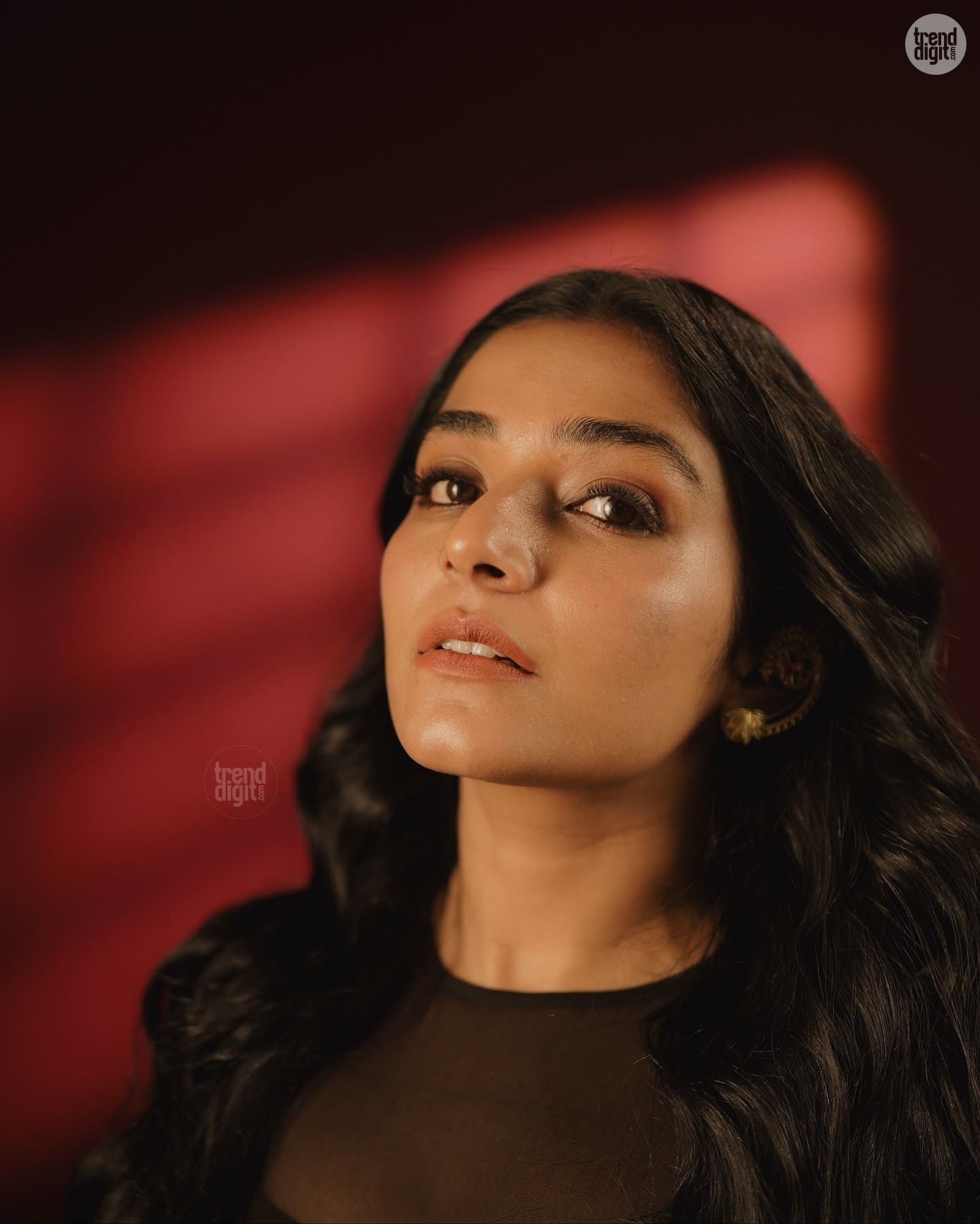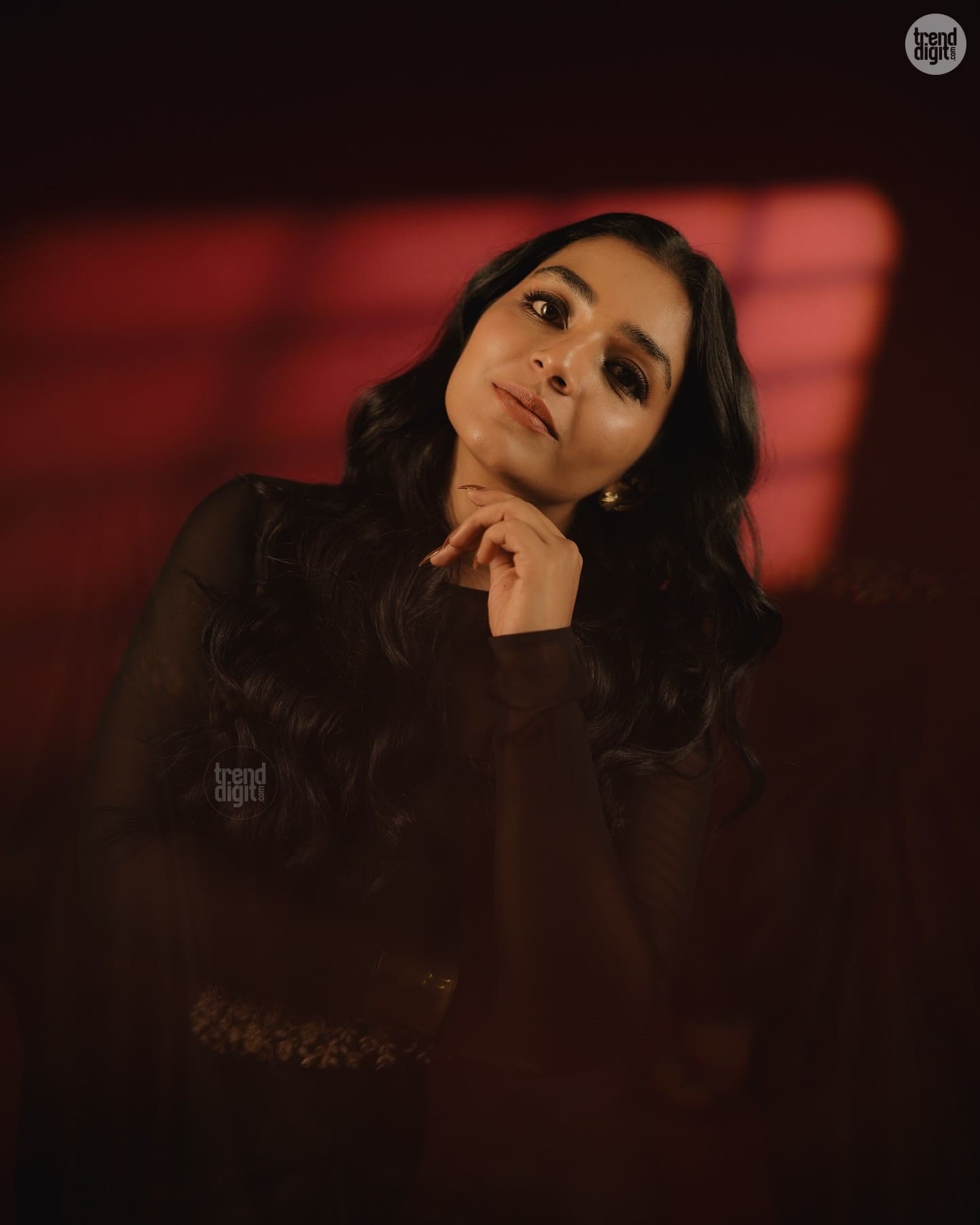 Rajisha Vijayan is an Indian actress known for her work in Malayalam and Tamil films. This studio photoshoot captures her in a black draped gown against a deep red backdrop with controlled indoor lighting. The minimalist setting enhances the structured styling and contemporary aesthetic.