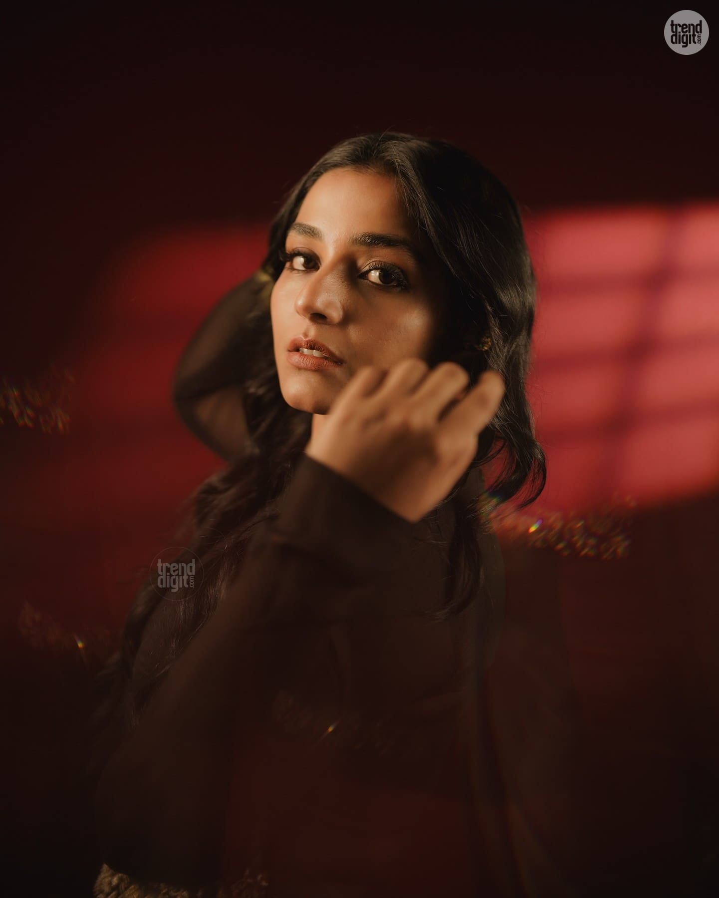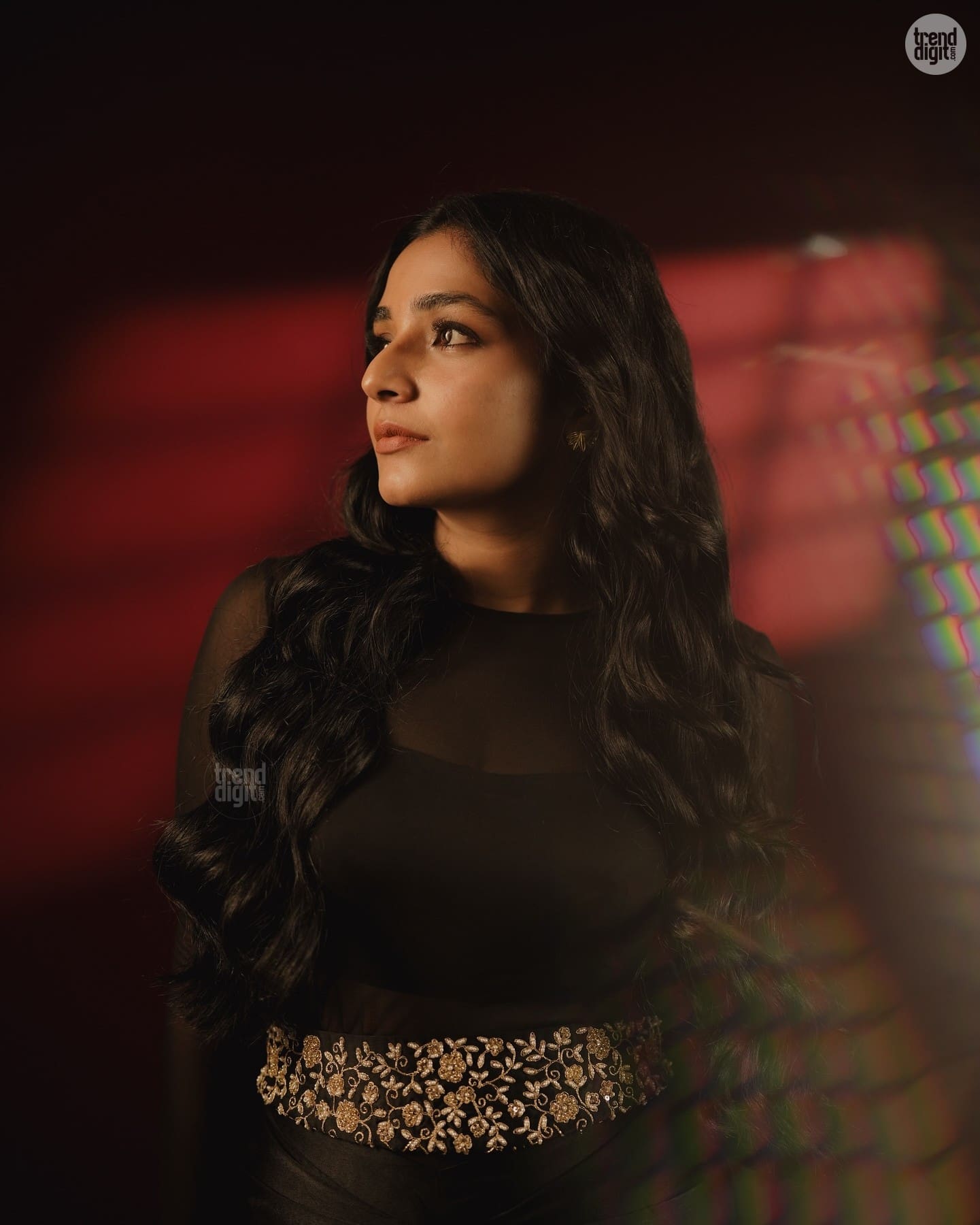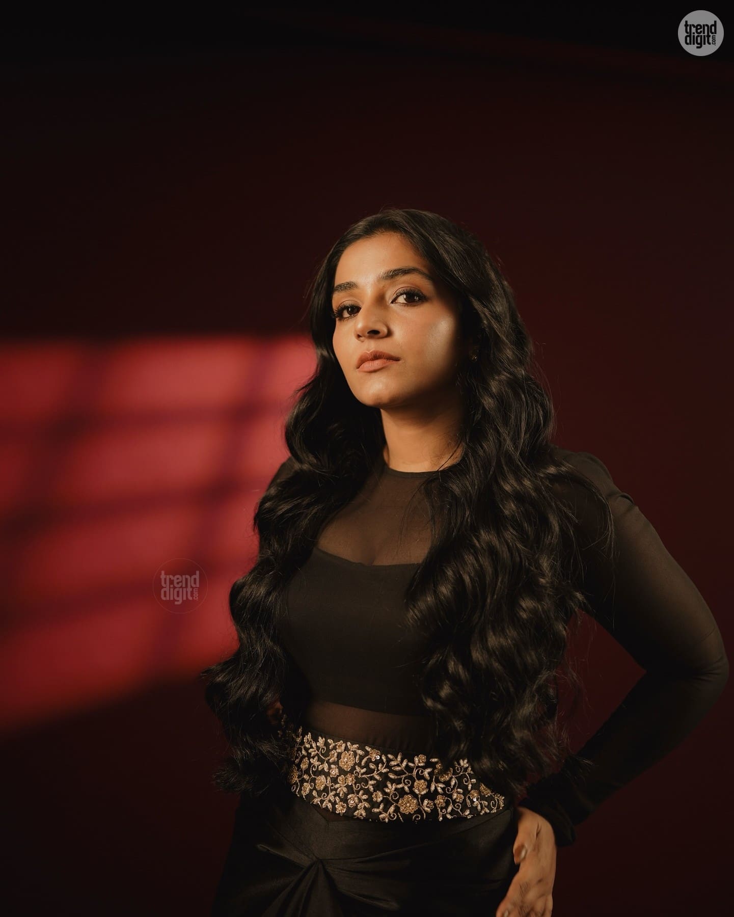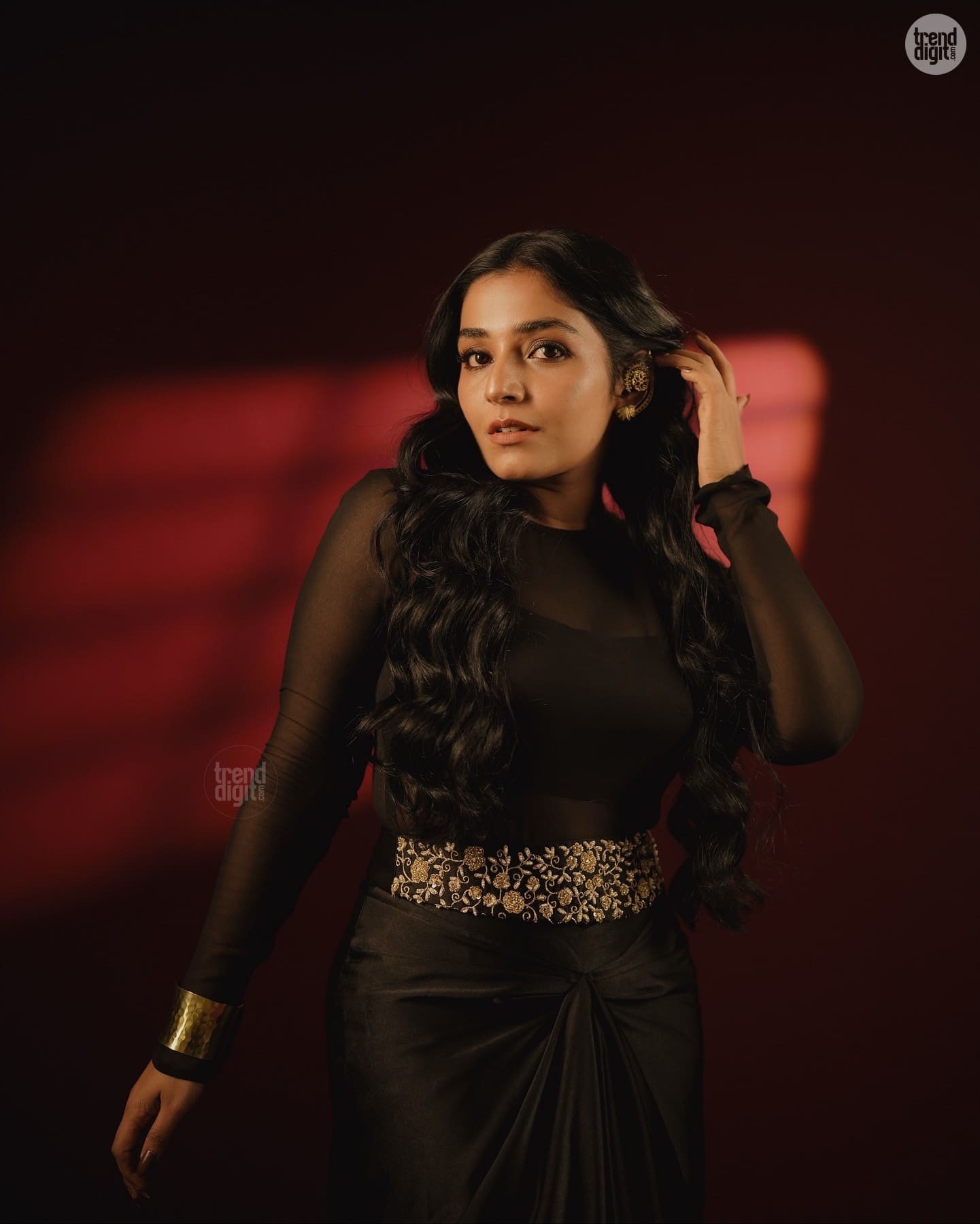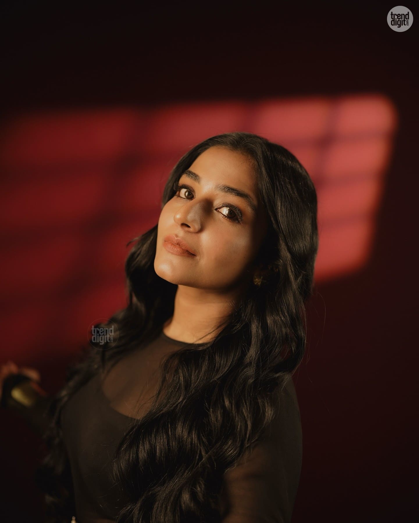 Rajisha Vijayan is an Indian actress known for her work in Malayalam and Tamil films. This studio photoshoot captures her in a black draped gown against a deep red backdrop with controlled indoor lighting. The minimalist setting enhances the structured styling and contemporary aesthetic.