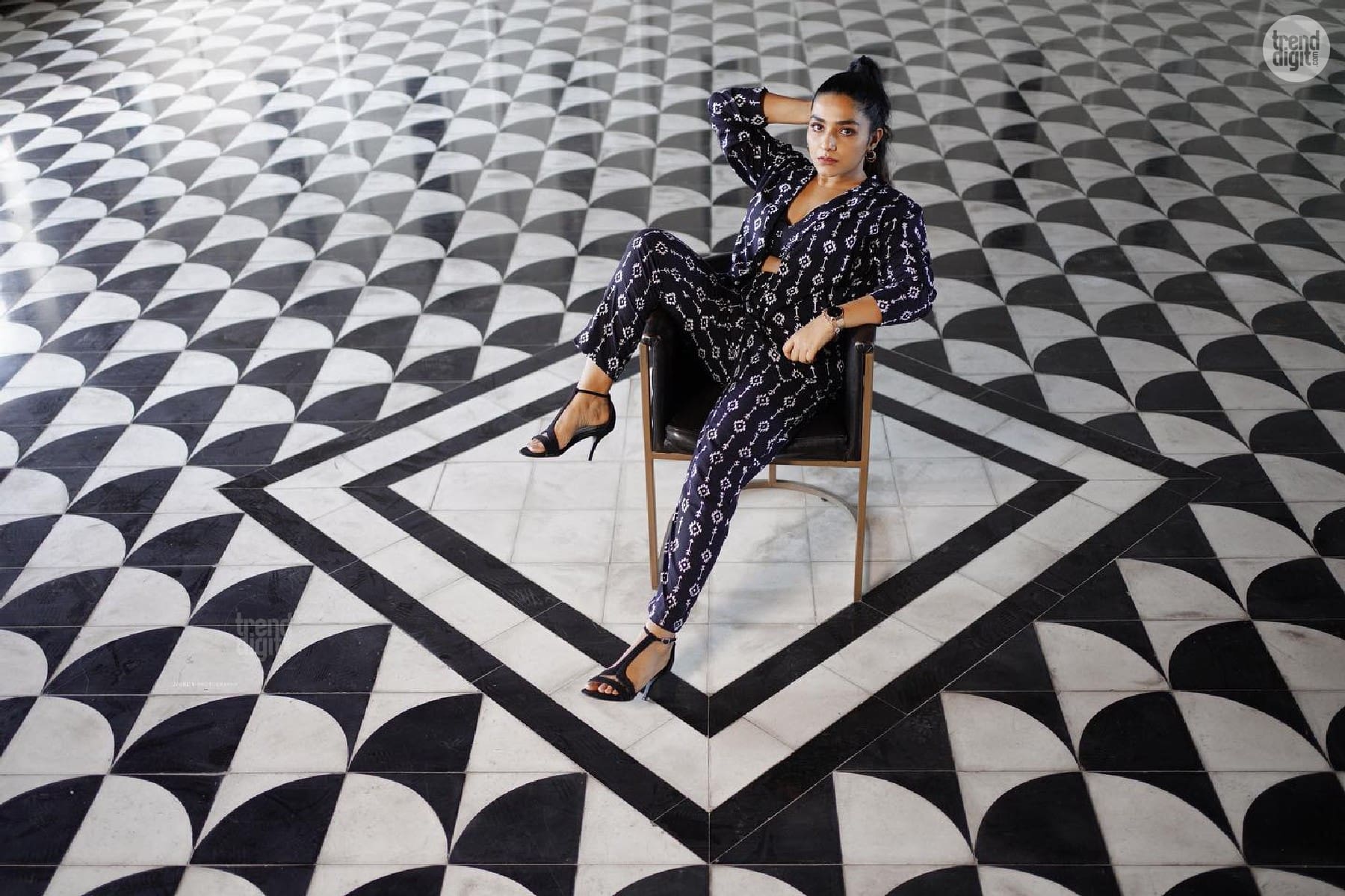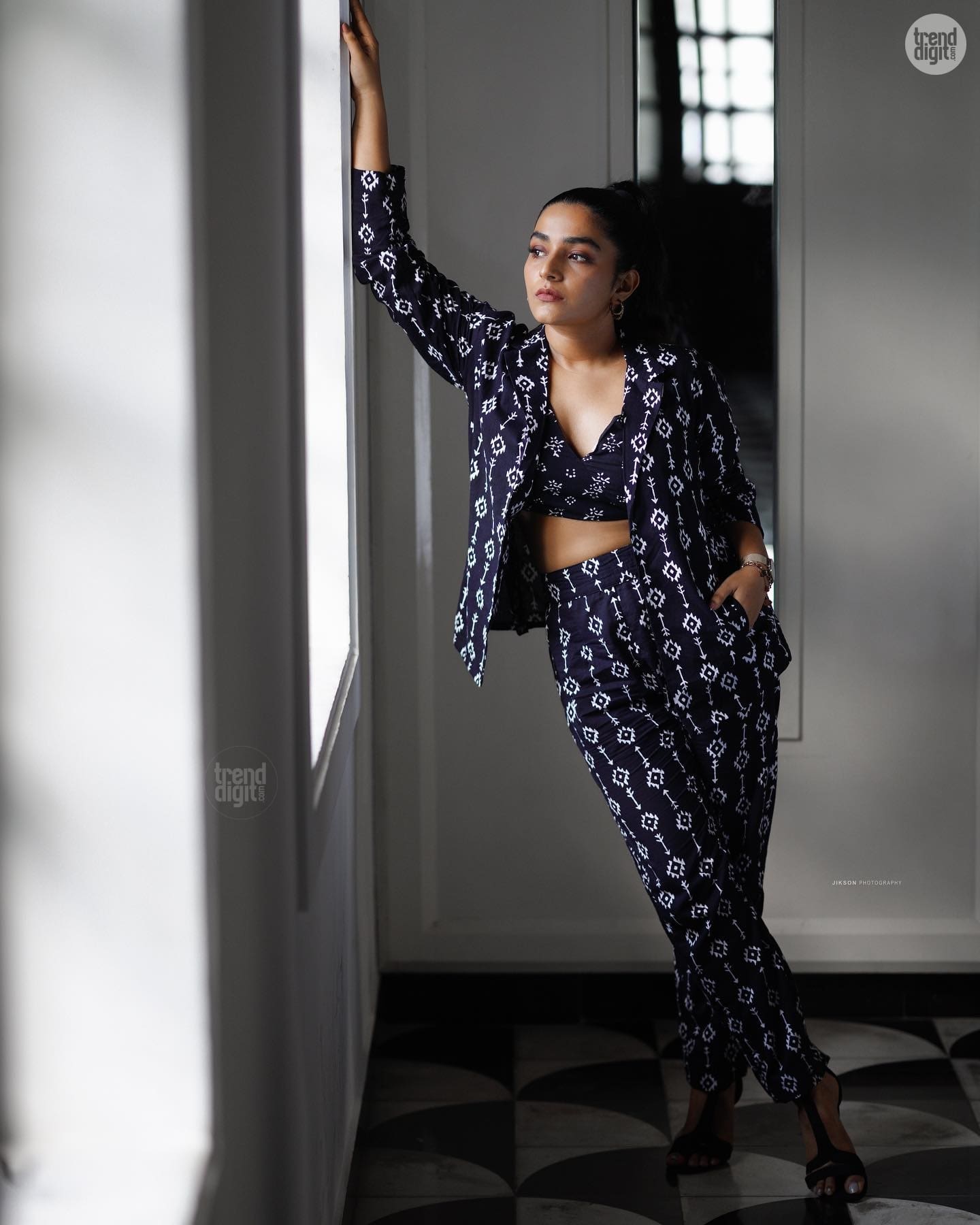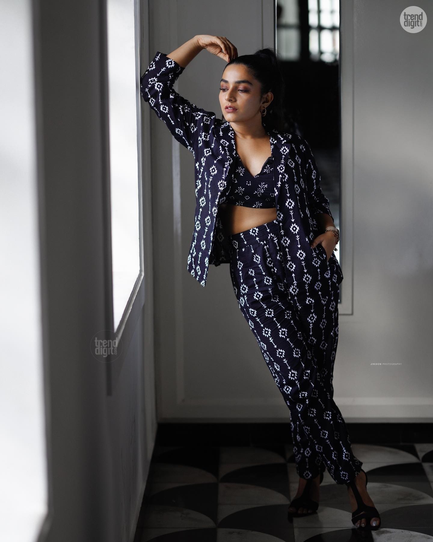 The Rajisha Vijayan Black Printed Pantsuit look stands out for its confident silhouette and balanced pattern work. The tailored structure makes it suitable for modern editorial shoots and semi-formal fashion features.