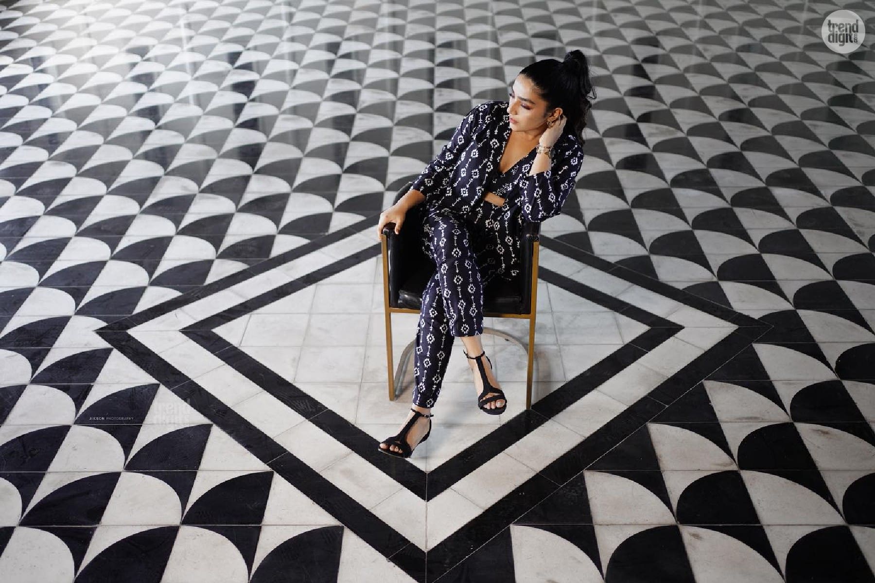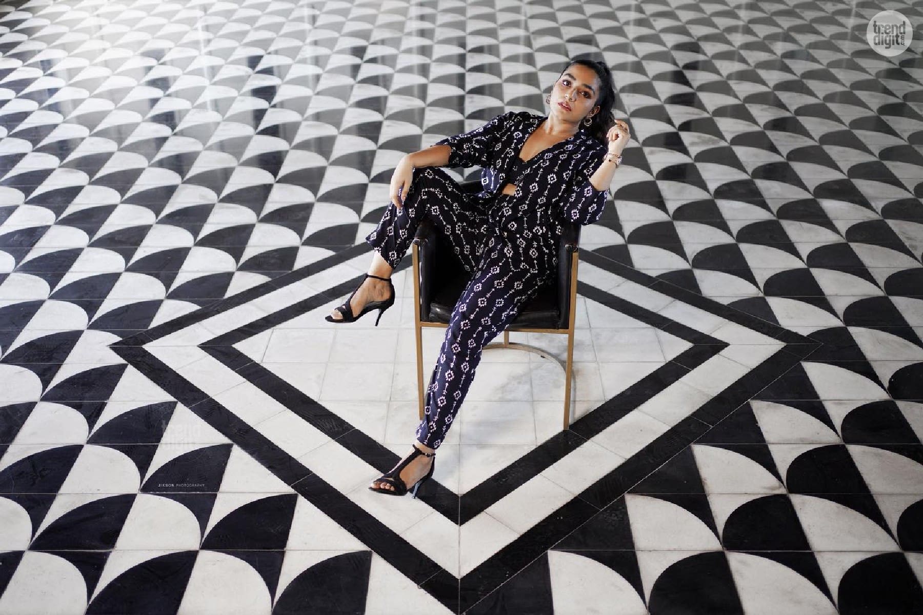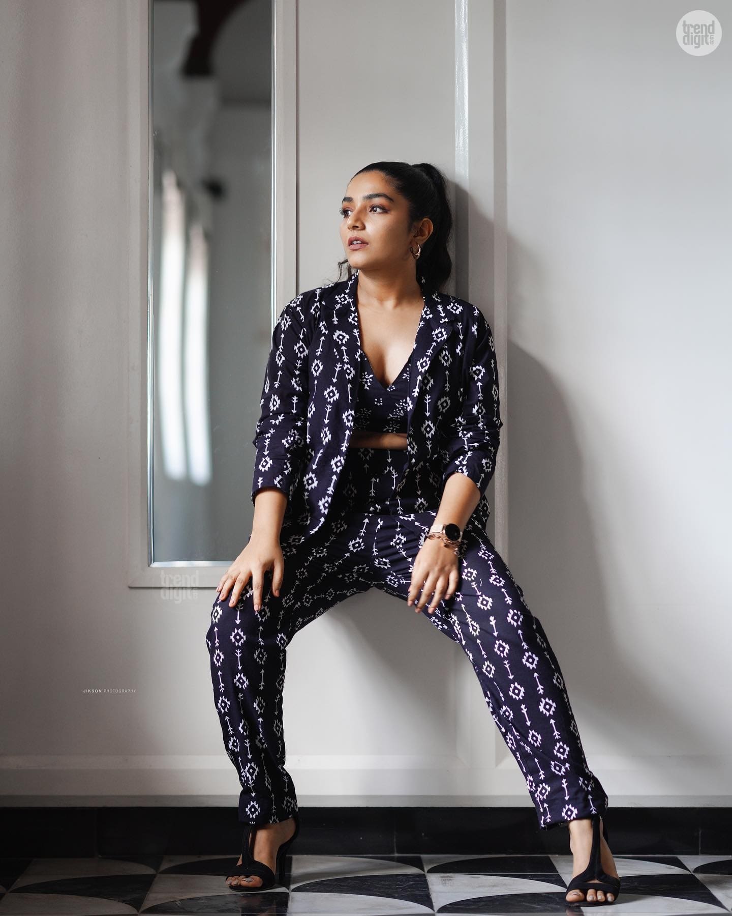 The Rajisha Vijayan Black Printed Pantsuit look stands out for its confident silhouette and balanced pattern work. The tailored structure makes it suitable for modern editorial shoots and semi-formal fashion features.